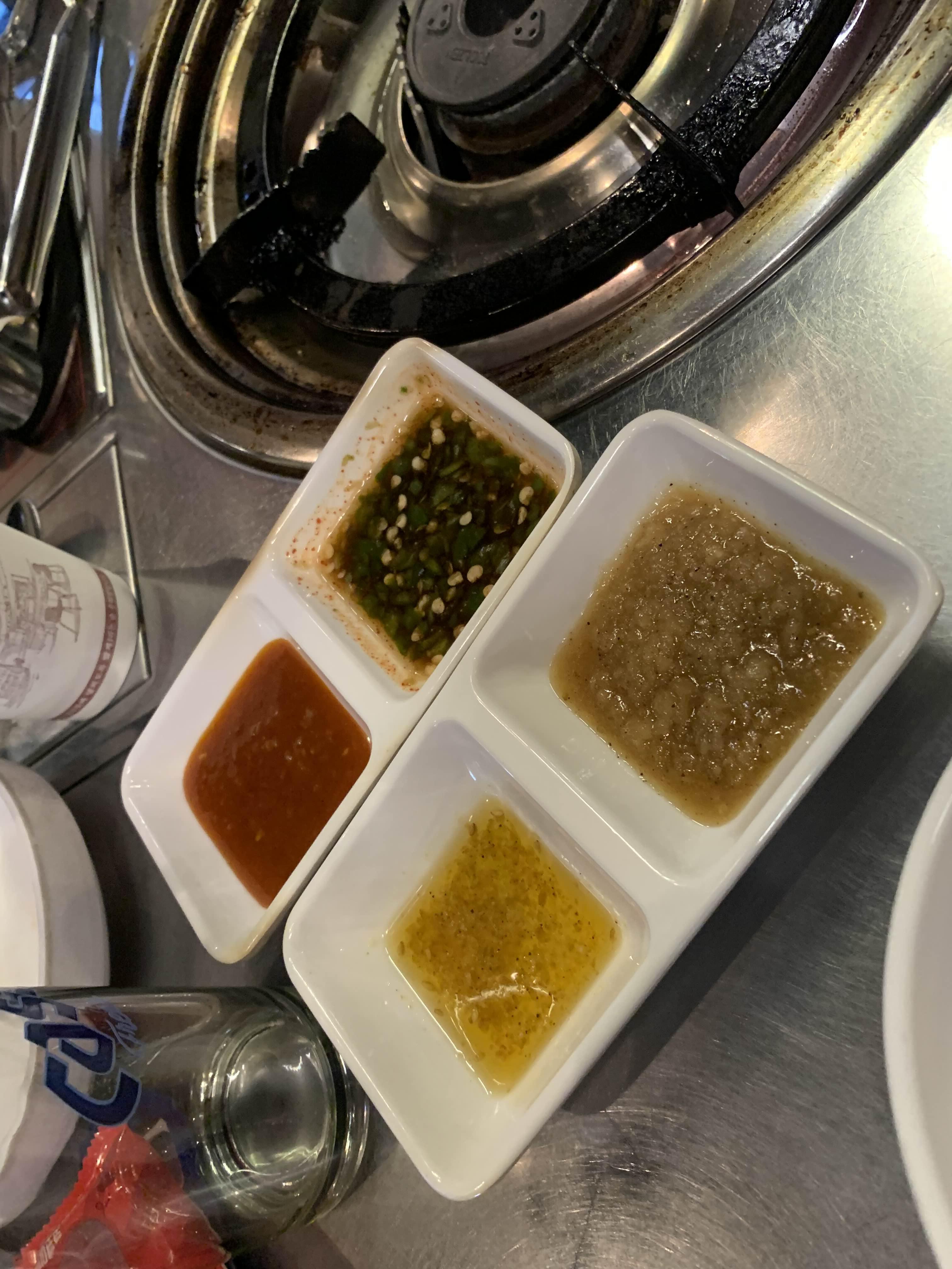 진수곱창의 4가지 소스!! 곱창을 기호에 맞추어 찍어먹을 수 있는 소스!