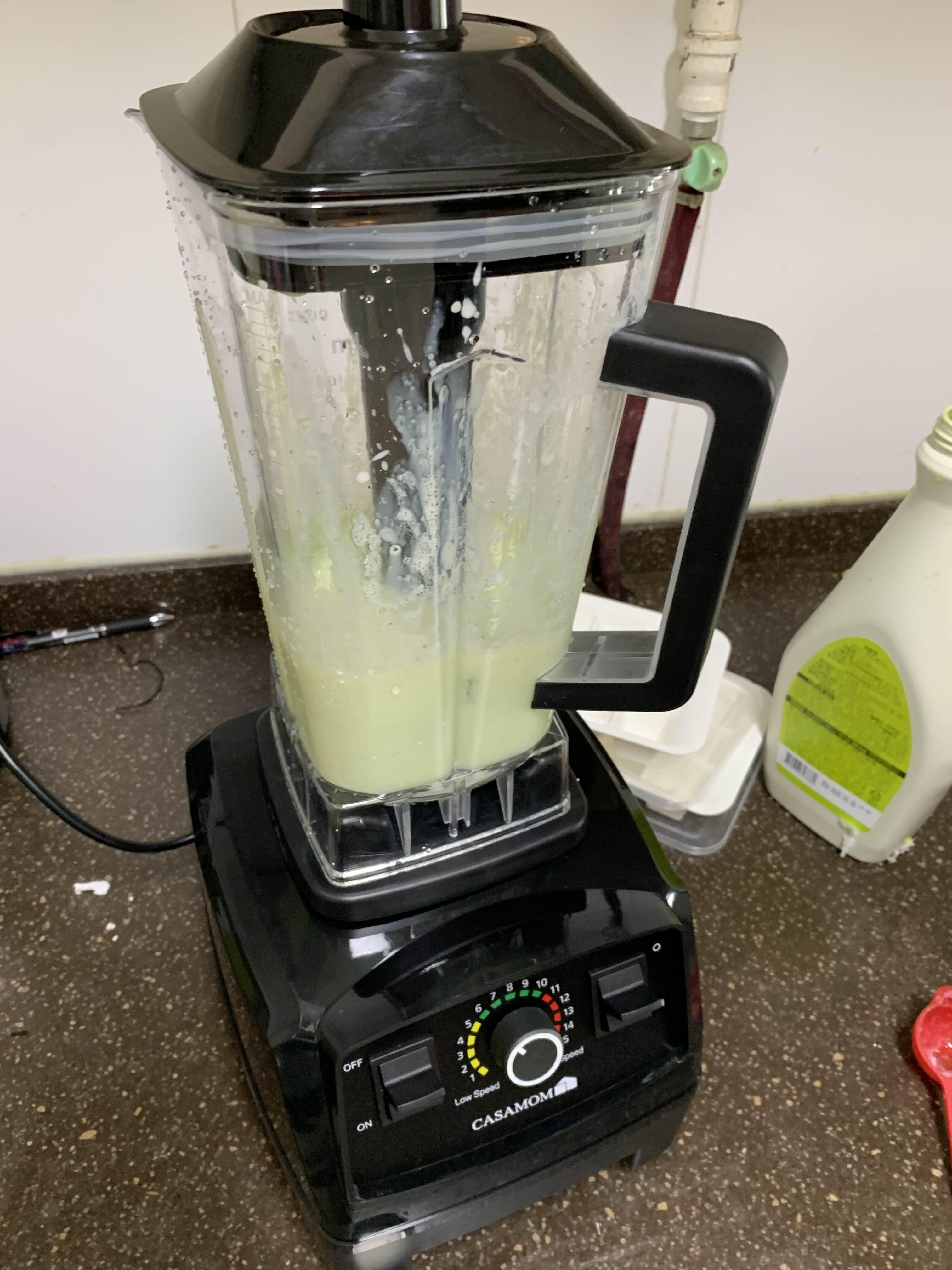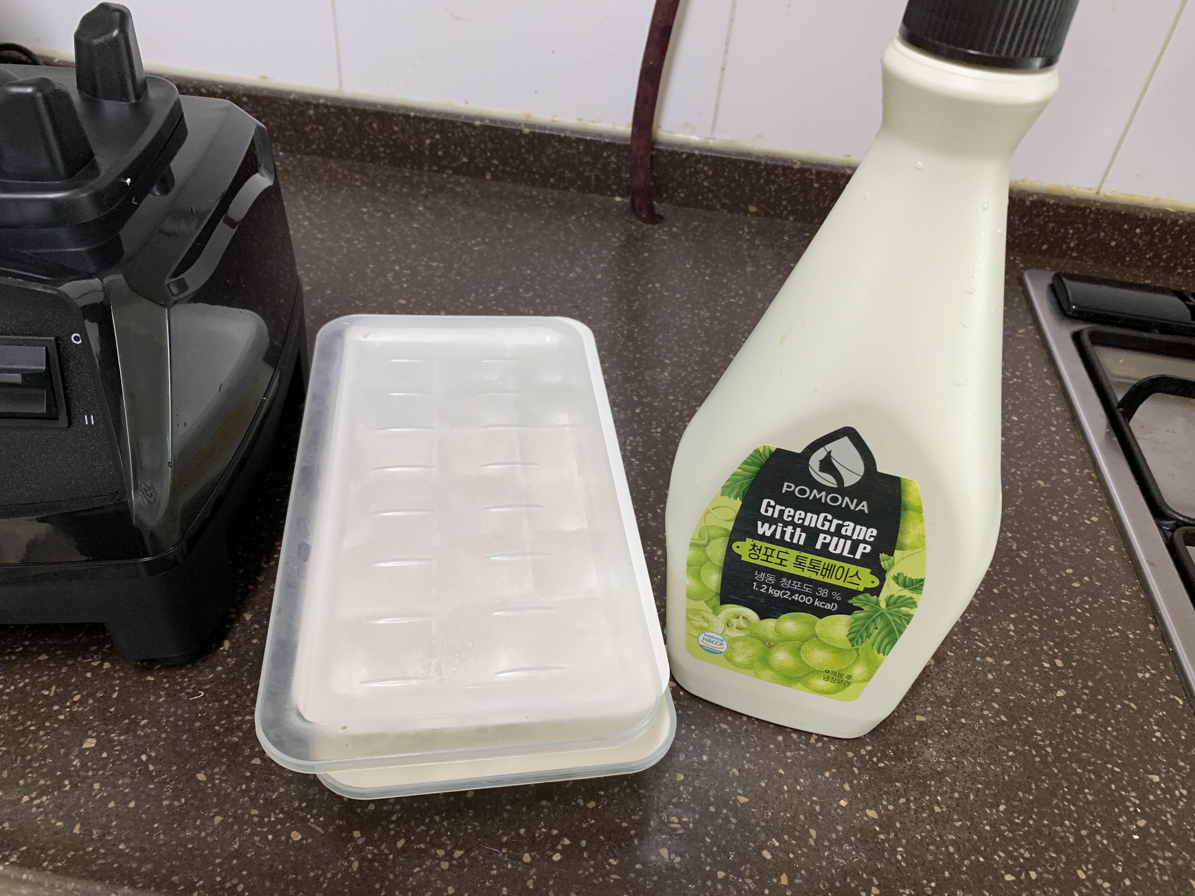 청포도 에이드 소스와 우유를 넣어주고.... 갈아본다. 냉동실에 얼렸던 얼음이라 단단하다. 잘 갈리지는 않는데...