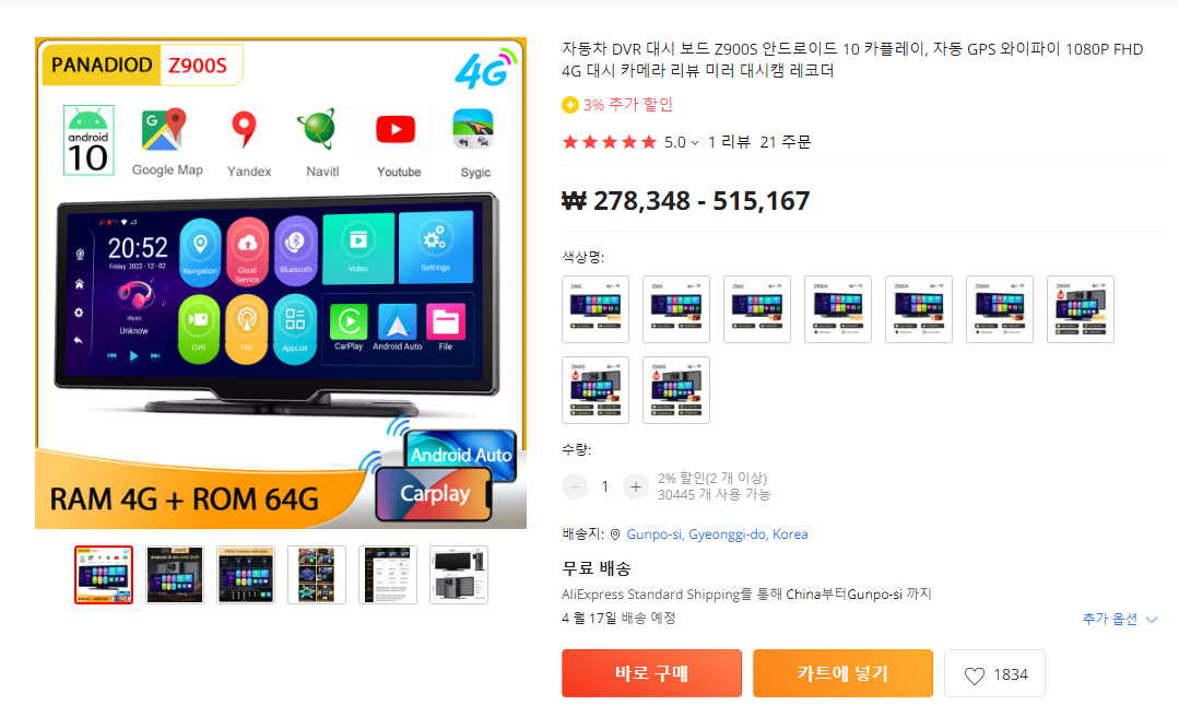알리익스프레스를 통해서 주문한 DVR 대시 보드(Z900S)로 운영체제는 안드로이드 10이 탑재되어 있었다. 그리고 후방카메라를 옵션으로 주문했다. 가격은 23만 원 정도에 주문했고, 관부가세 2만 원 정도 추가하여 대략 25~26만 원 정도 투입했다.