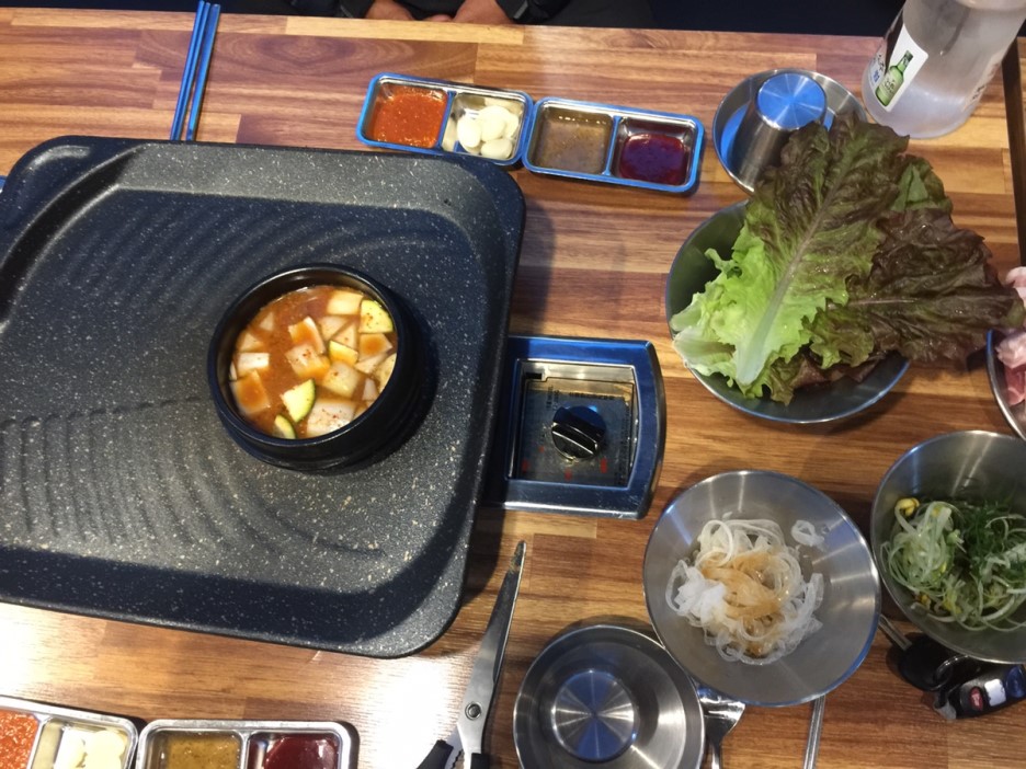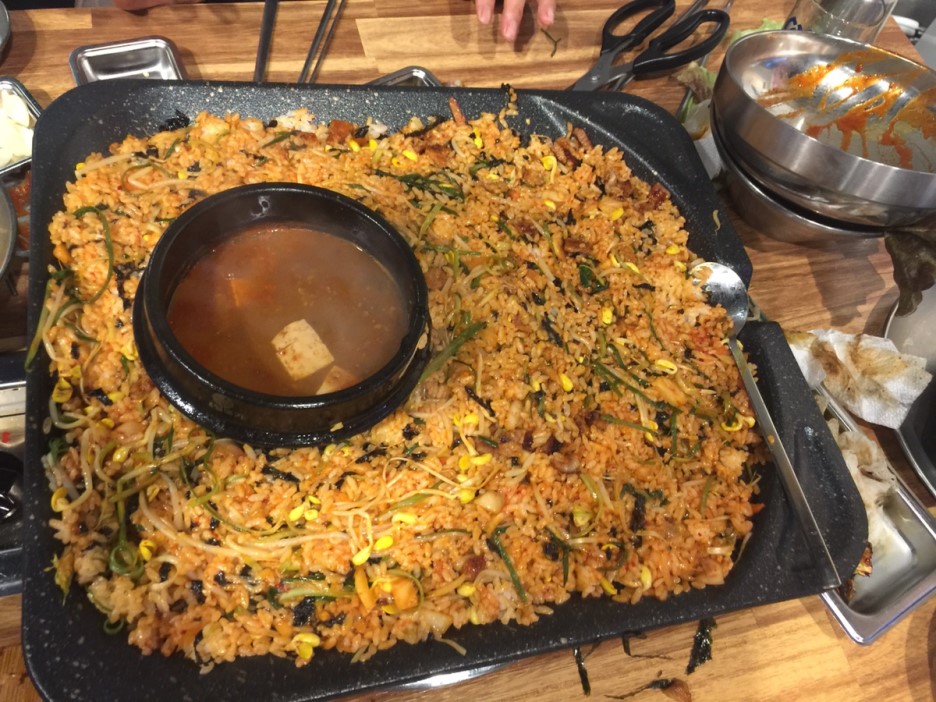 고기를 다 먹고, 남은 고기는 잘라서 볶은 밥에 넣어서 먹으니 맛나죠^^ 중간에 된장찌개 뚝배기가 옥에 티네요. 중간에 된장찌개가 없는 불판으로 바꾸었으면 좋겠네요.