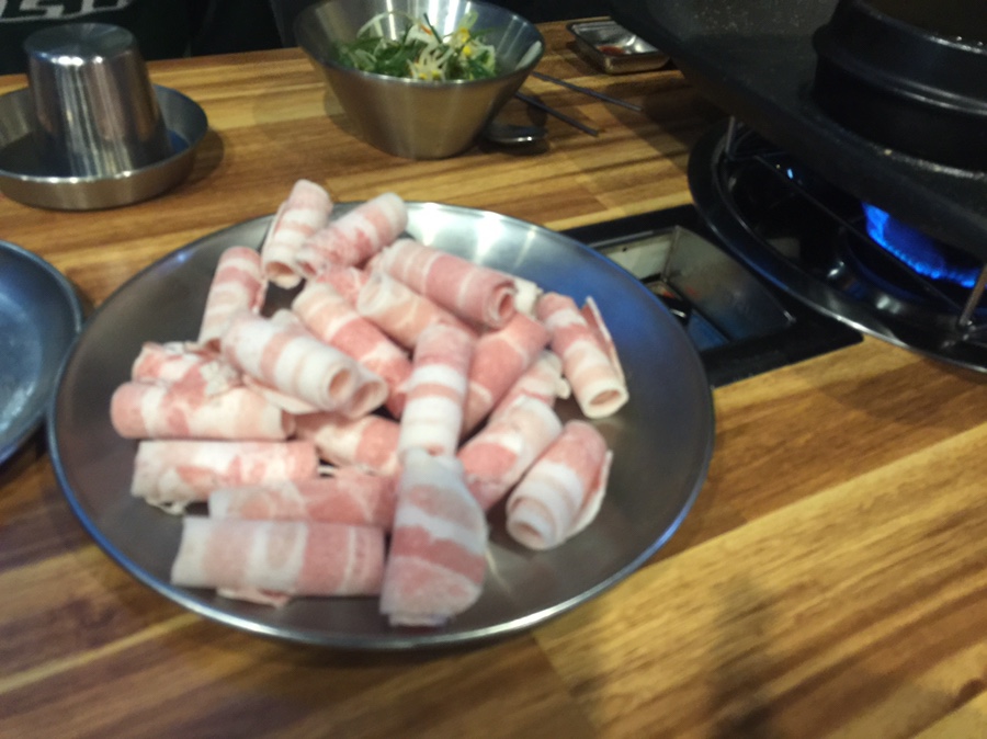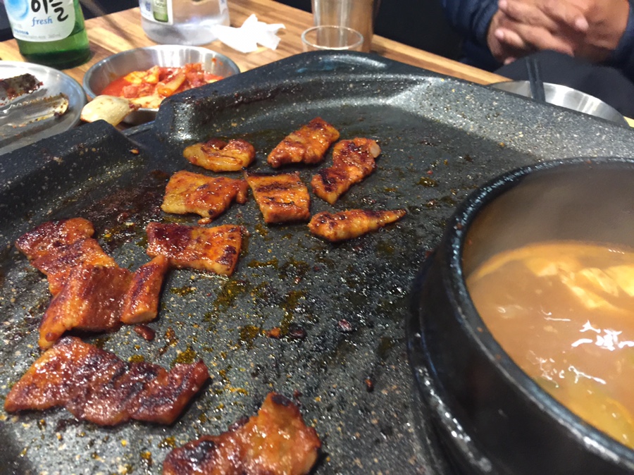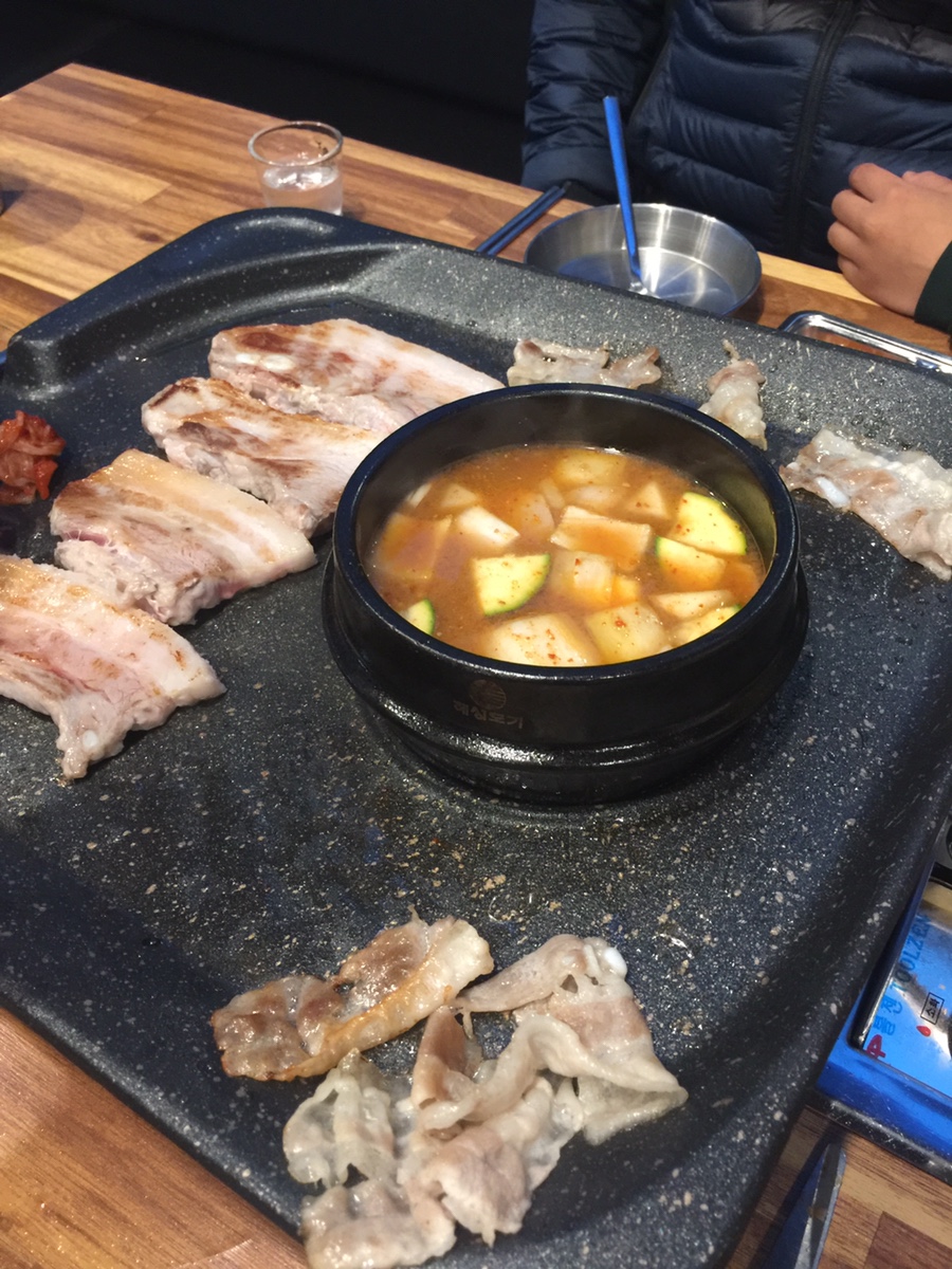 삼겹살이 익어가는 동안... 대패삼겹을 앞뒤로 살짝 식 구워 먹기 좋은 거 같습니다. 대패삼겹살이... 2인분 주문했는데.. 양이 좀 적어 보이네요. 1인분인 100g이라, 기본 4개는 주문해야 먹을만하네요. 중간에 된장찌개가 있는데... 요즘 이렇게 많이 나오는 곳이 있는데... 고기 익는 시간과 된장찌개 끊는 시간이 다르니... 된장찌개가 너무 짜지네요. 된장찌개가 뚝배기로 별도로 나오면 좋을 거 같네요.