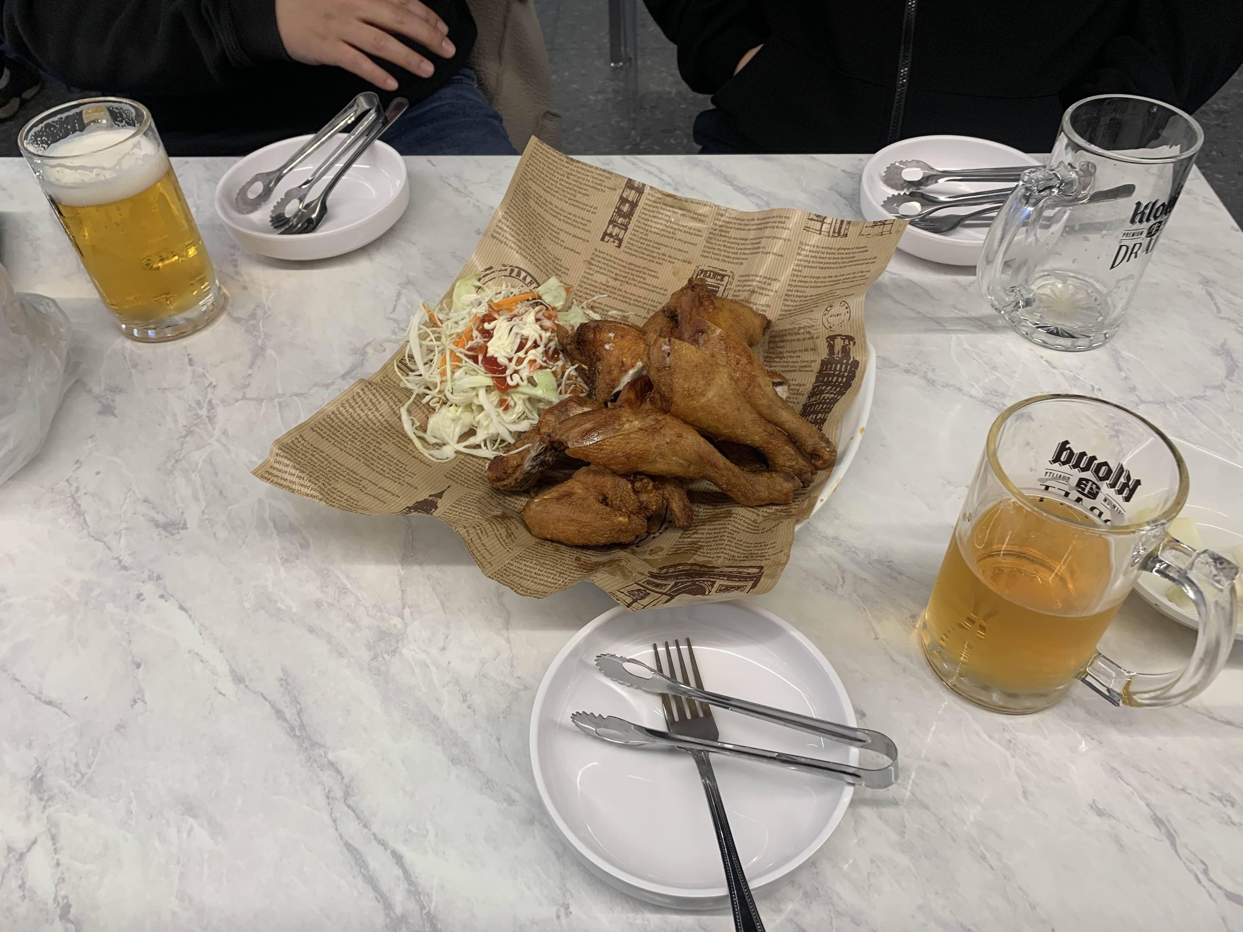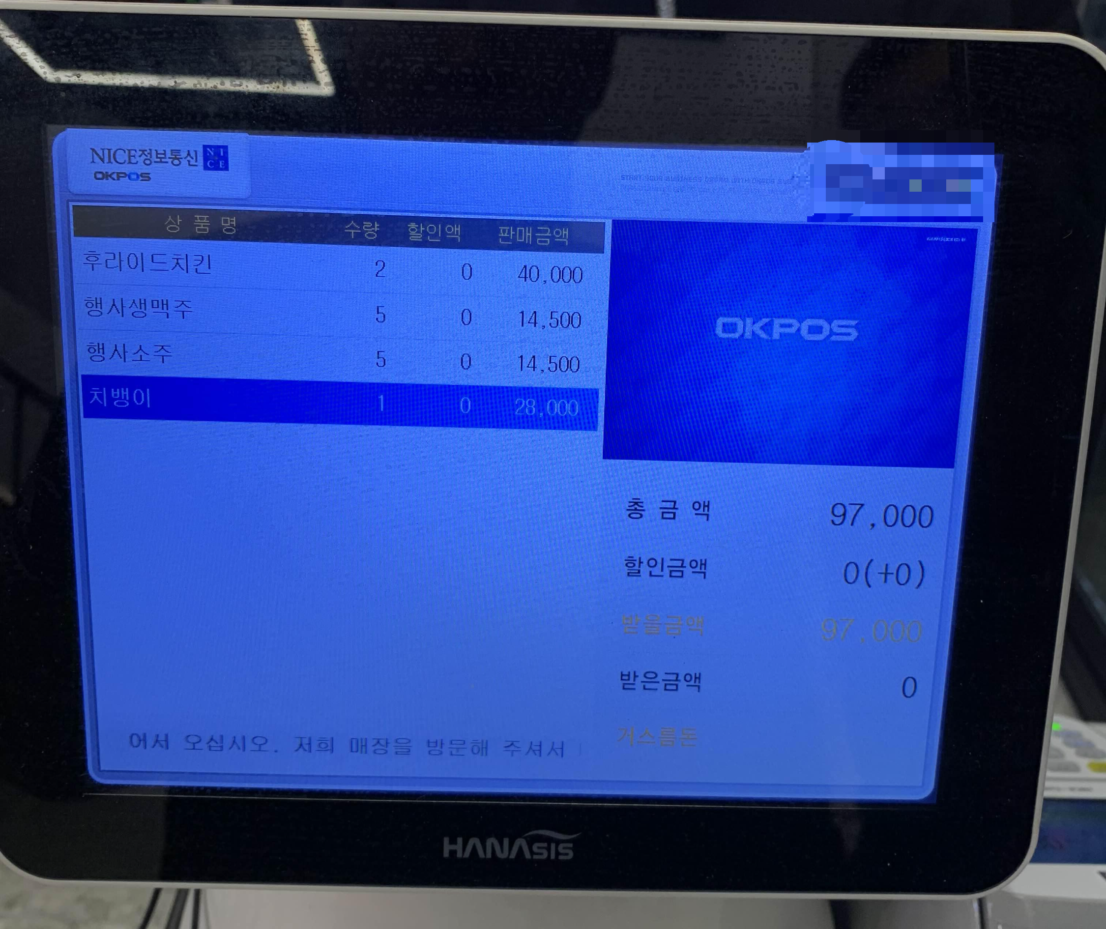 치킨이 나오기 전 맥주 한잔 원샷! 그리고 맥주를 주문해도... 주문만 받고... 맥주가 안 오더군요. 포스기에 맥주만 입력하신 듯!! 주문하지 않은 맥주 2잔이 추가되어서.... 주문수정하여 되돌리기..;;;;