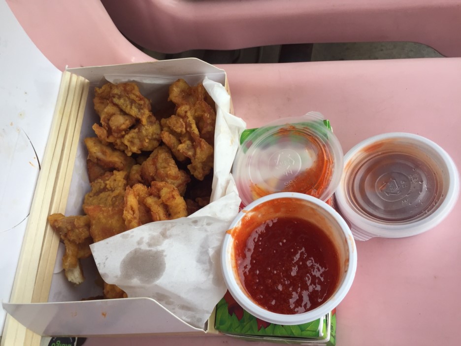 선수는 연습하는 모습을 보면서 경기장 앞에 운영하는 치킨을 먹기 시작했습니다. 치킨이.... 튀긴지 좀 되어서 좀 눅눅하고 기름일 좔좔 흘렀네요. 아이도 안 먹고, 너무 느끼해서 저도 조금만 먹고 많이 남겼네요. 소스가 좀 매콤하면 그런대로 먹을만했는데, 소스도 순한 맛이네요. 소금이라도 있었으면 짭조름하게 먹는데, 소금도 없어서... 다음에는 치킨을 사와에겠네요.