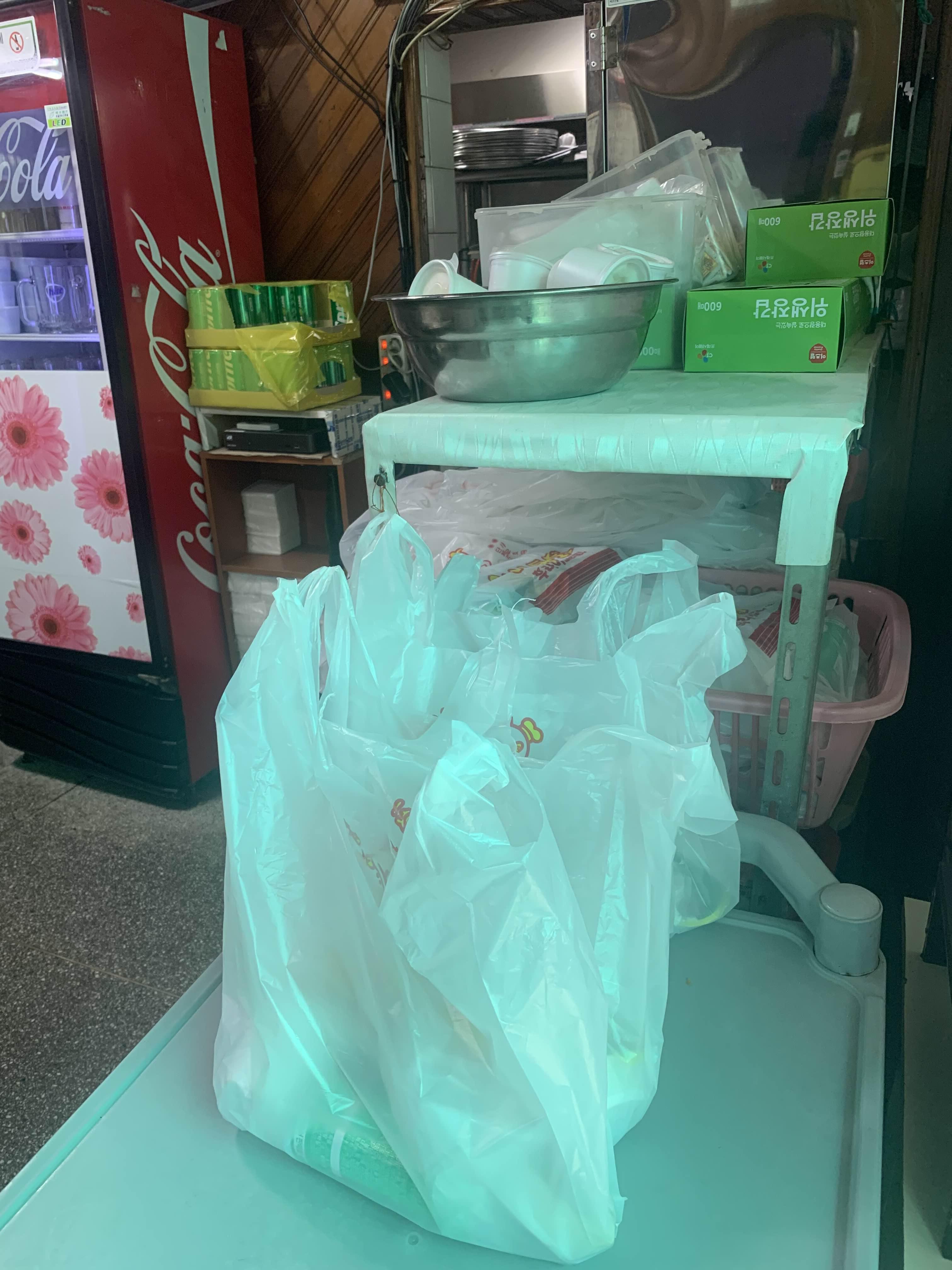 식당 입구에는 포장 손님을 위한 통닭 봉지가 쌓여있다.ㅎㅎ