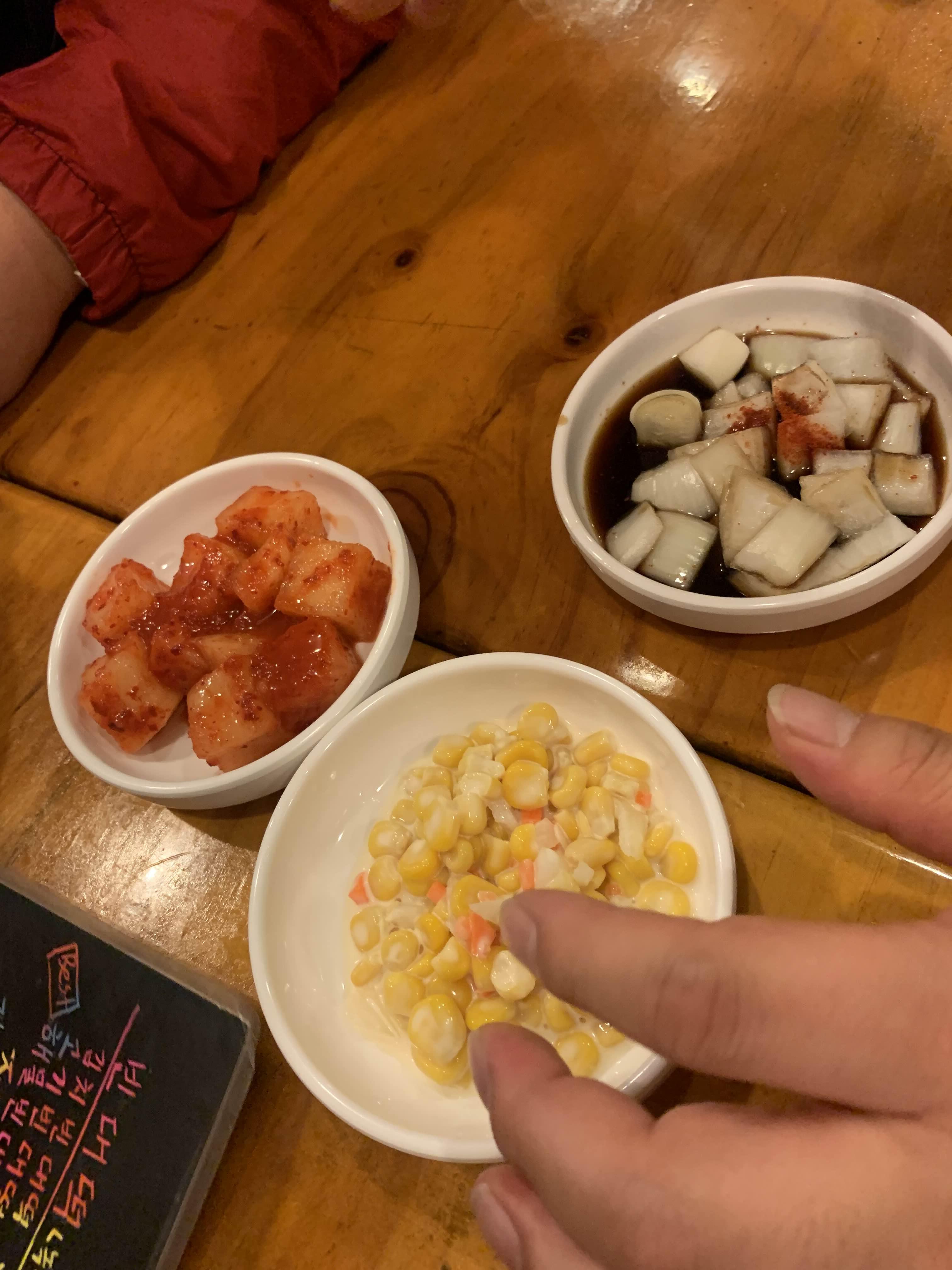 주문하면 밑반찬으로 깍두기, 간장양파, 콘샐러드가 나옵니다.