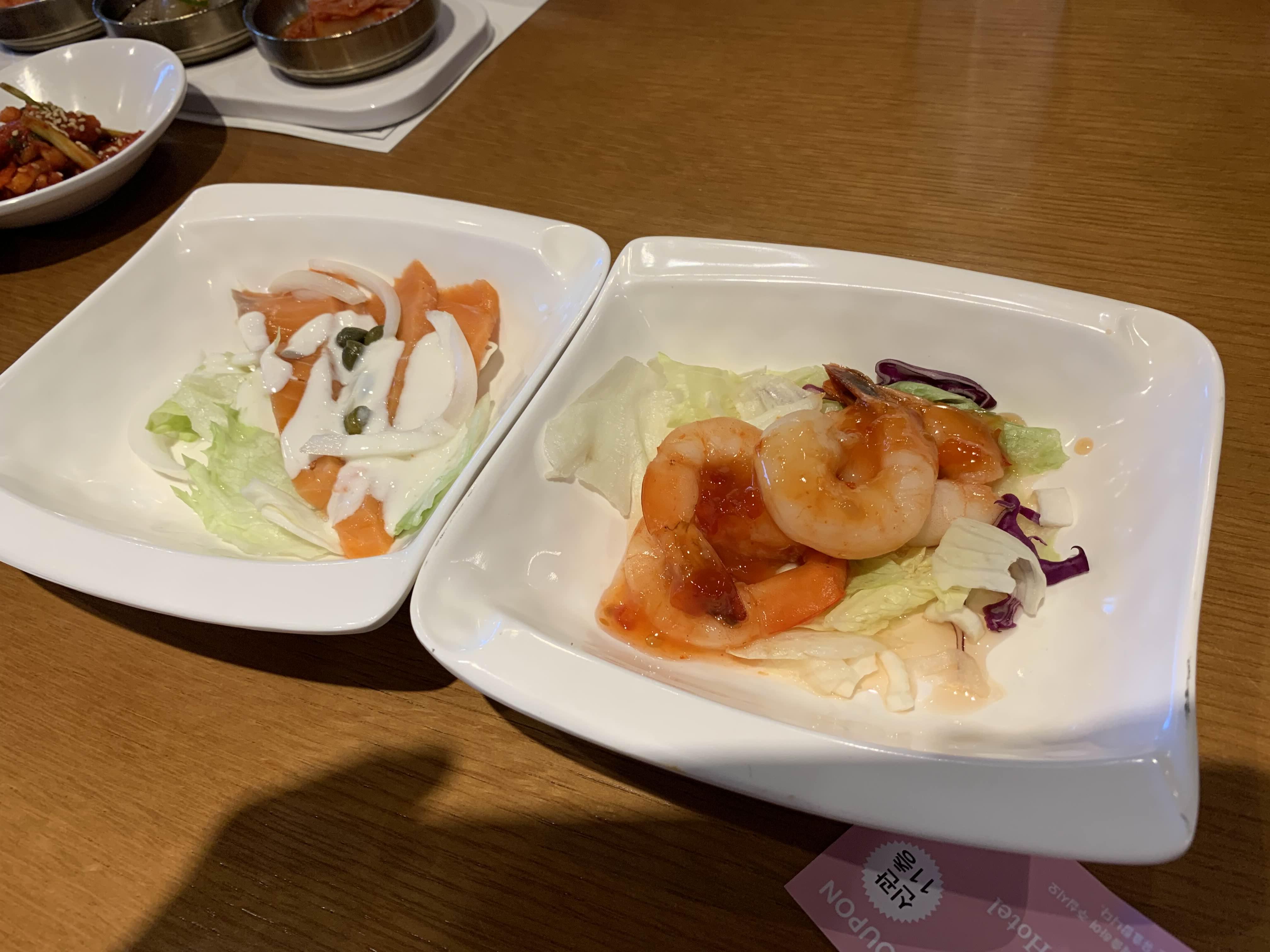 그리고 연어/새우 샐러드, 탕수육, 오리훈재, 양념갈비가 추가로 나오더군요.