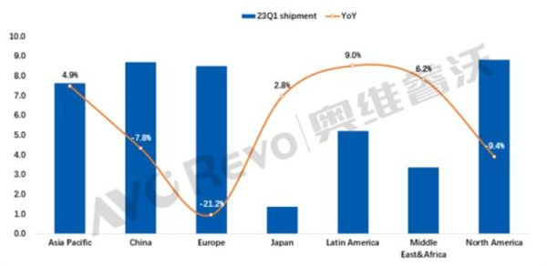 2023년 1분기 글로벌 TV 출하량 지역별, 전년 대비