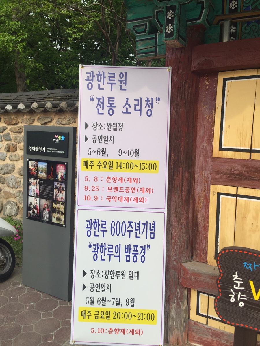 입구가 다른 쪽에서 기다리는 아들과 와이프를 만나기 위해 다른 입구 가는 길에 음식점과 전용 문화용품? 을 판매하는 장터가 있었네요. 딱 사고 싶은 게 없어서 바로 패스하고 입구로 직진!!! 서문에 도착하니, 광한루와 어울리지 않은 VR 체험 안내판이 보이네요;;; 광한루원 전통 소리청은 5~6월, 9~10월에 운영하고, 광한루 600주년 밤 풍경 야간개장 안내판도 보이네요.