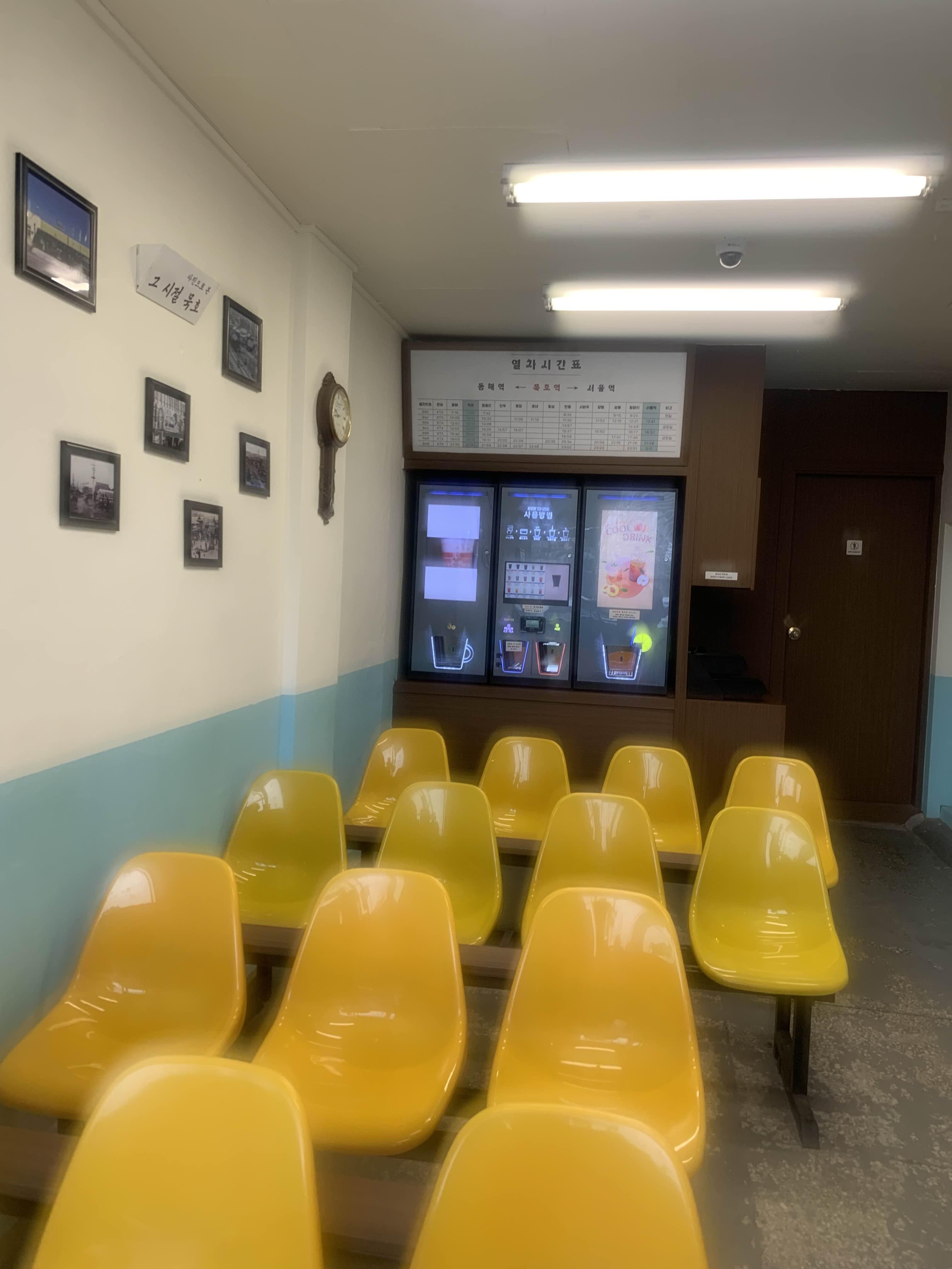화장실을 이용하는데.... 대합실이라.... 대합실 느낌의 무인카페! 분위기가 꽤 좋더군요. 식당 앞 묵호역인가? 있어서... 역 내부의 대합실 느낌의 인테리어를 구성했나 보더군요.ㅎㅎ