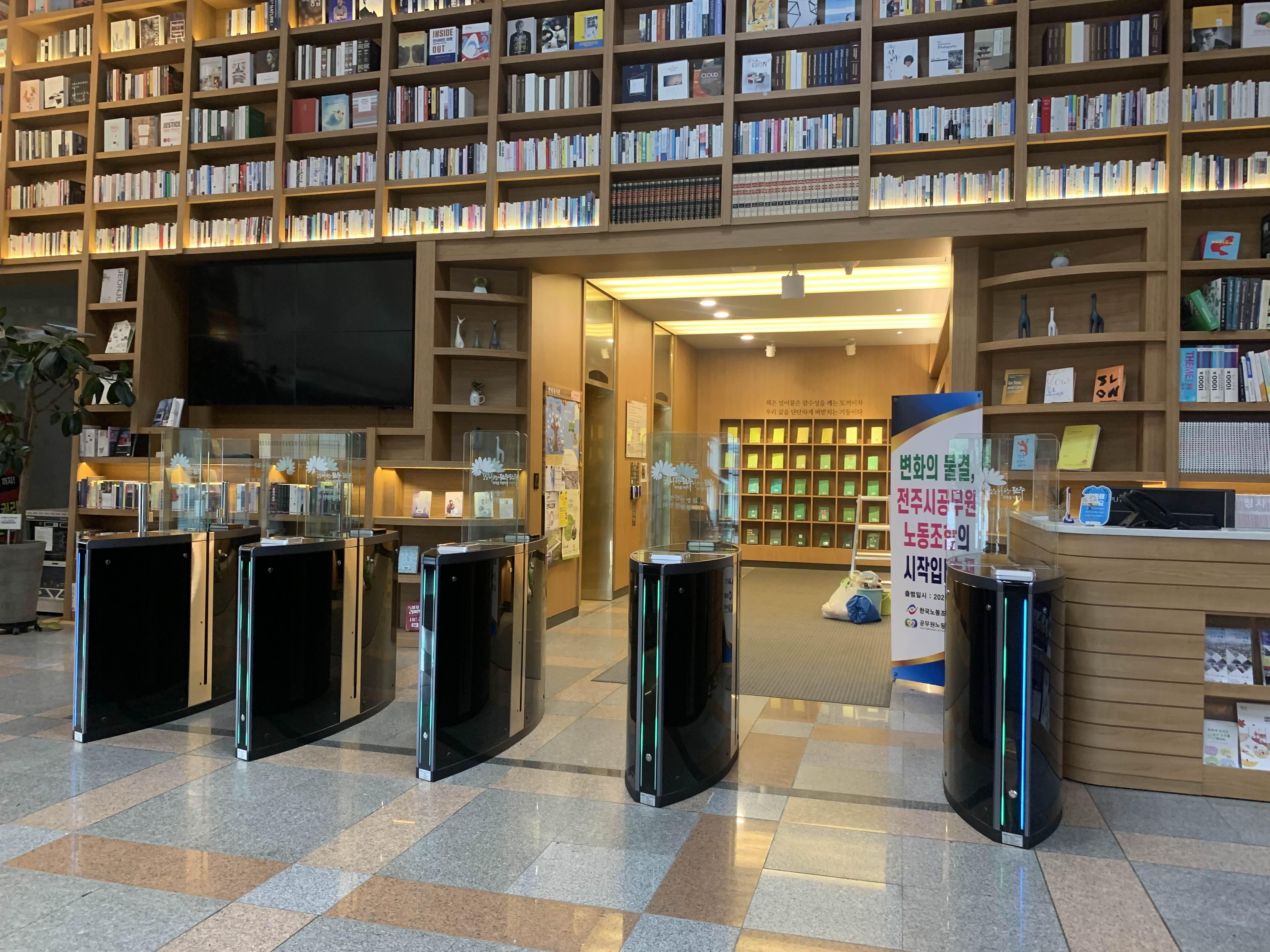 책기둥의 전주시청 내부에 설치되어... 시청의 업무공간과 책기둥의 공용공간의 구획은 전자 바리케이드가 설치되어 있었다.