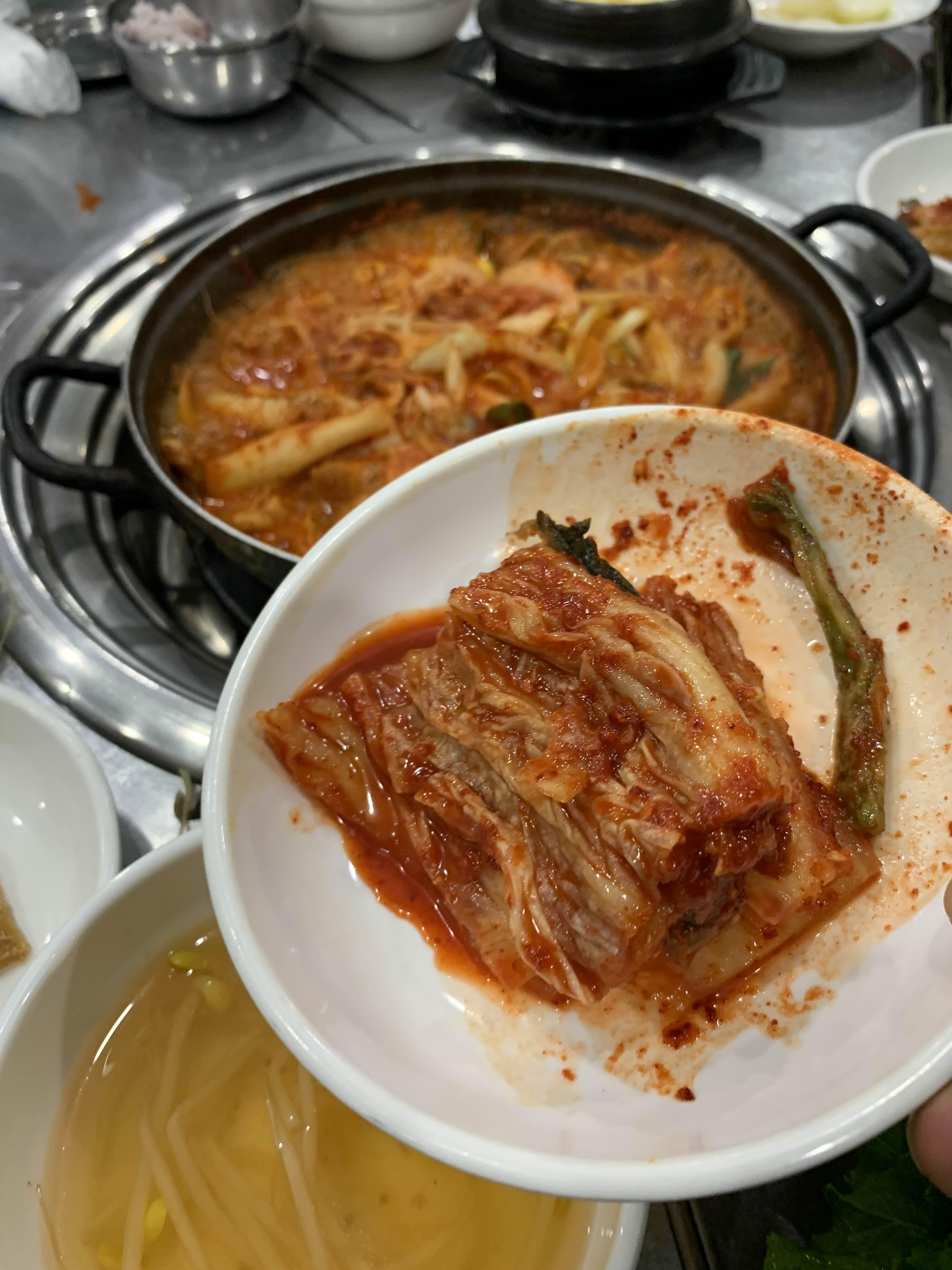 짜글이가 나오면, 콩나물과 배추김치를 함께 넣어서 끓여 줍니다. ㅎㅎ