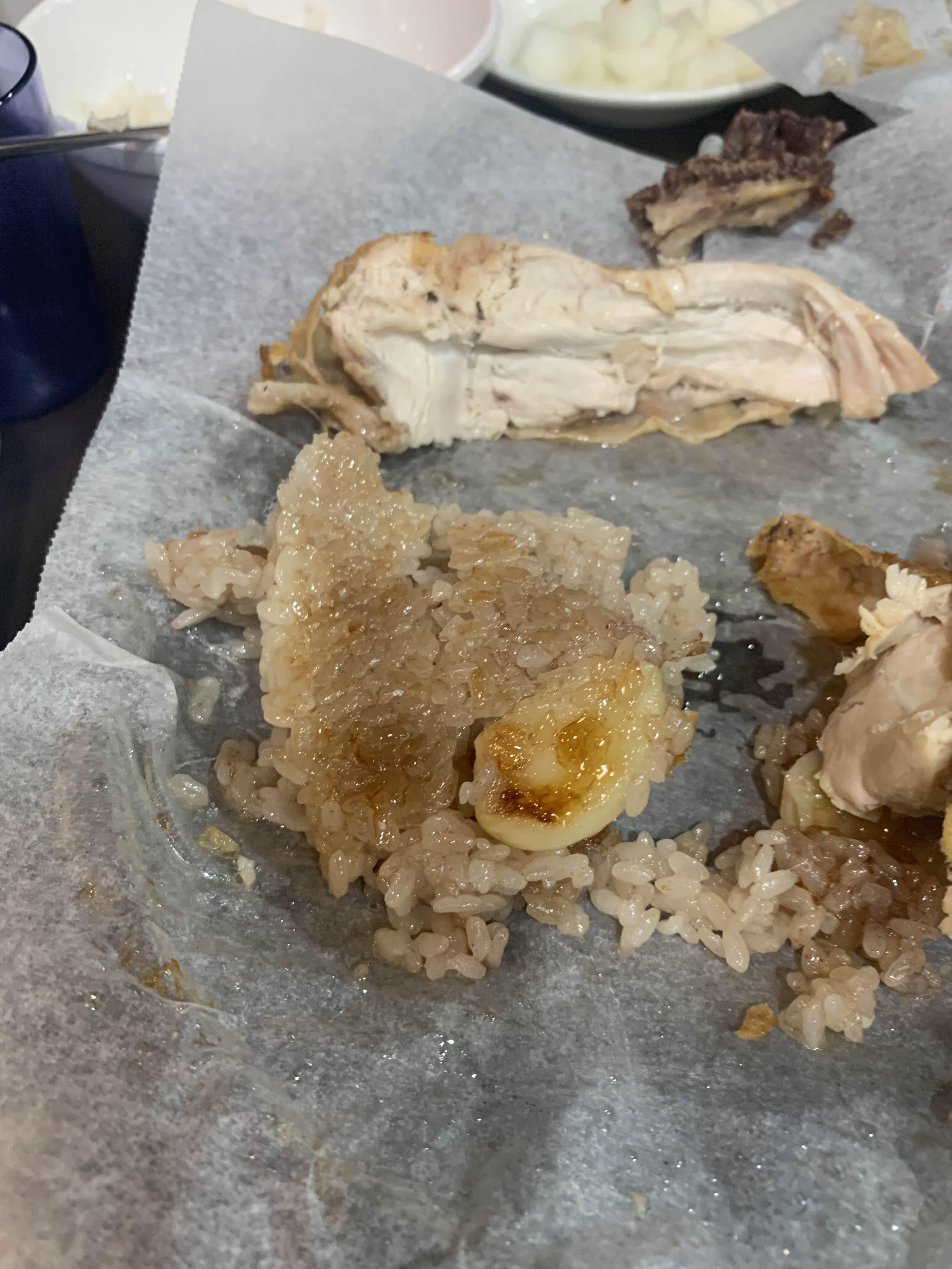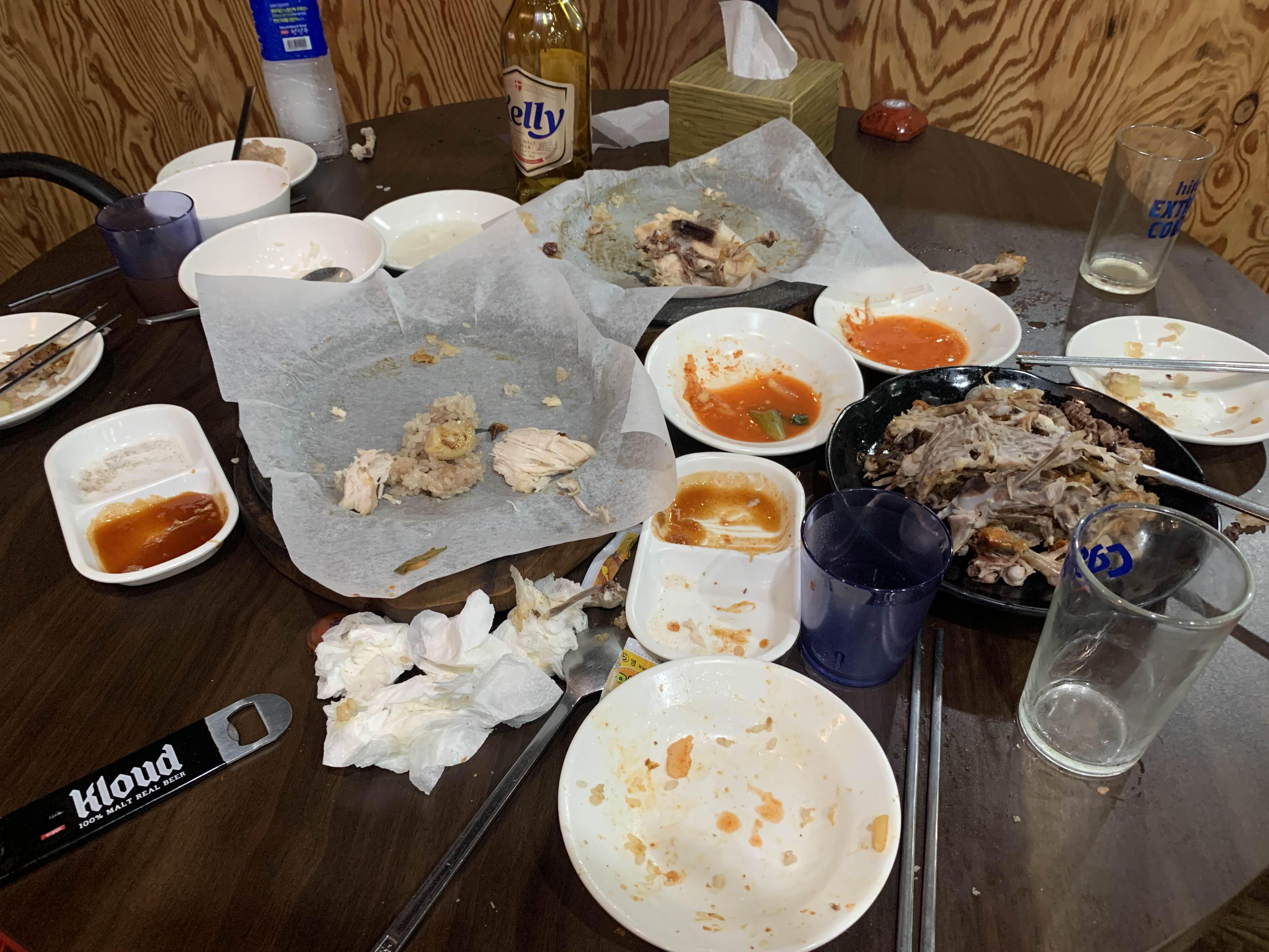 오랜 시간이 걸려서 만들어진 통닭구이.... 장작구기의 장작 특유의 향은 없는데...