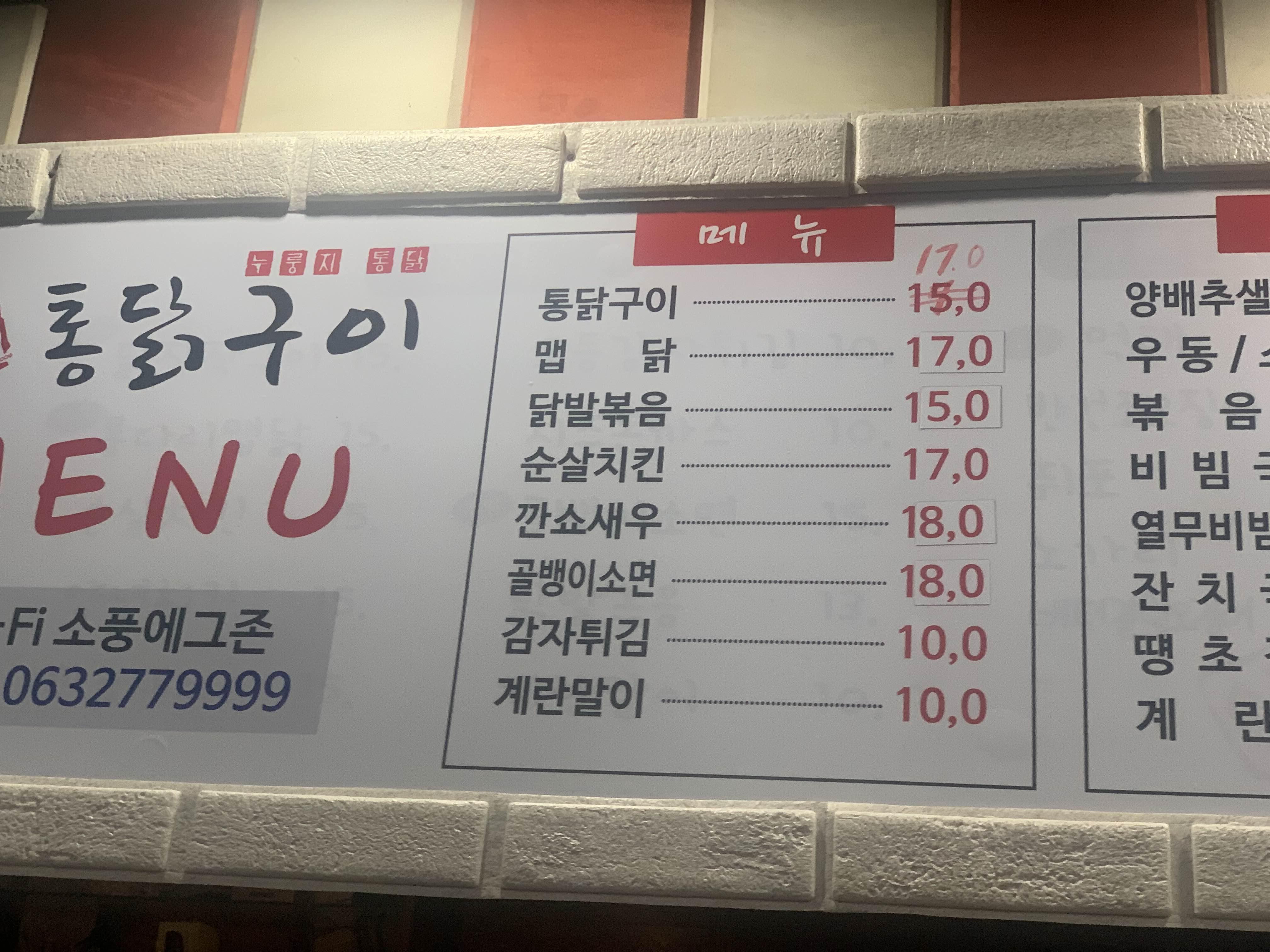 통닭구이, 맴닭, 닭발볶음, 순살치킨 깐쇼새우, 골뱅이소면, 감자튀김, 계란말이, 가락국수, 소면, 볶음밥, 열무비빔국수, 잔치국수 땡고추김밥, 먹태, 육포, 쥐포, 노가리.....