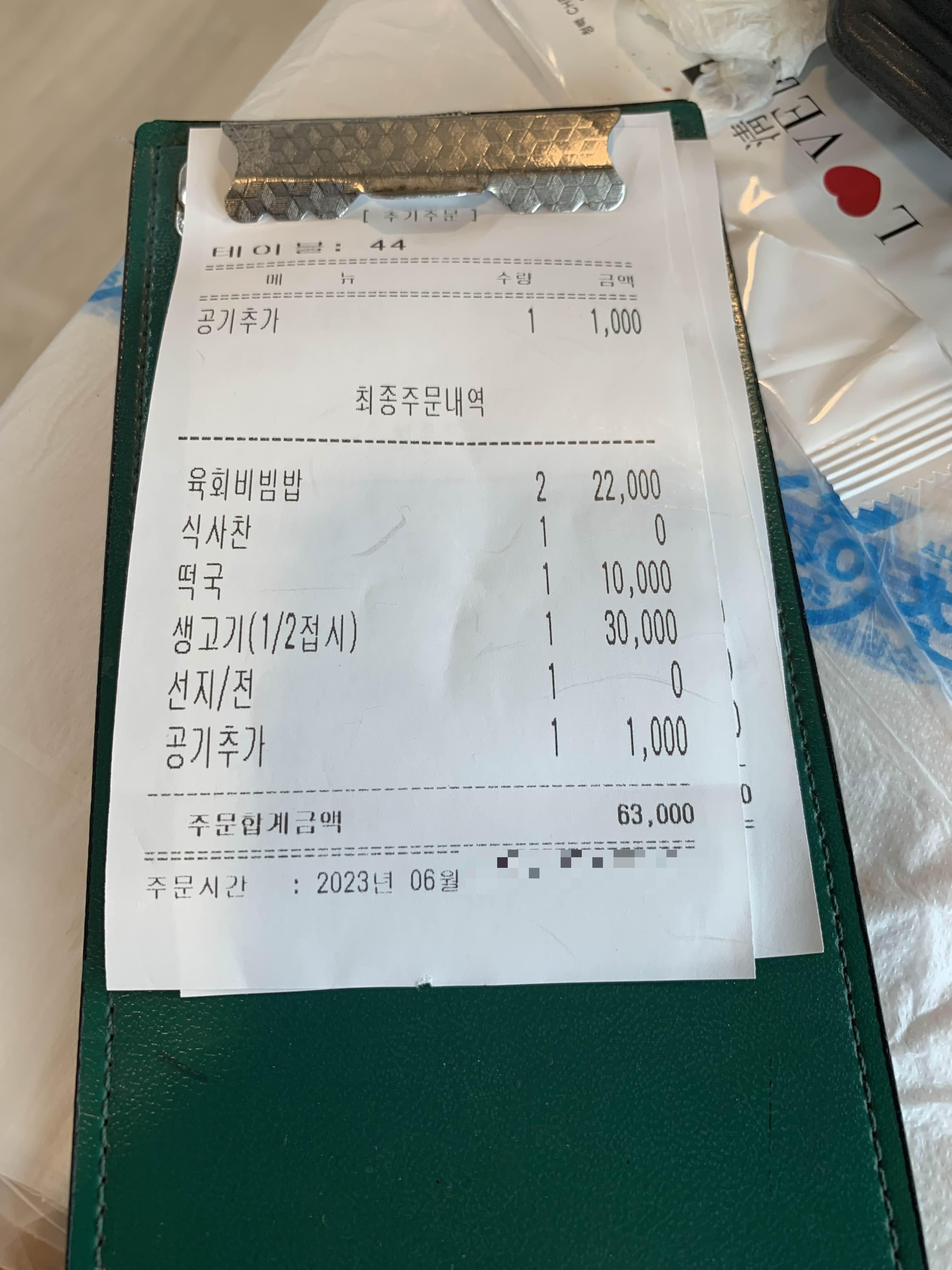 육회비빔밥 2개, 생고기 반접시, 떡국 주문하여... 63,000원!