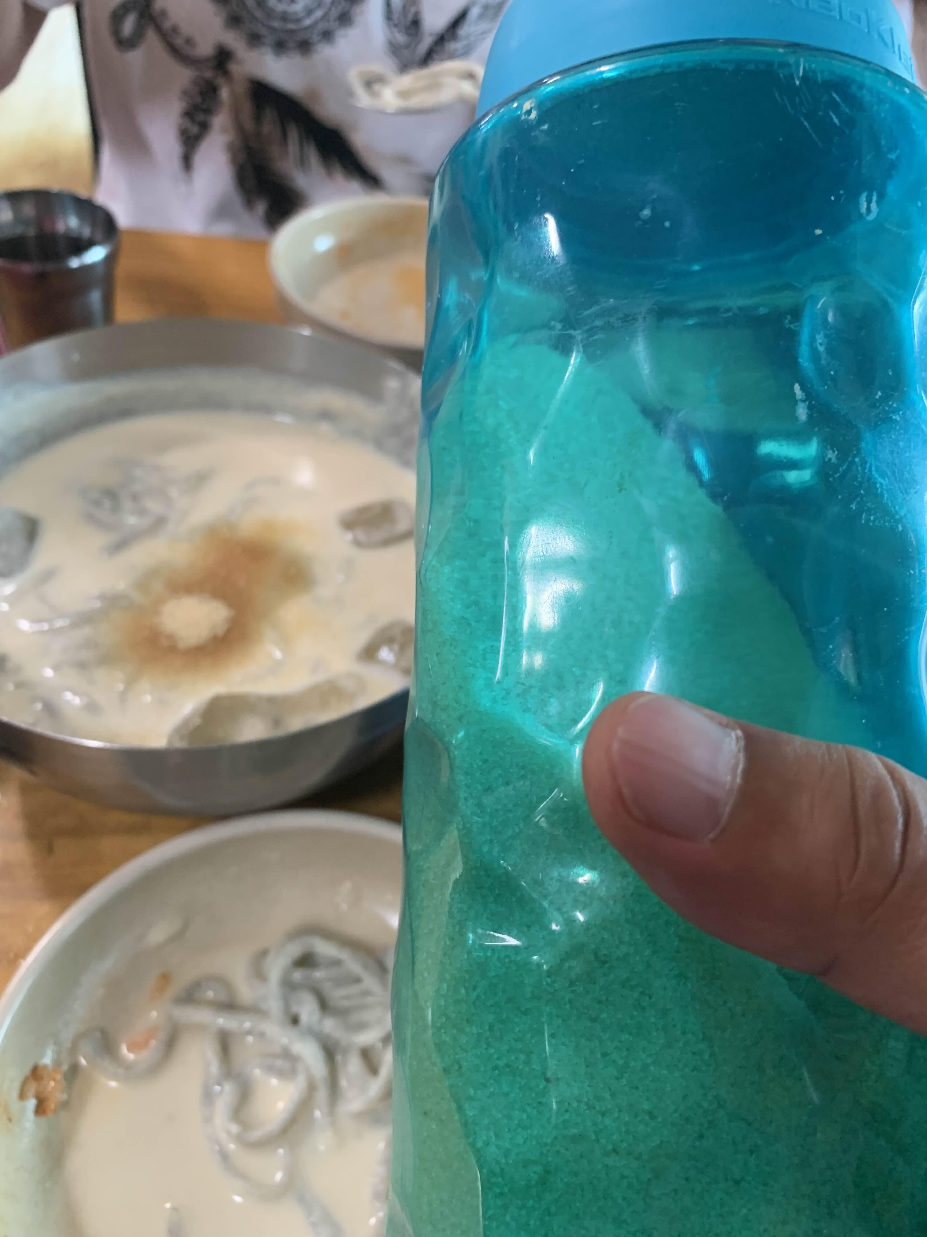 콩국수에 설탕을 넉넉히 뿌려서 먹으면 맛이 괜찮음.. 처음에는 조금씩 콩물의 고유 맛을 즐기면서... 설탕 추가!!