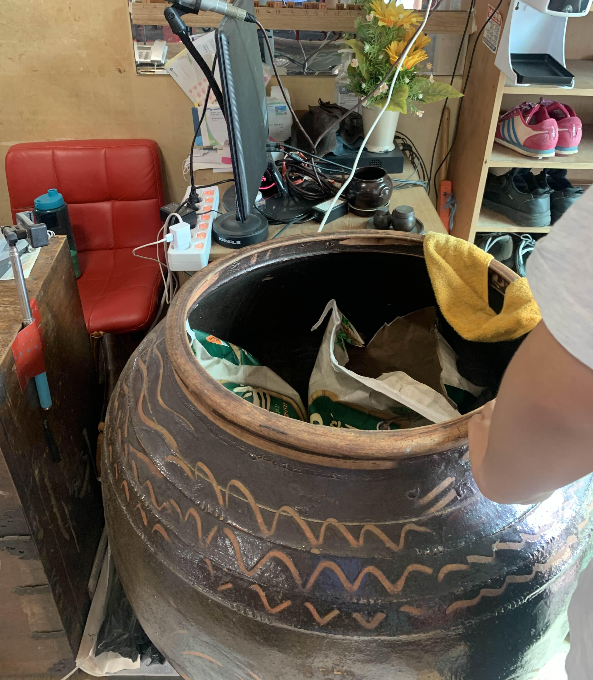 식탁 위 물병 모양의 큰 병이 하나 있는데...