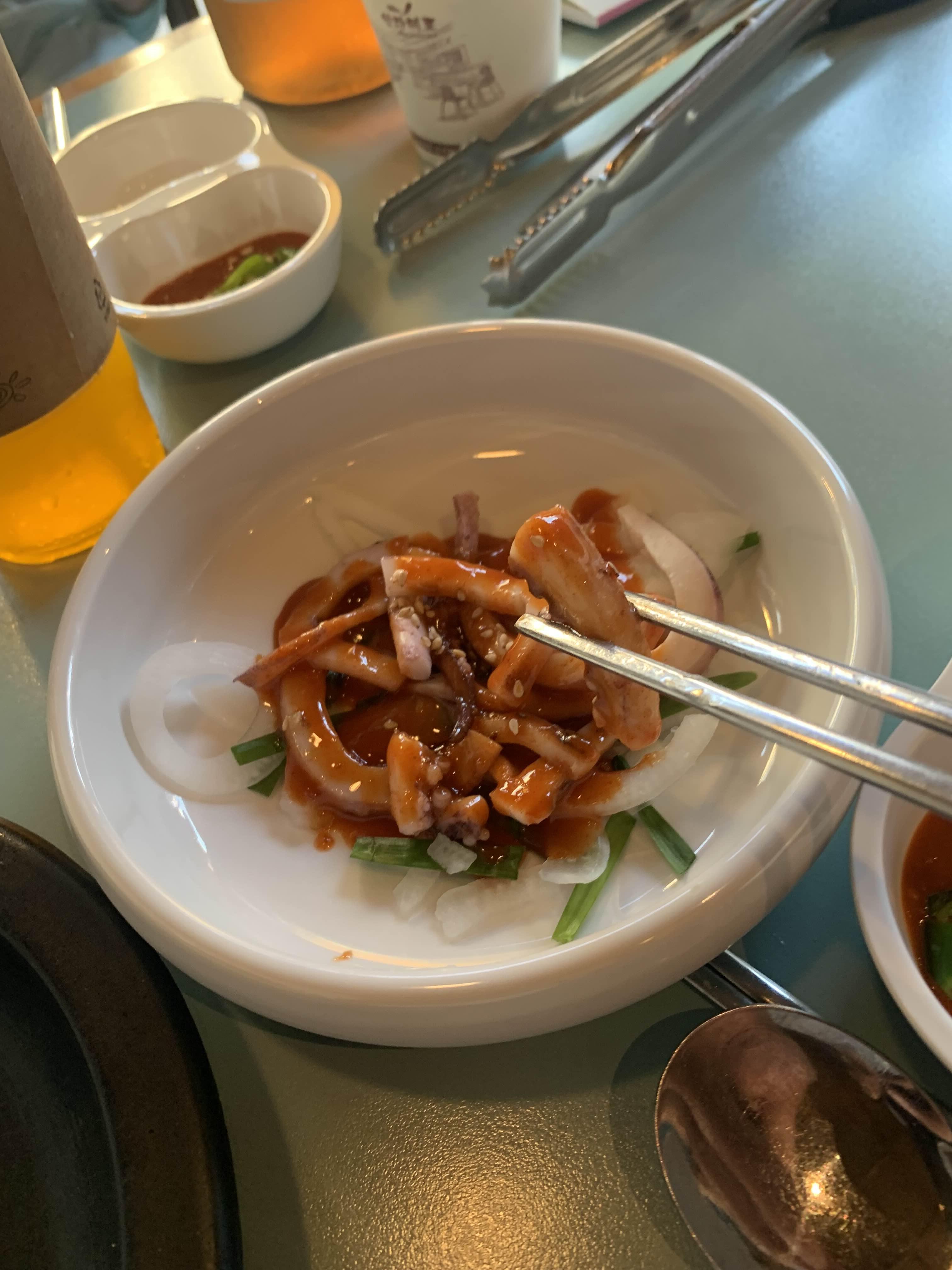 곱창 소스와 오징어 생채 그리고 콩나물국!