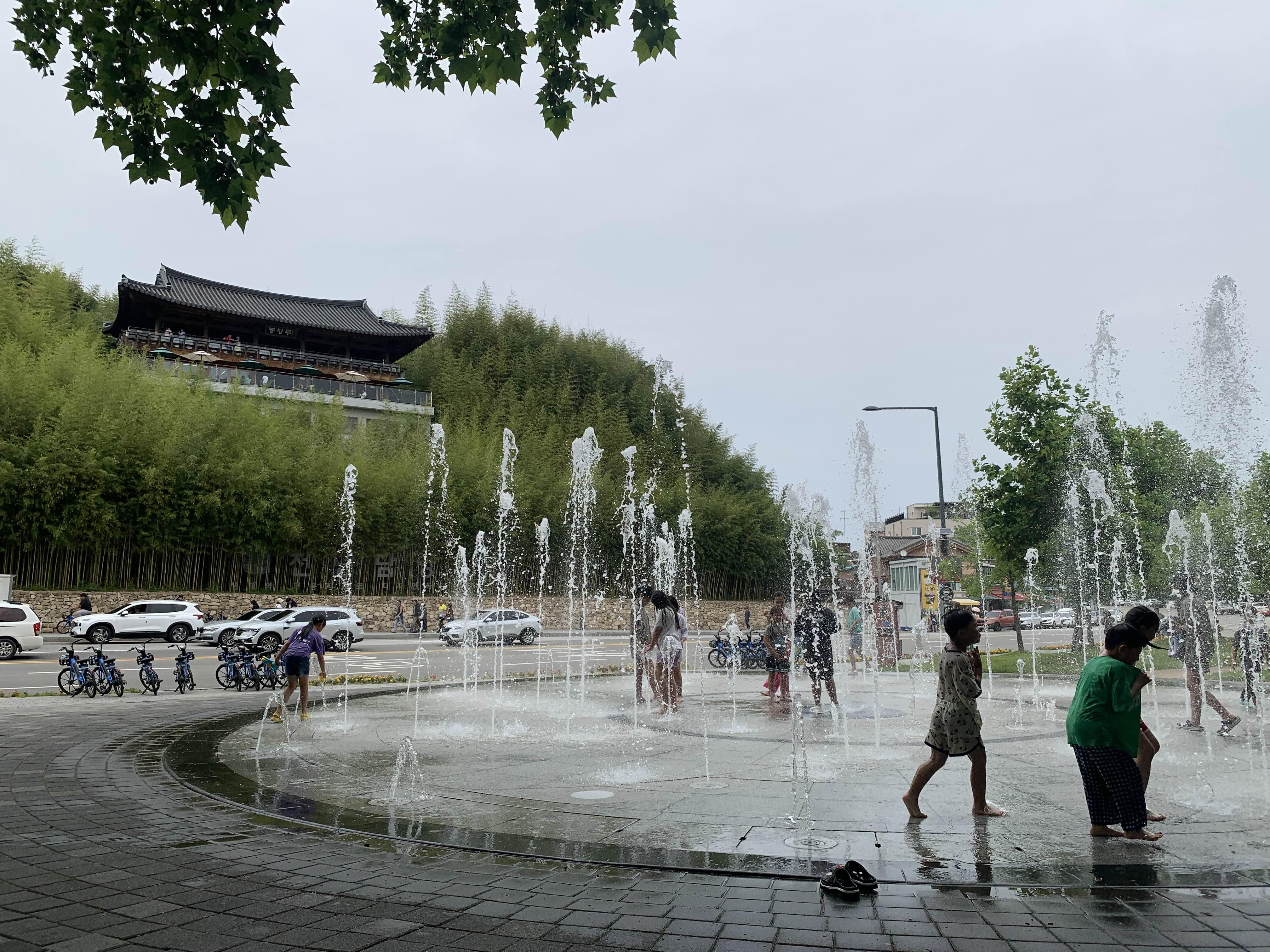 죽녹원 앞 광장에서는 분수대에서 아이들이 놀고 있다.