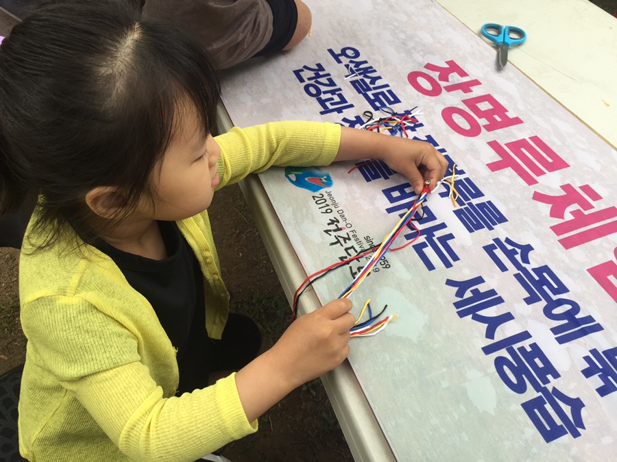 단오와 어울리는 체험은 장명루 체험이 진행되었습니다. 장명루는 오방색(파랑 동쪽, 빨강 남쪽, 노랑 중앙, 하양 서쪽, 검정 북쪽)을 실로 만드는 팔찌와 유사한 장신구인데... 오랫동안 건강하게 살라는 의미입니다. 소율이가 건강하게 오랫동안 살아가리를 기리며 만들어 보았네요. 다 만든 사진은 못 찍었네요. 만드는 게 생각보다 어려워서 천천히 만들고 있었는데.... 체험부스를 철수하고 있어서..ㅠㅠ 다음에 일찍 와서 체험해야겠네요.