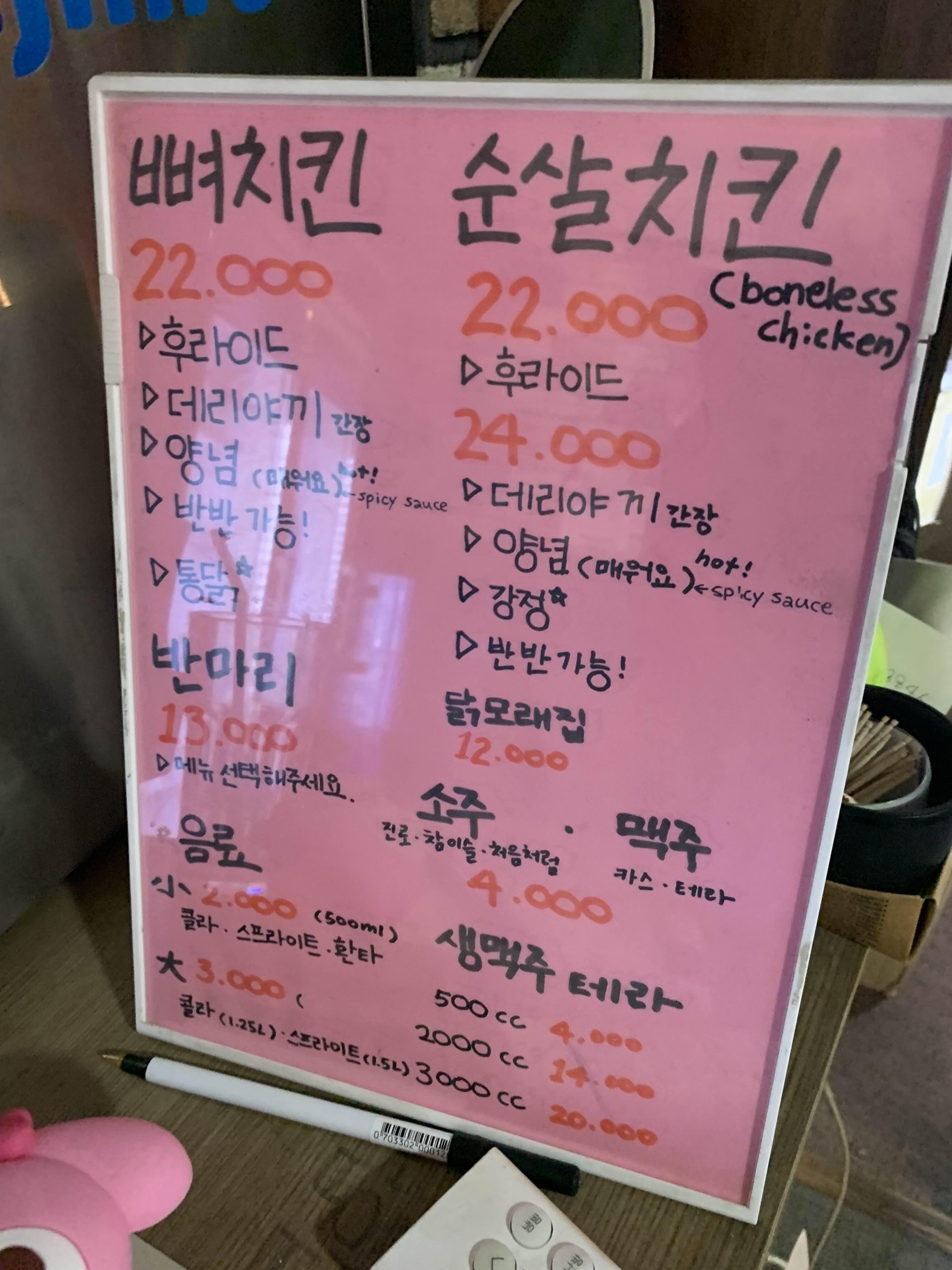 메뉴판을 스캔하고.... 가장 잘 나가는 메뉴를 물어보니, 후라이드/양념 반반이라고 해서.. 주문!