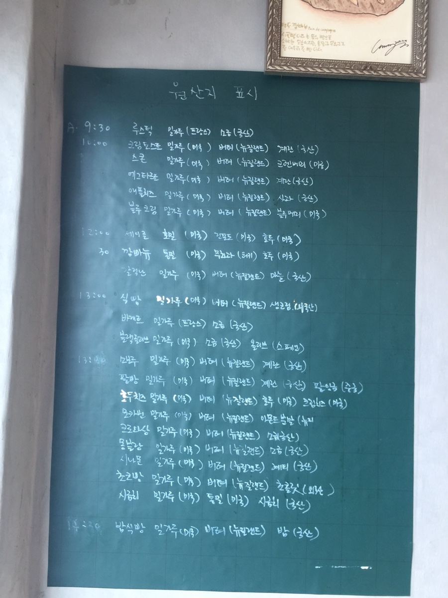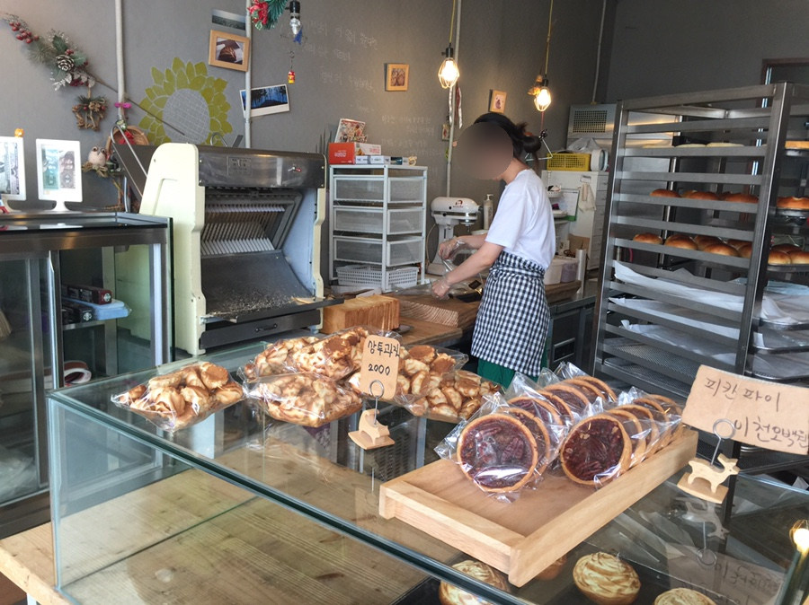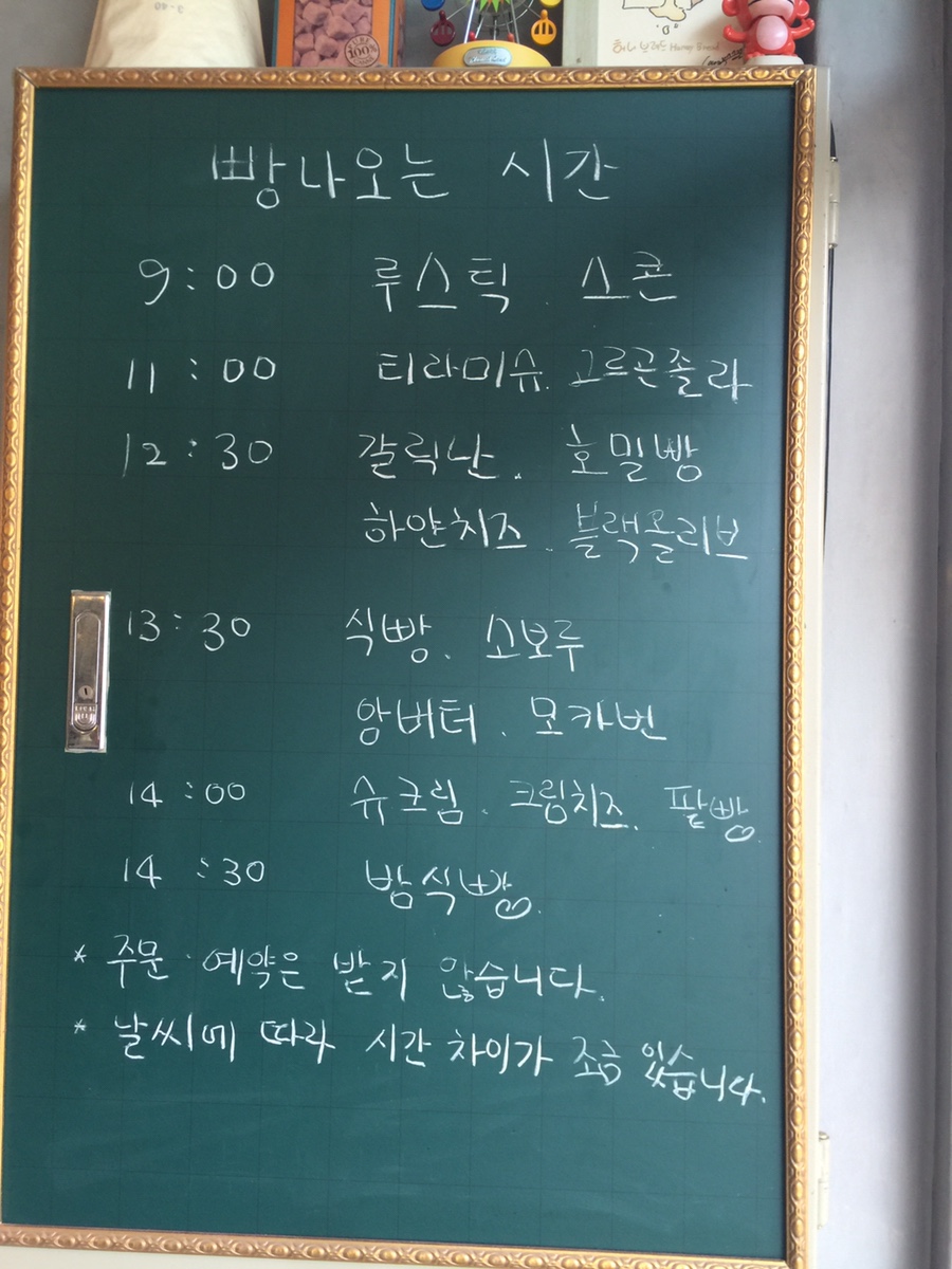 처음 방문하는 용진 동네 빵집 삼일월이네요. 식당 손님 대기장소는 상당히 협소하네요. 빵집에 가장 눈에 띄는 건 빵 나오는 시간표와 원산지 표시입니다. 빵집에 2시경에 도착해서.. 아침에 토스트로 먹을 식빵을 주문했는데 모두 팔렸다고 합니다. 허컥~ 몇몇 손님들이 대량으로 사가서 빵이 없네요. 그래서 2시에 나오는 팥빵, 크림치즈 그리고 초코빵? 상투과자를 구매했습니다.