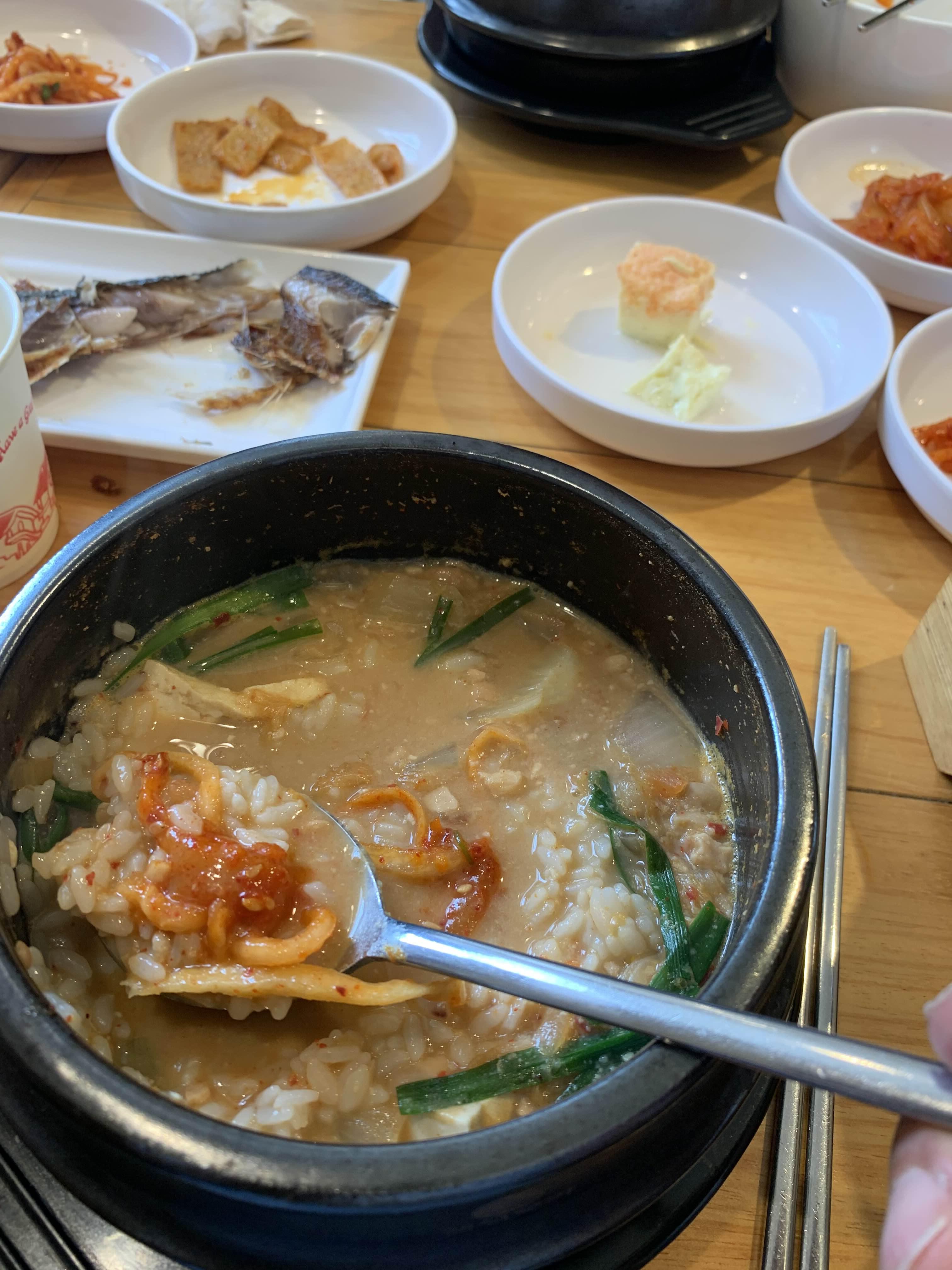 음식을 주문하면 기본 밑반찬으로 6가지... 그리고 생선구이가 나옵니다. 기본 밑반찬 중에 가장 맛있는 거는 김치볶음!ㅎㅎ