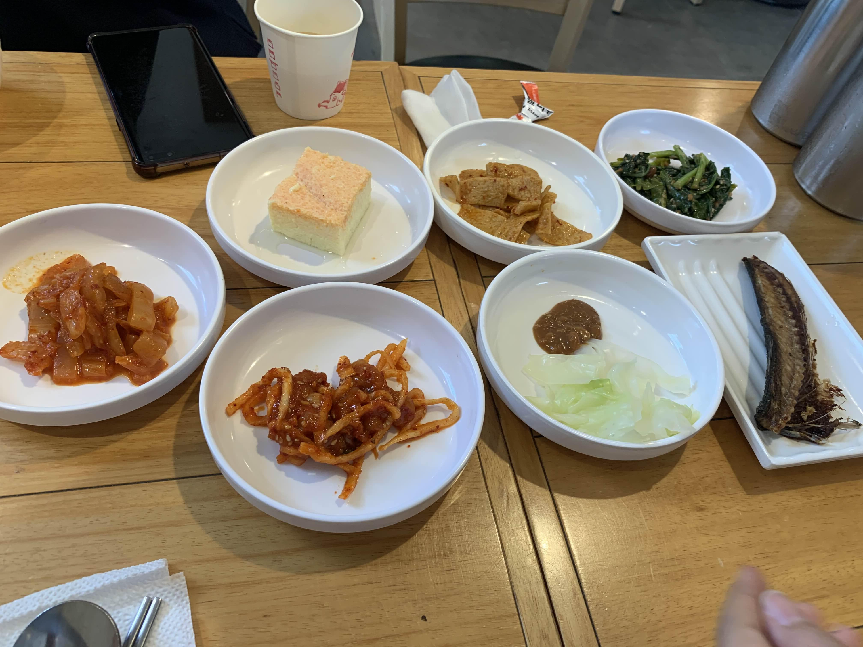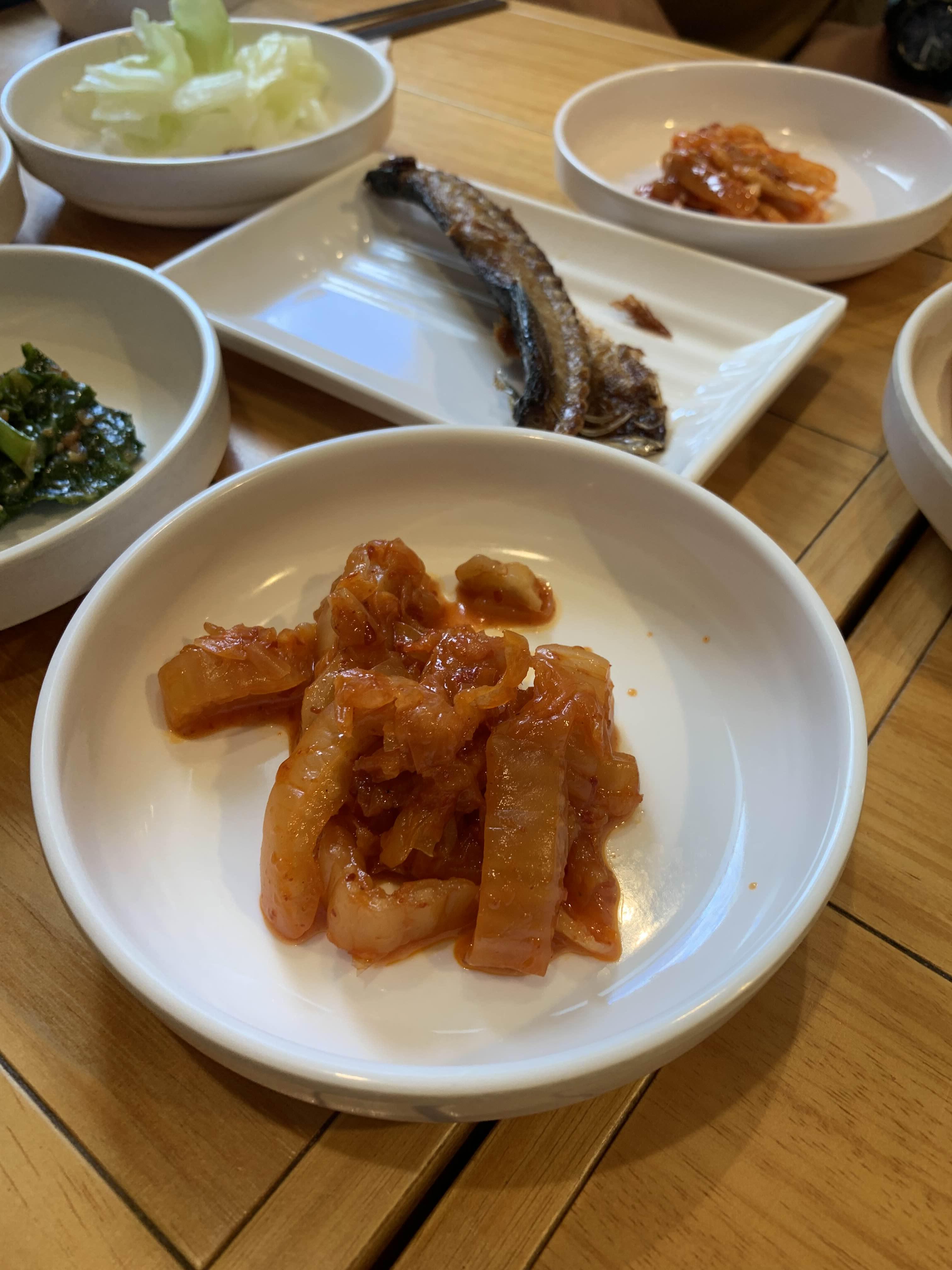 음식을 주문하면 기본 밑반찬으로 6가지... 그리고 생선구이가 나옵니다. 기본 밑반찬 중에 가장 맛있는 거는 김치볶음!ㅎㅎ
