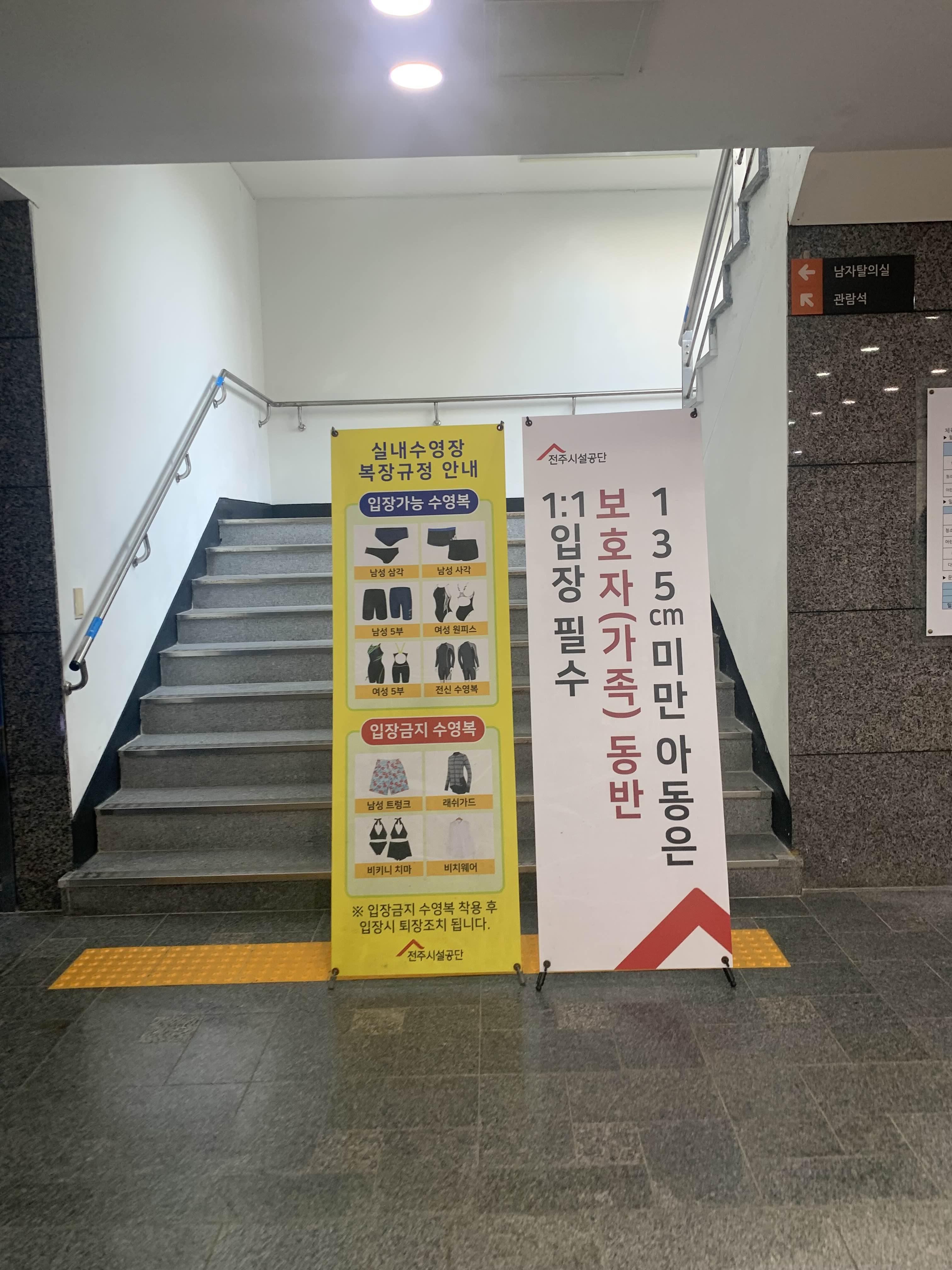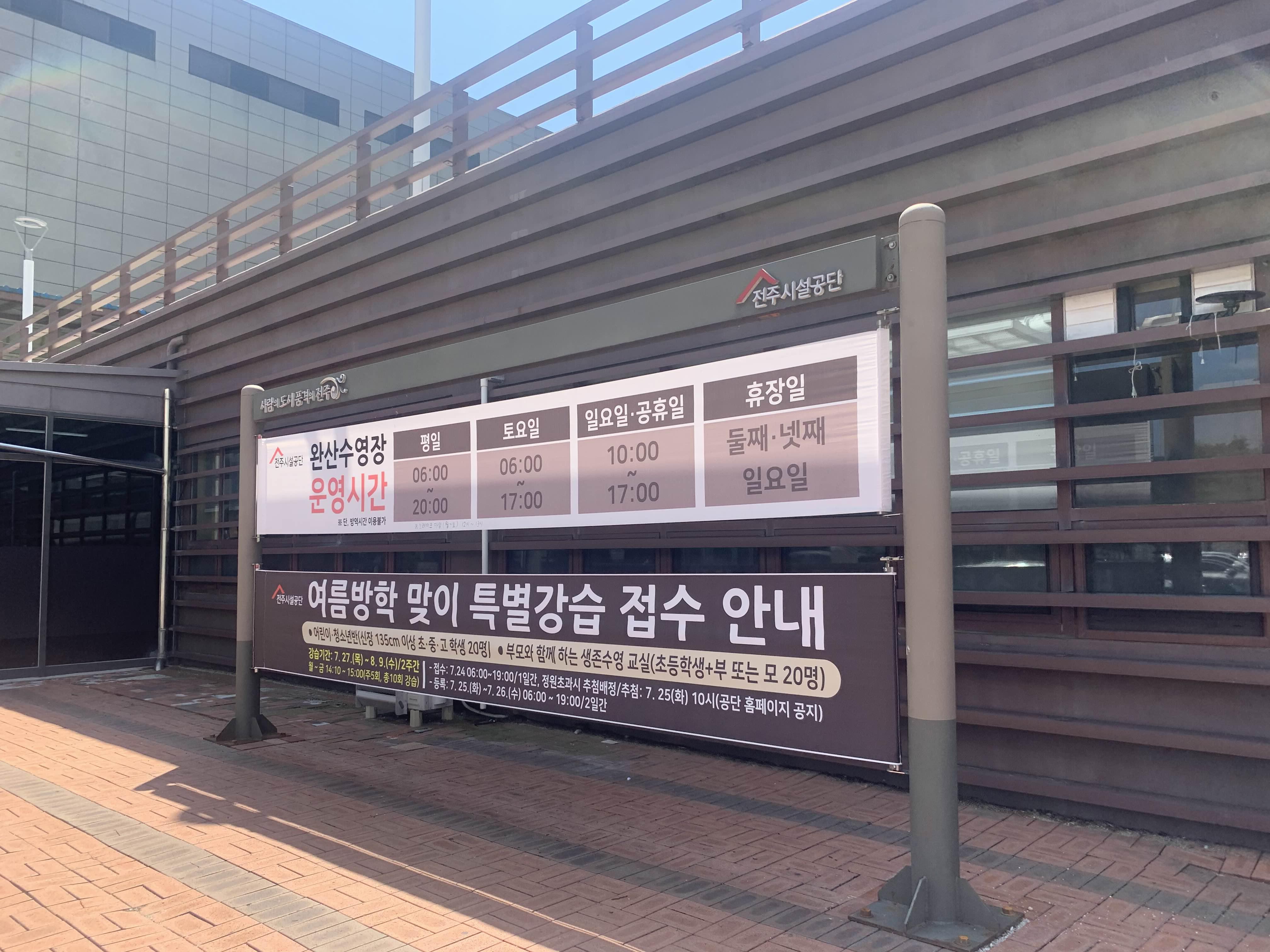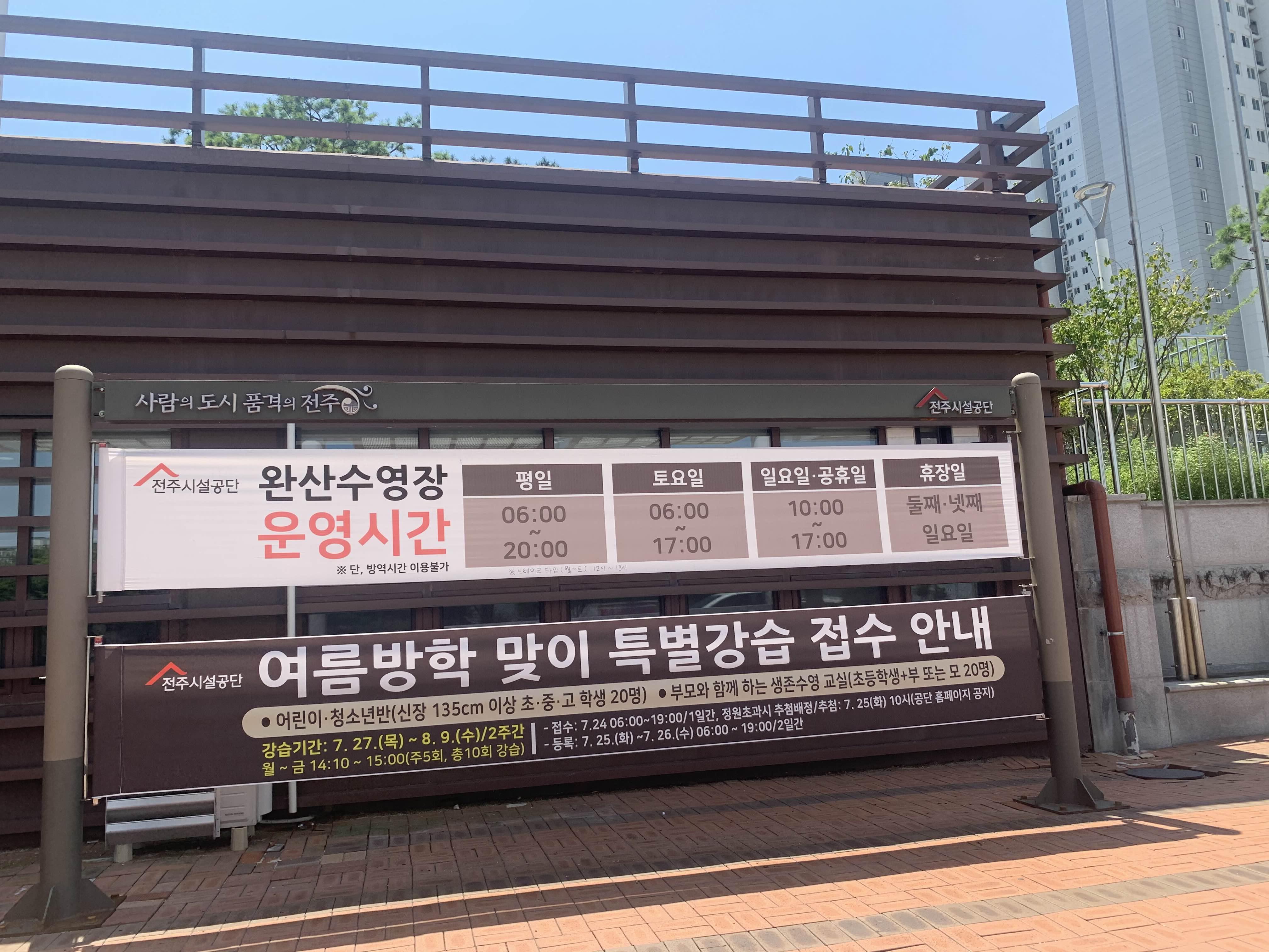 그리고 전주완산수영장은 국제수영경기를 치를 수 있는 수영장으로.... 큰 대화를 진행하는 기간은 당연! 휴장이다. 내가 방문한 8월에도... 8월 중순에 수영대회로 인하여 약 1주일 정도 휴장인 기간이 있었다.