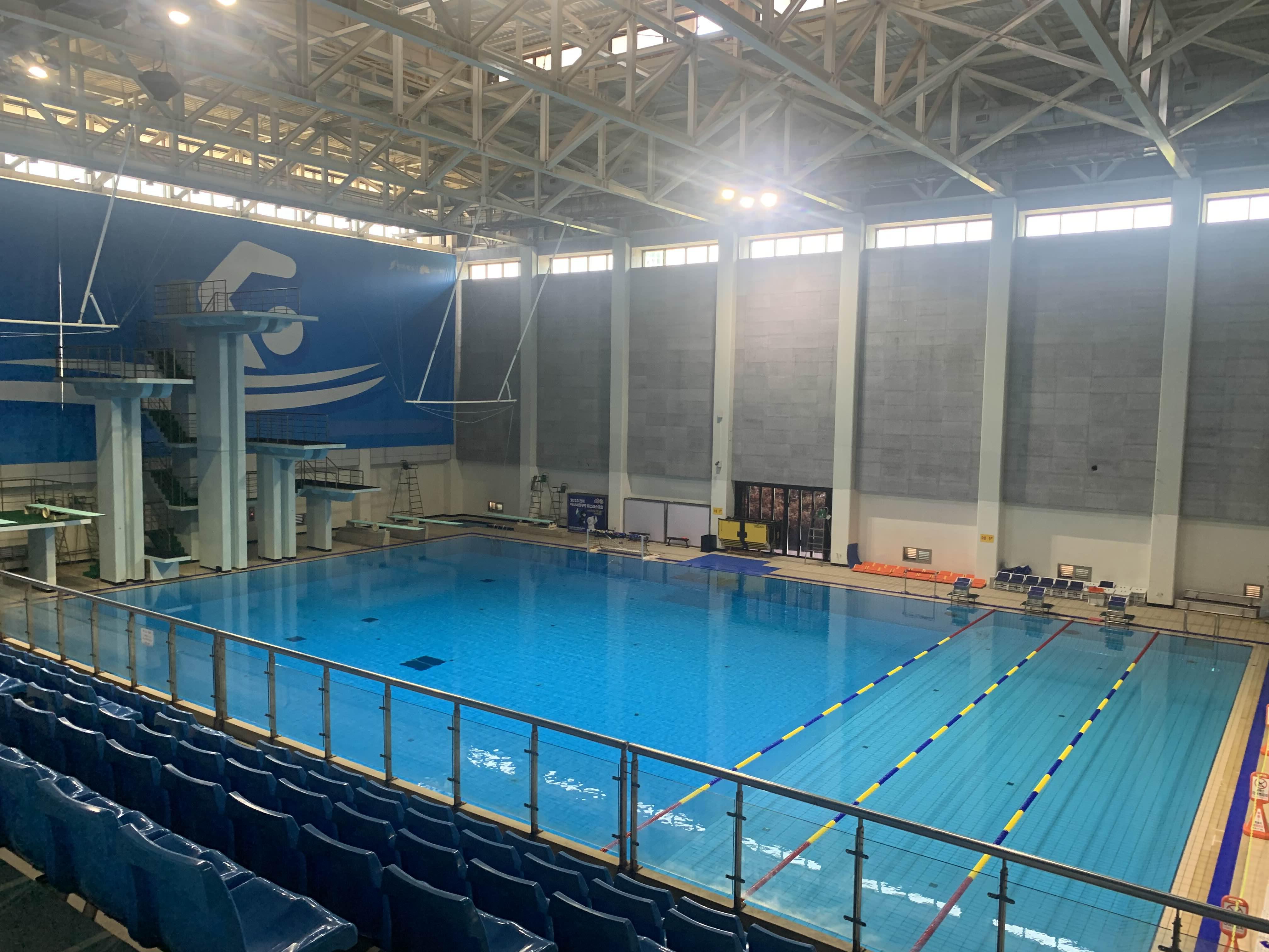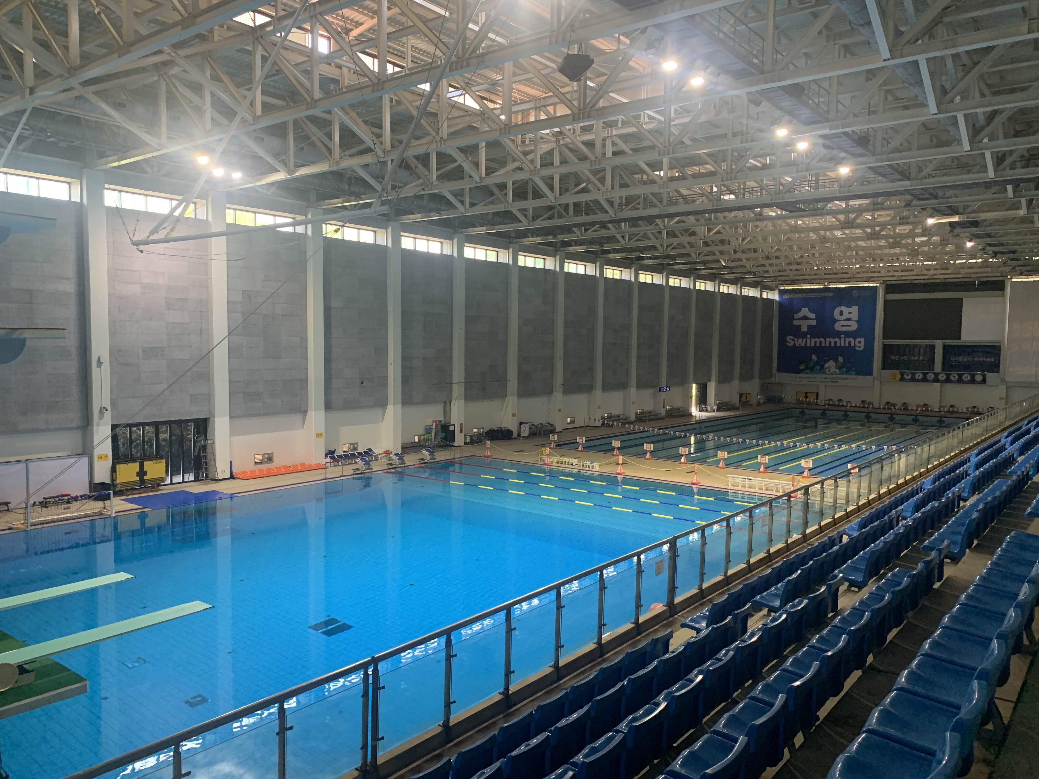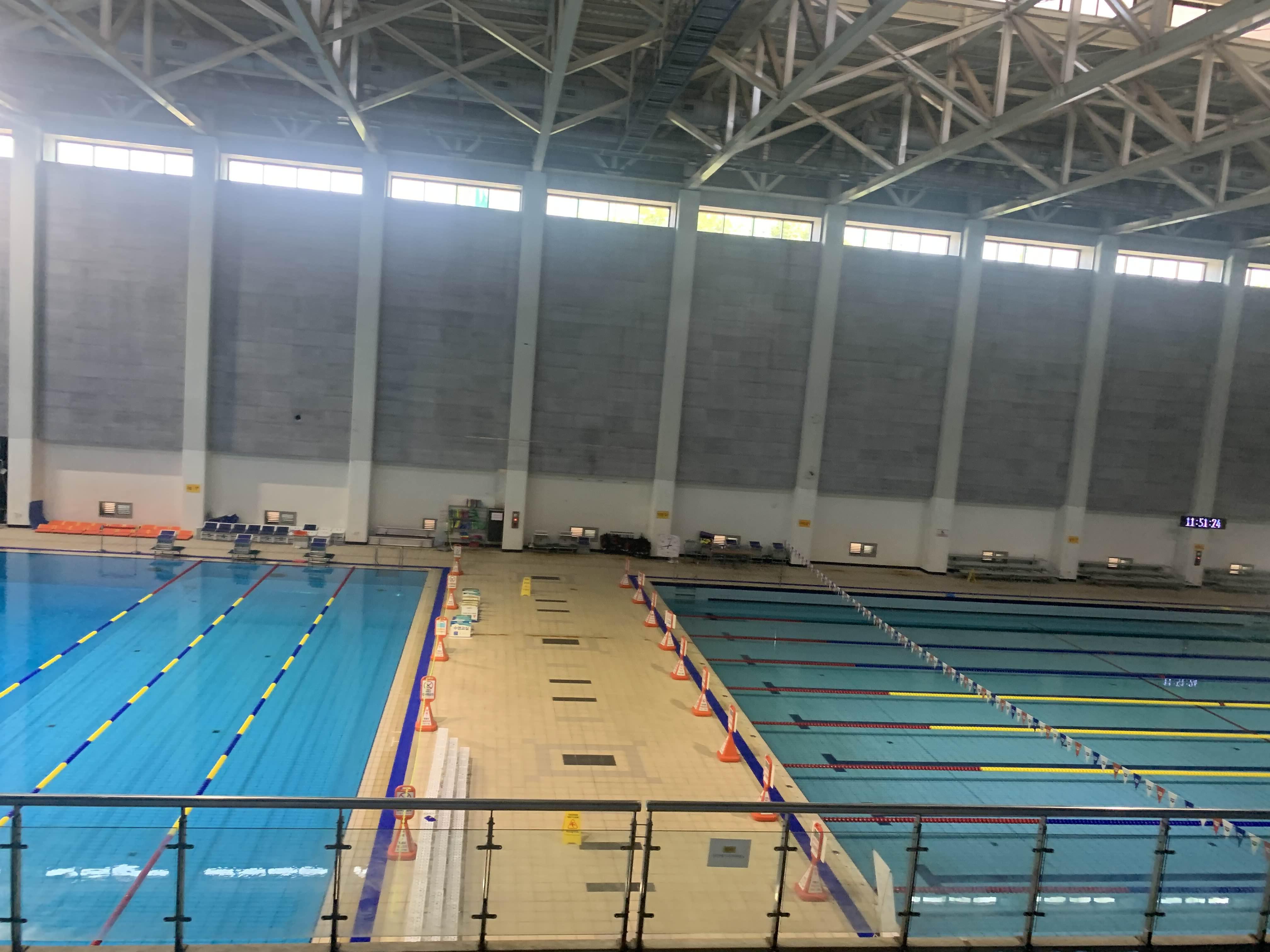 다른 수영장과 다르게... 수심이 얇다! 약 1.2m 수심으로 일반적인 수영장 1.4m 보다 낮아서... 키가 작은 아이들도 수영하로 많이 온다. 기본 수심이 1.2m 아니고... 대회가 있을 때는 수영장 물을 가득 채워서.. 대략 2m 정도의 수심을 유지하고... 대회가 없는 평일에는... 수심을 2/3 정도만 채워 일반인에게 오픈하는 방식이더군요.ㅎㅎ