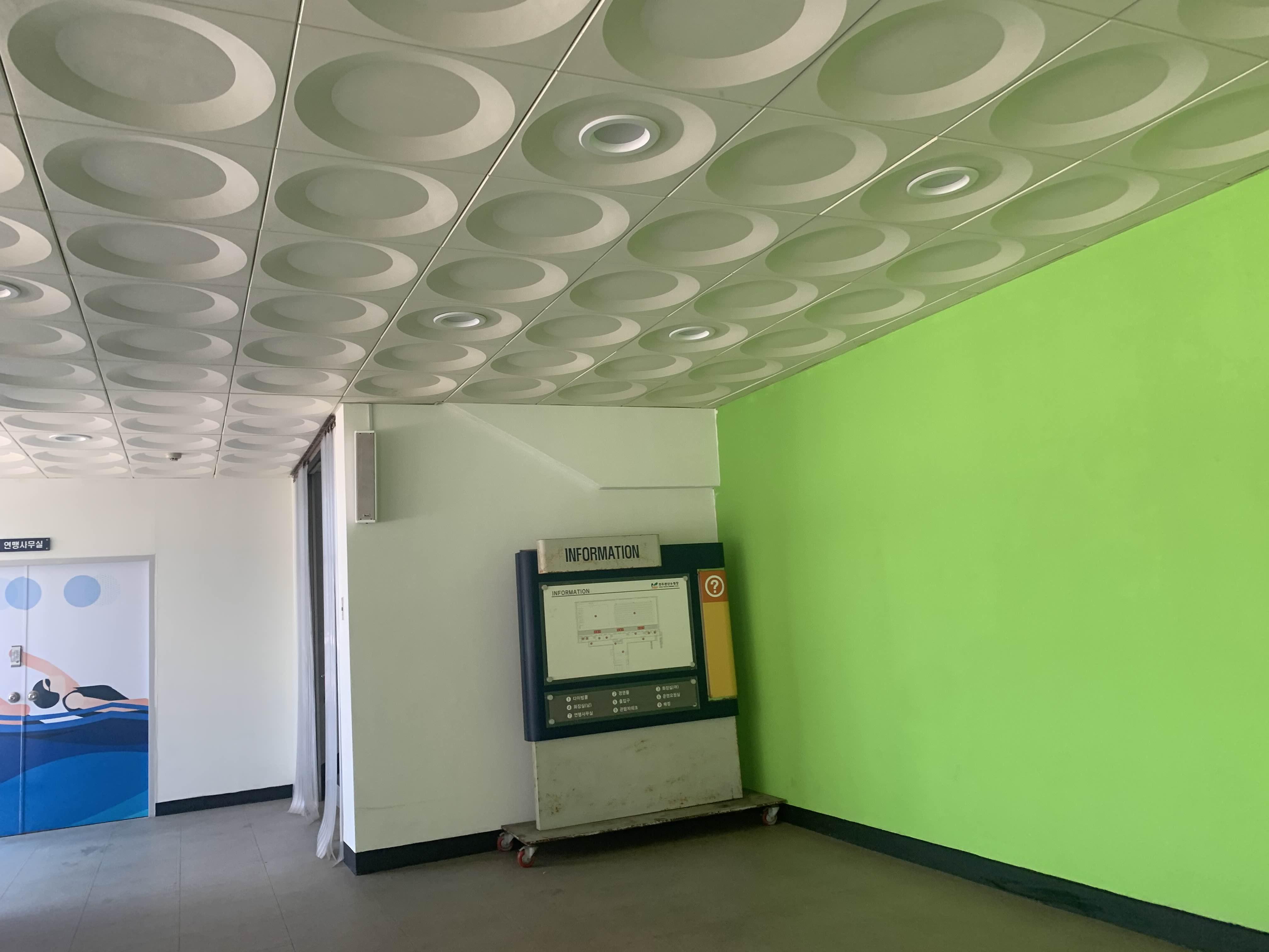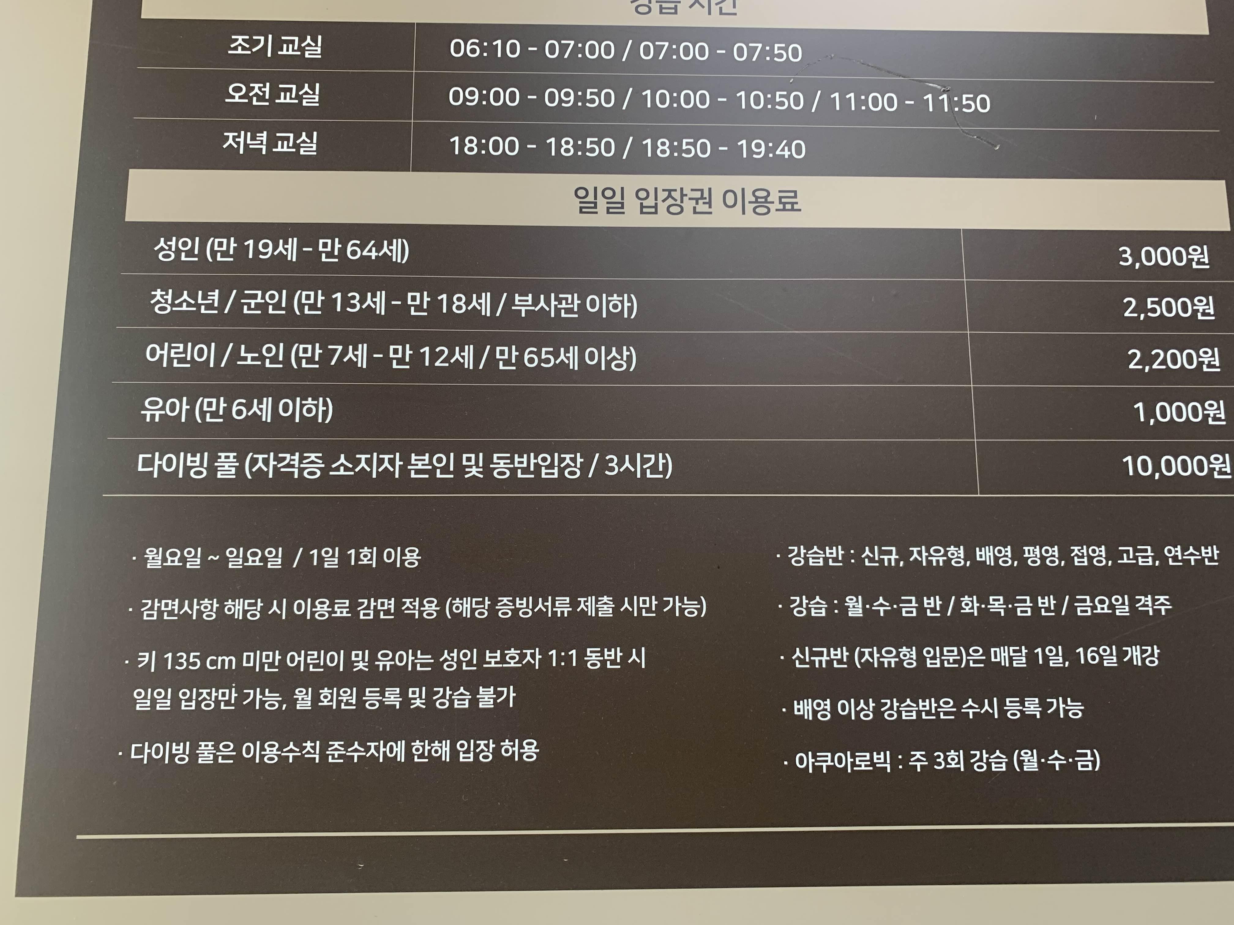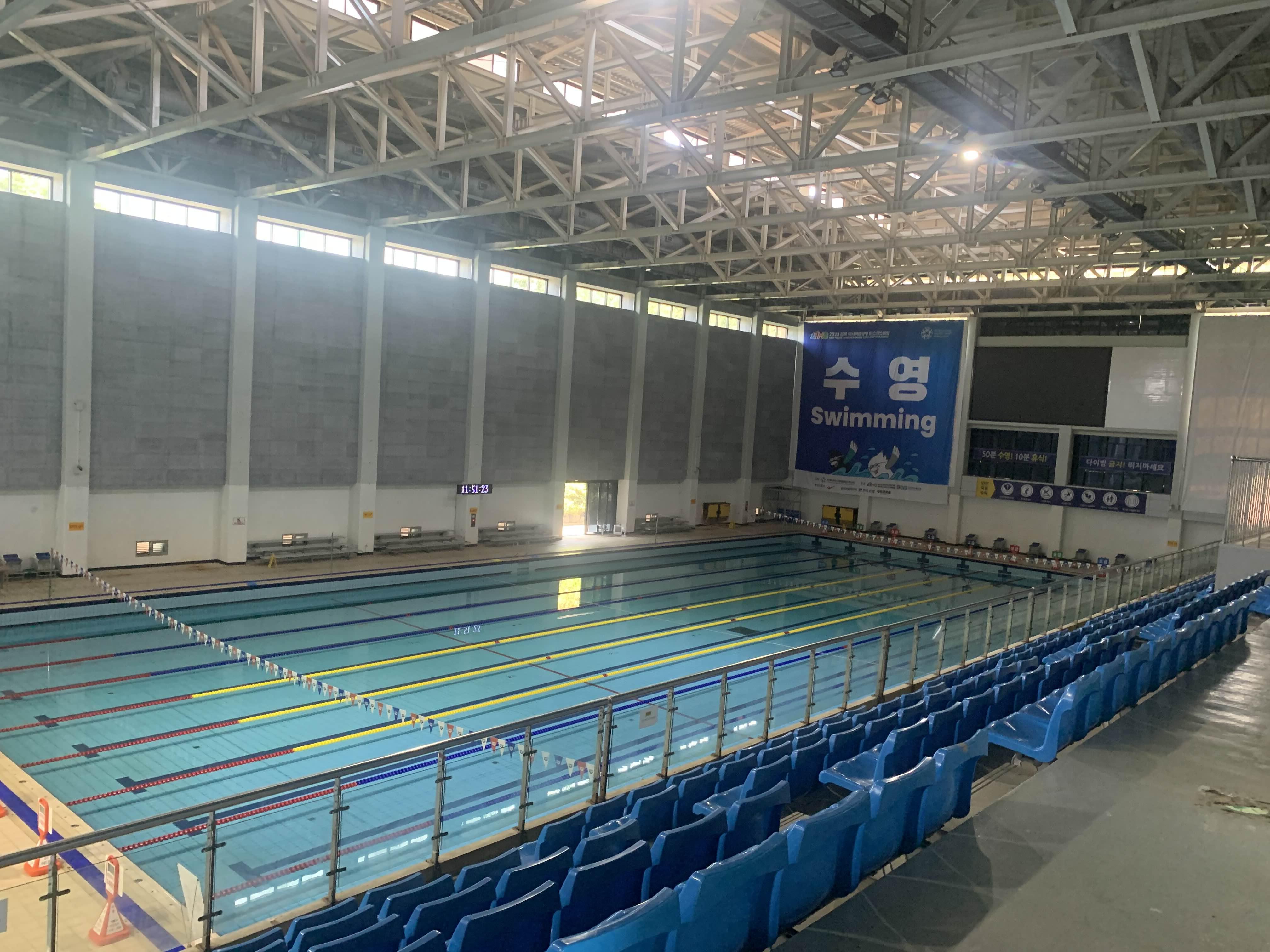 다른 수영장과 다르게... 수심이 얇다! 약 1.2m 수심으로 일반적인 수영장 1.4m 보다 낮아서... 키가 작은 아이들도 수영하로 많이 온다. 기본 수심이 1.2m 아니고... 대회가 있을 때는 수영장 물을 가득 채워서.. 대략 2m 정도의 수심을 유지하고... 대회가 없는 평일에는... 수심을 2/3 정도만 채워 일반인에게 오픈하는 방식이더군요.ㅎㅎ