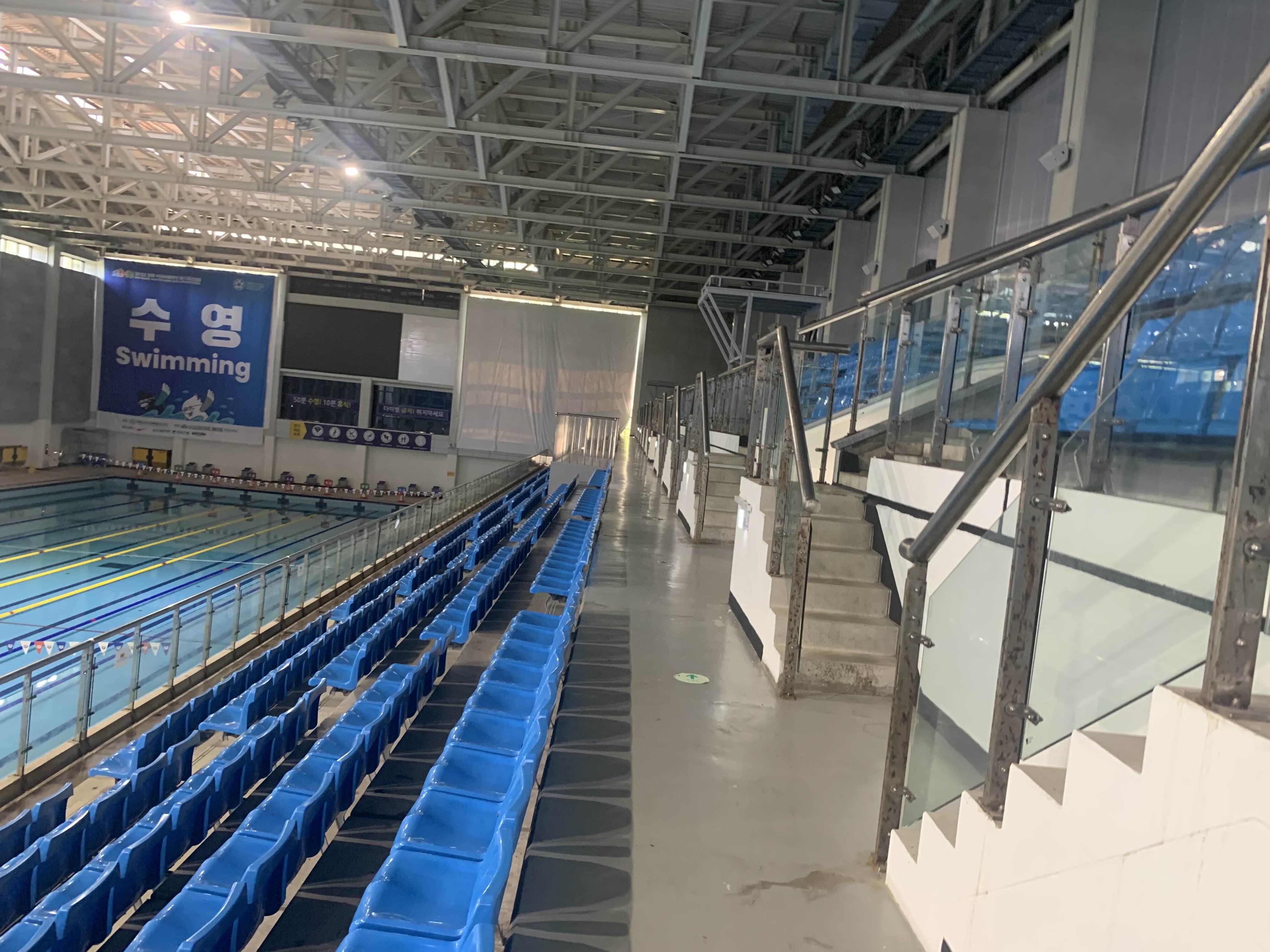 수영대회를 진행하는 수영장이라.... 수영장 한편에는 관객석이 마련되어 있더군요.