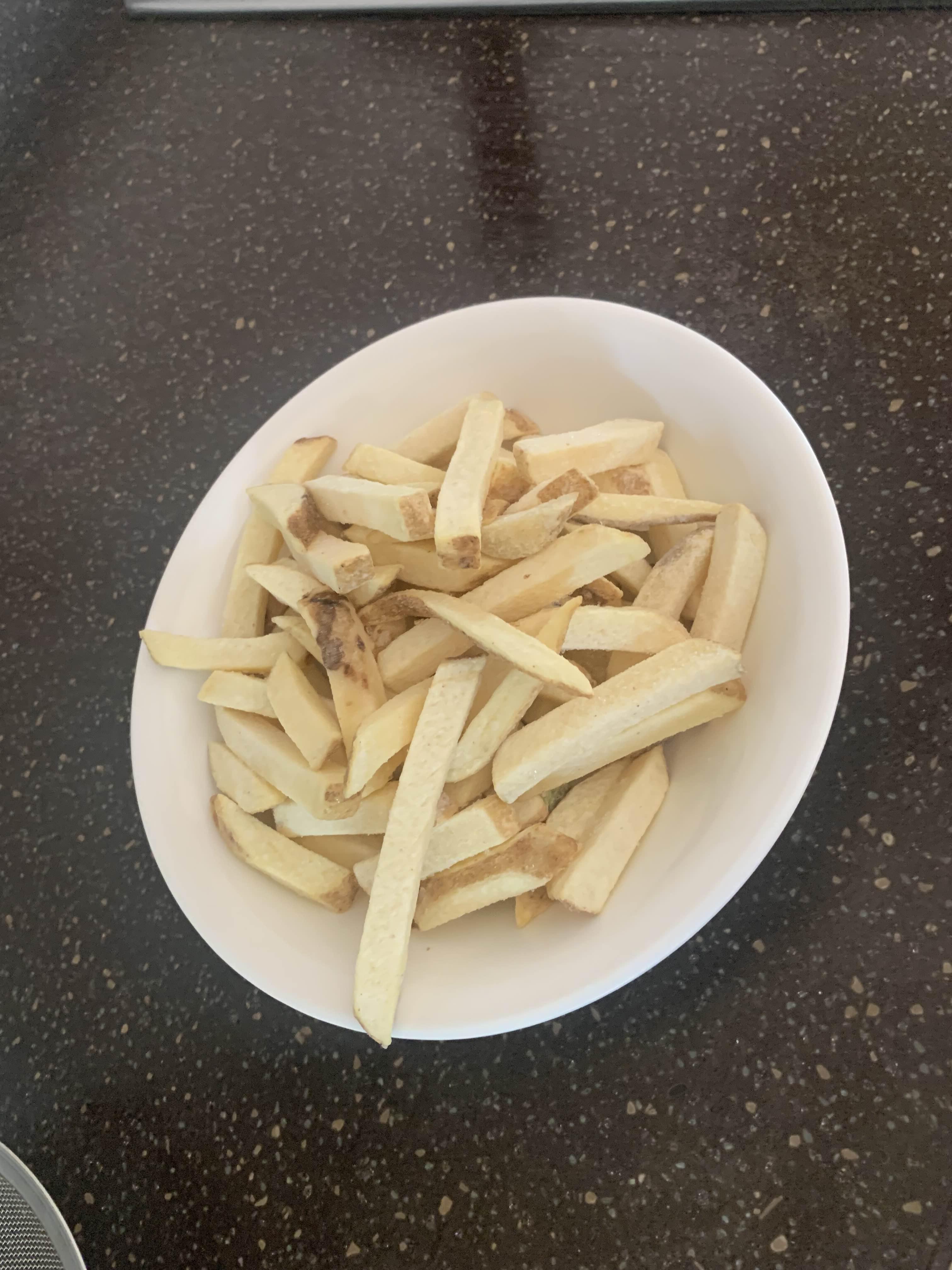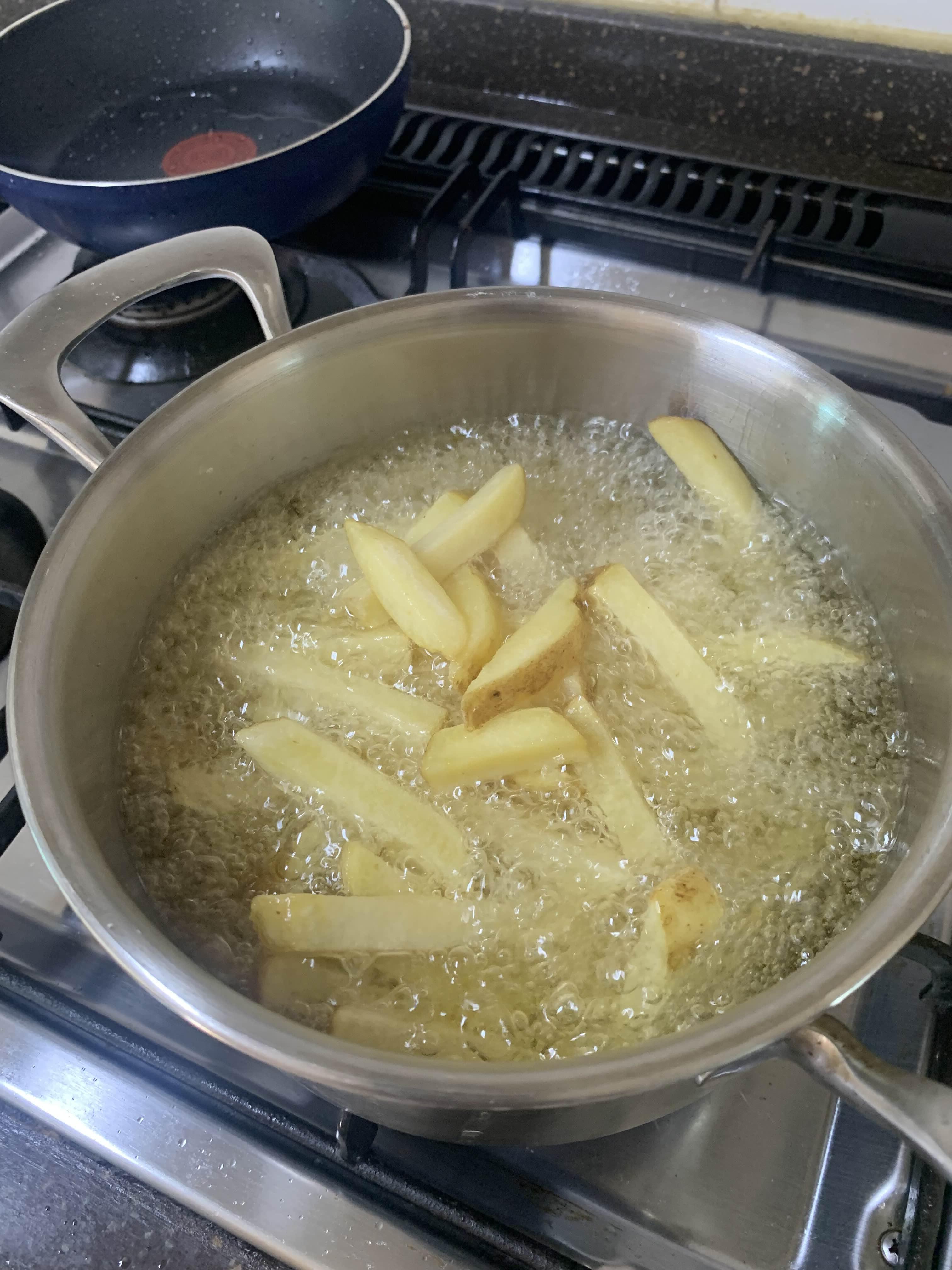 냉동 감자를 그대로.... 기름에 투하!!! 별도 해동이 필요하지 않아서.... 조리하기 편하다. 감자에 수분이 많이 있지 않아... 기름에 넣어도 기림이 튀는 게 적다.