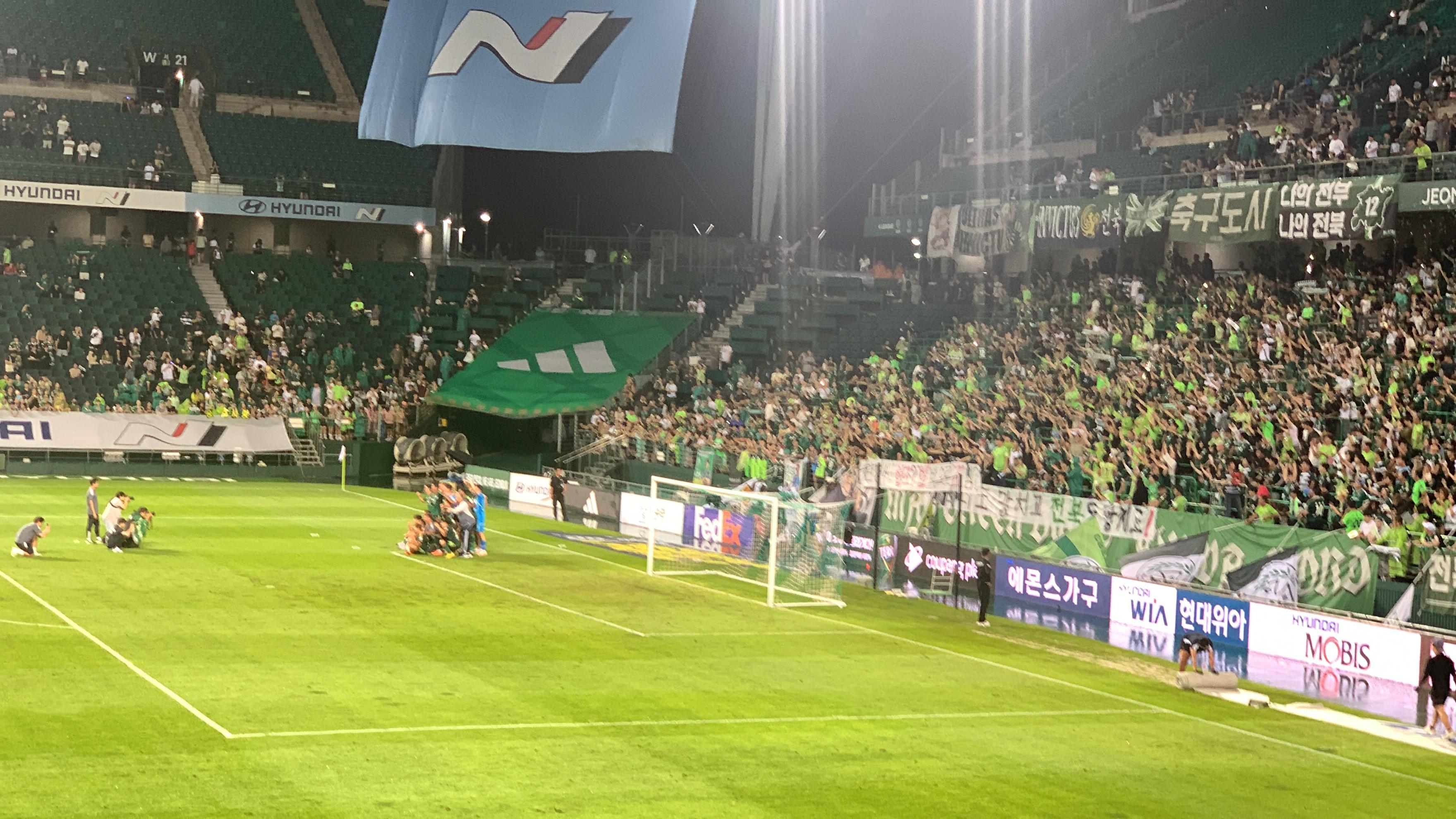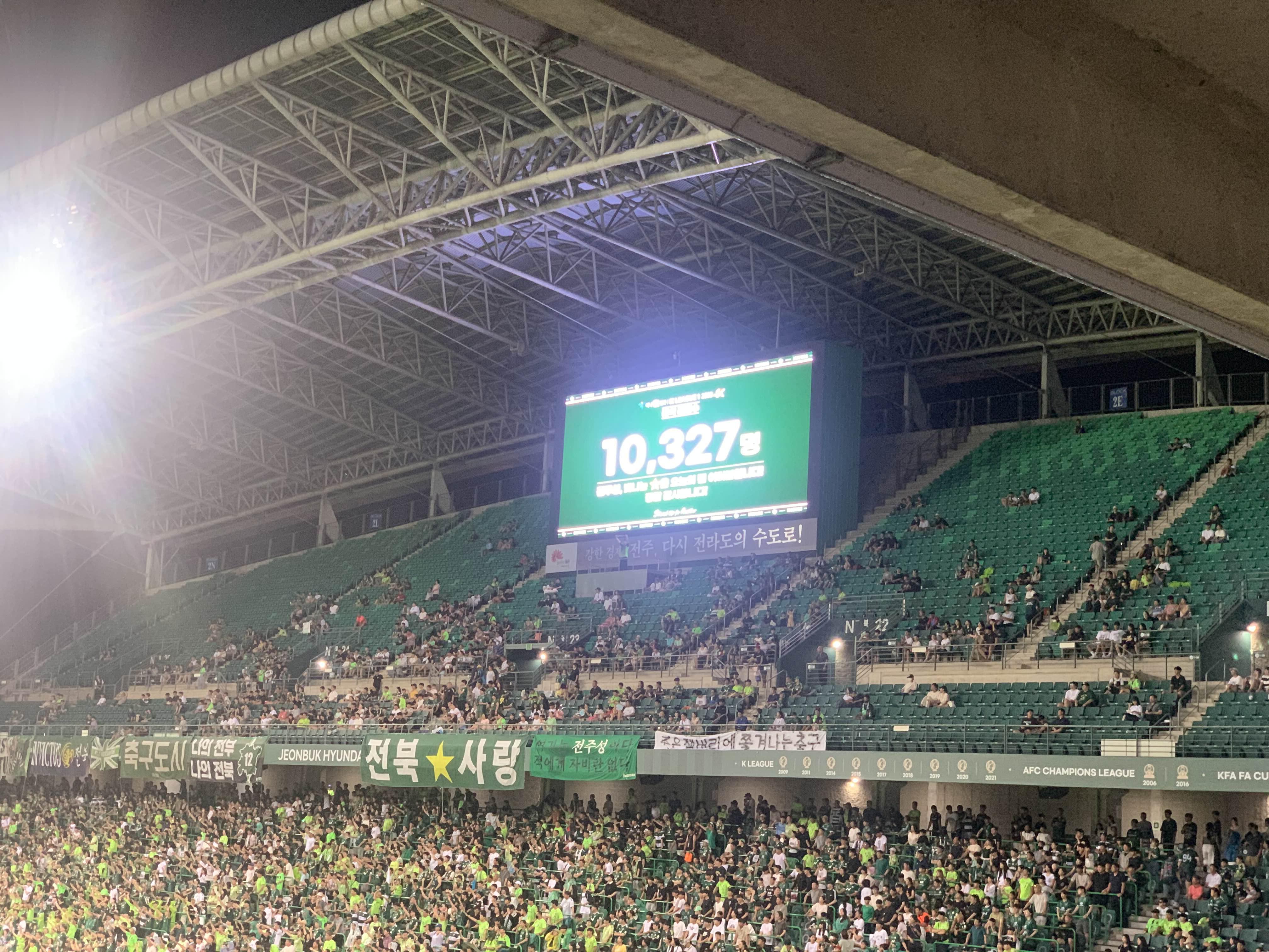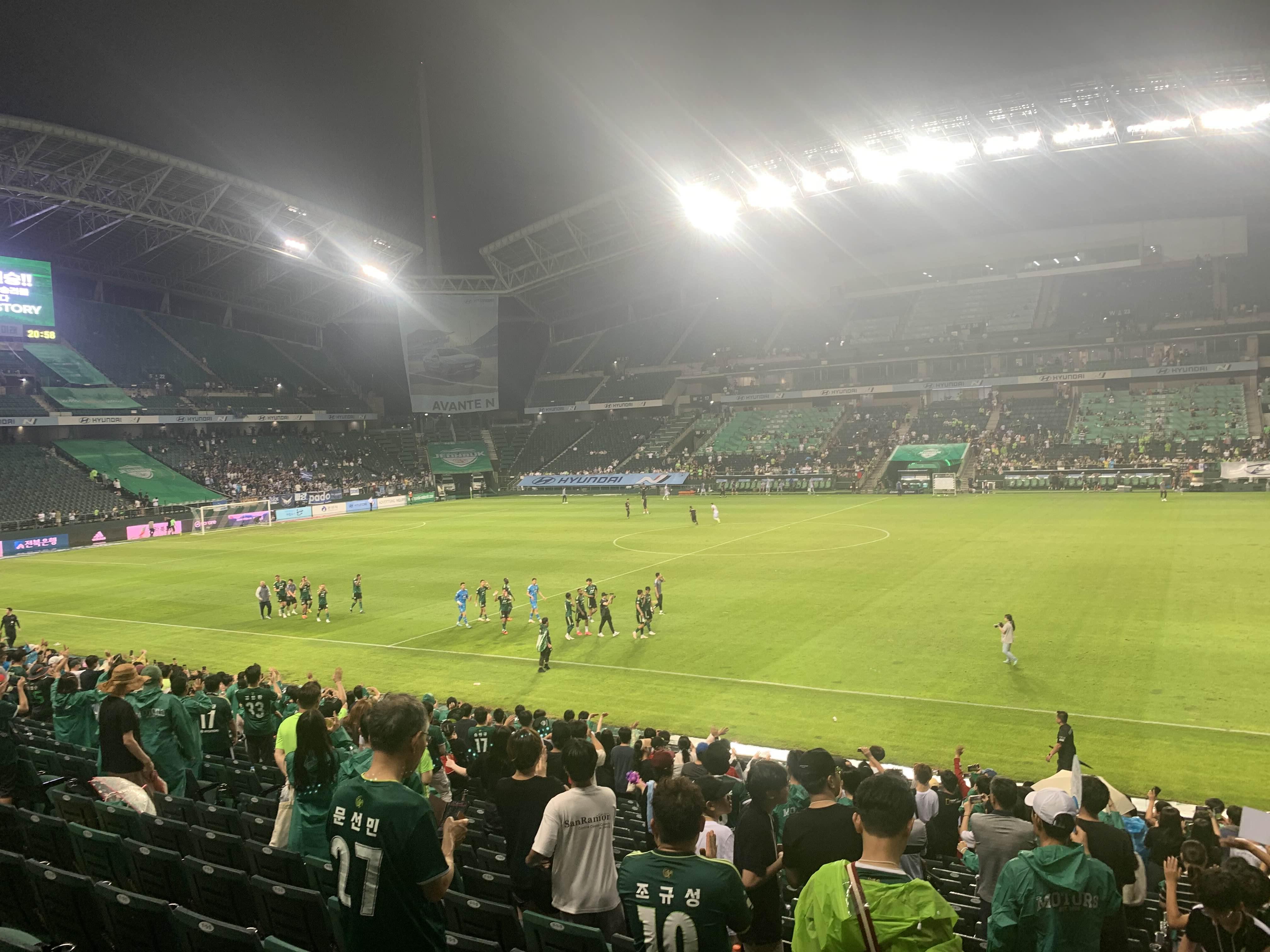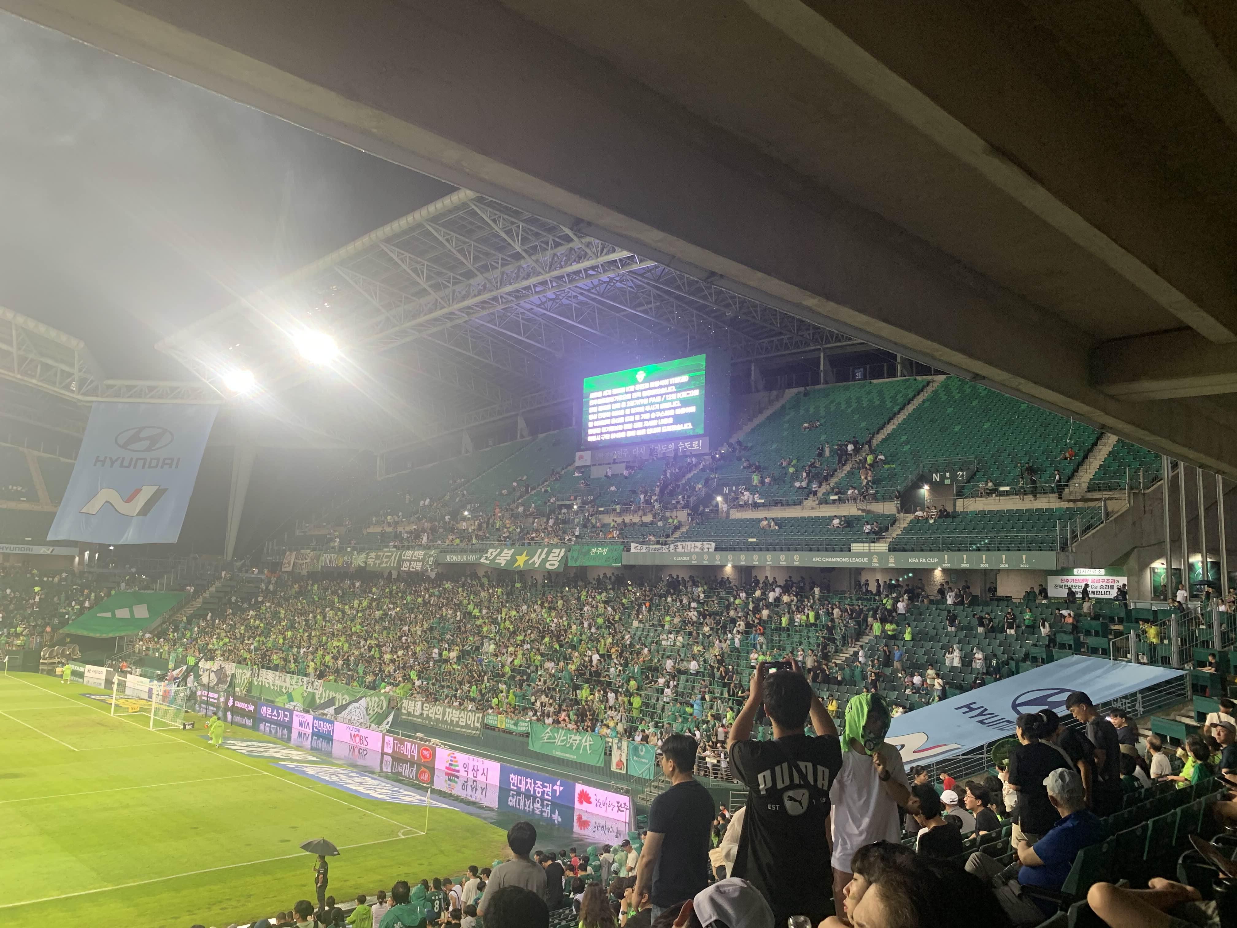 전반전이 끝나고.... 세계 잼버리 K팝 공연과 퇴영식이... 전주월드컵경기장에서 진행한다는 안내문이 전광판에 보이더군요. 그리고... 예정돼 있던 FA컵 준결승과 26 라인드 K리그 경기는 진행이 어려운? 안내문이....