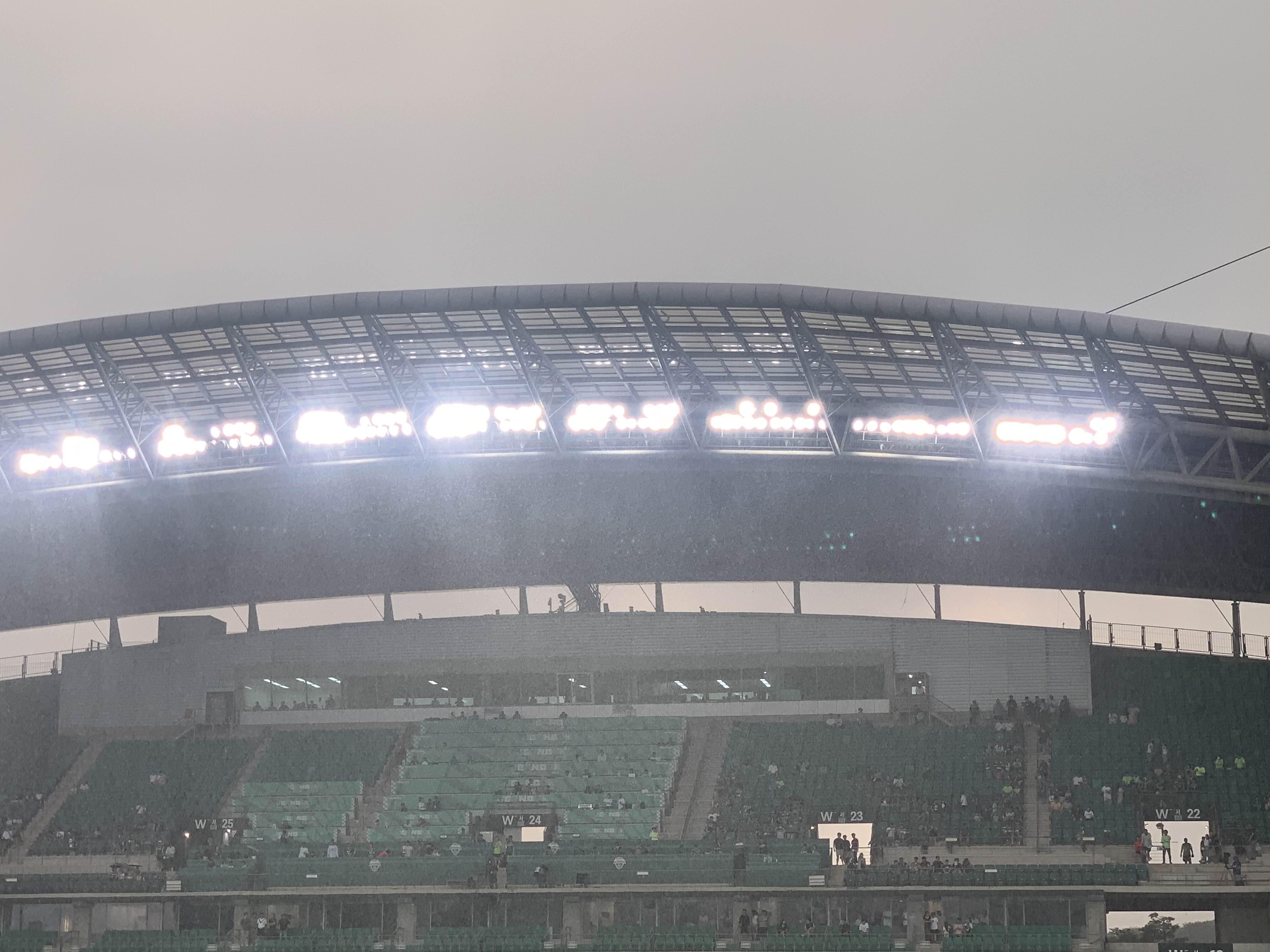 전반전이 시작하였는데.... 엄청난 양의 비가 내리더군요. 바람도 많이 불고..... 전반전 경기는 수중전이 되어 버렸습니다. 올해 구입한 시즌권 자리는.... 1층 지붕이 있는 자리라... 비를 직접적으로 내리는 자리가 아니어서 좋더군요.ㅎㅎ