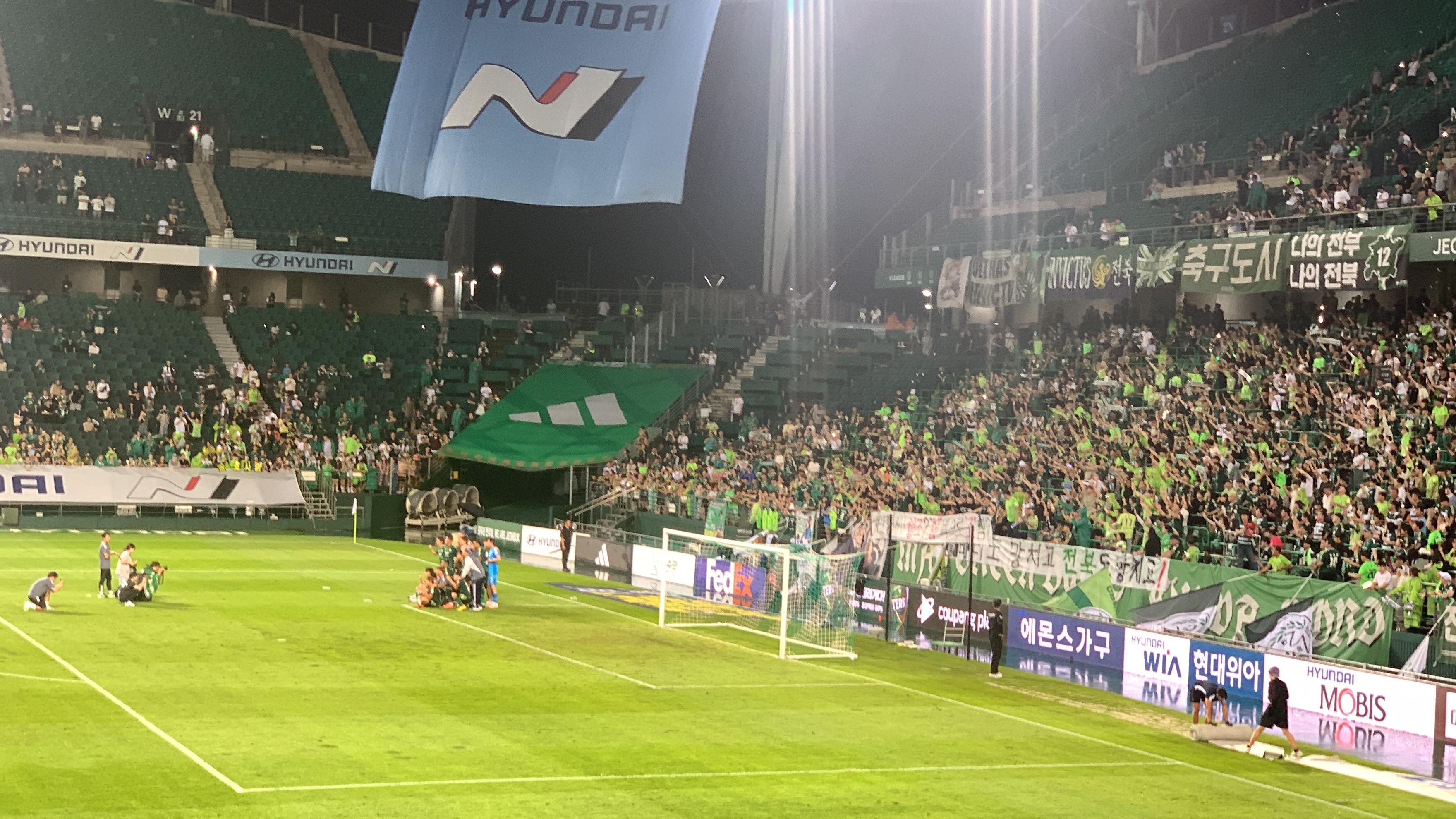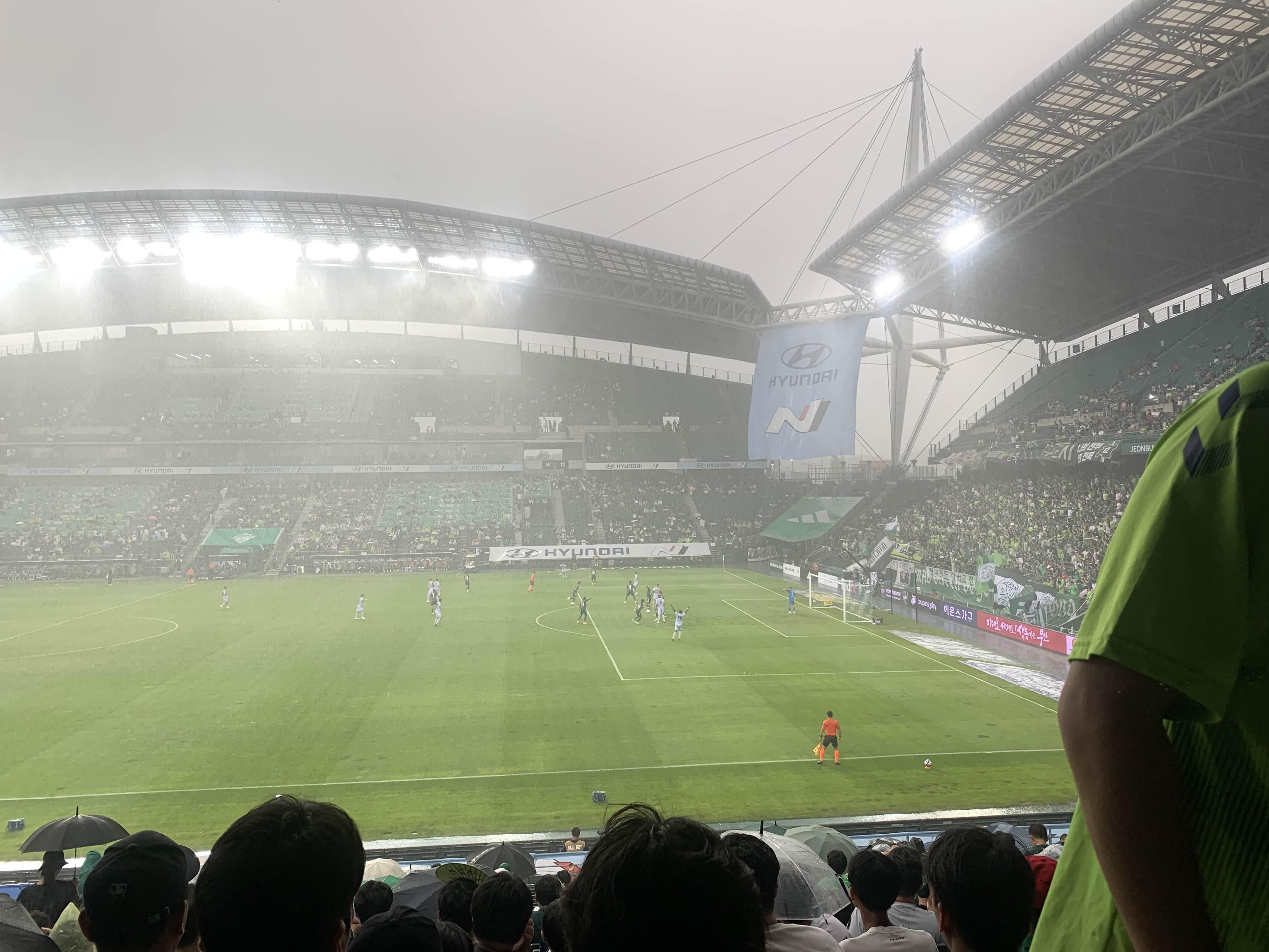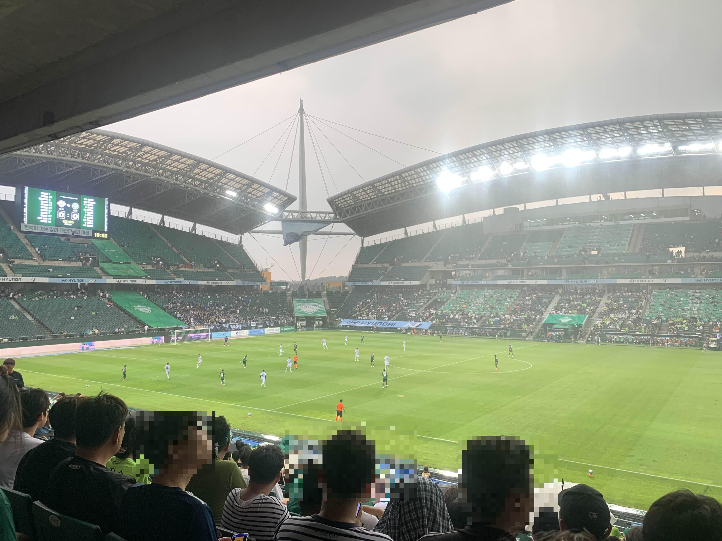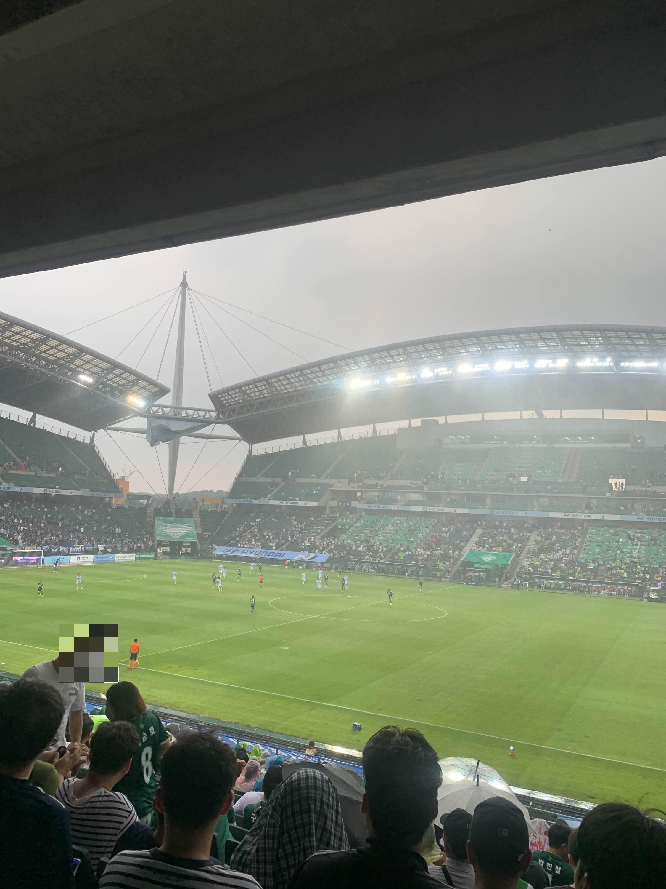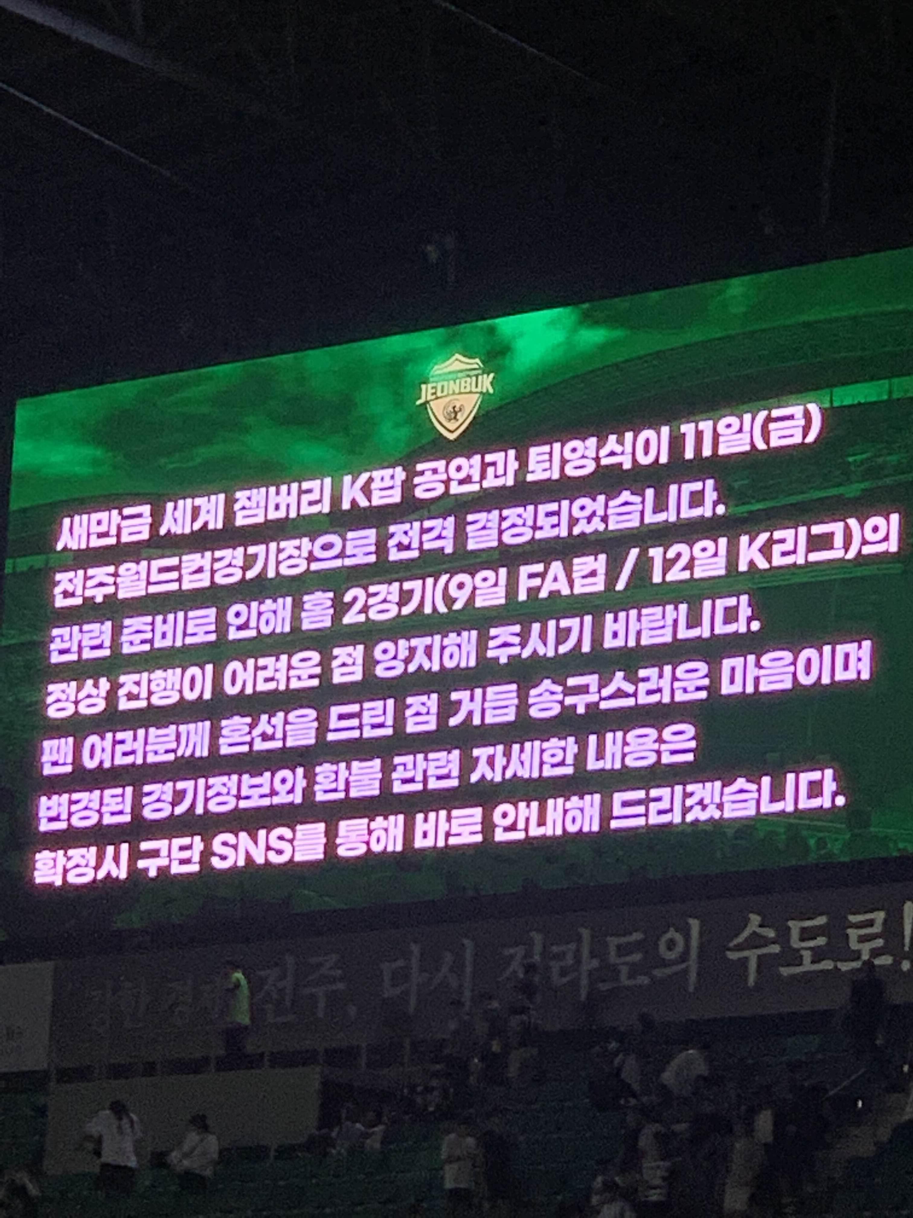 전반전이 끝나고.... 세계 잼버리 K팝 공연과 퇴영식이... 전주월드컵경기장에서 진행한다는 안내문이 전광판에 보이더군요. 그리고... 예정돼 있던 FA컵 준결승과 26 라인드 K리그 경기는 진행이 어려운? 안내문이....