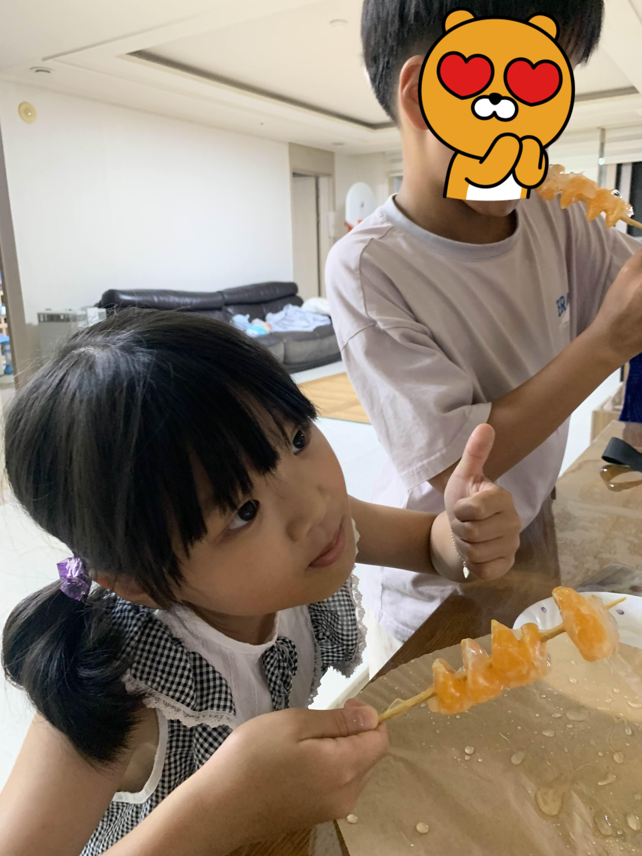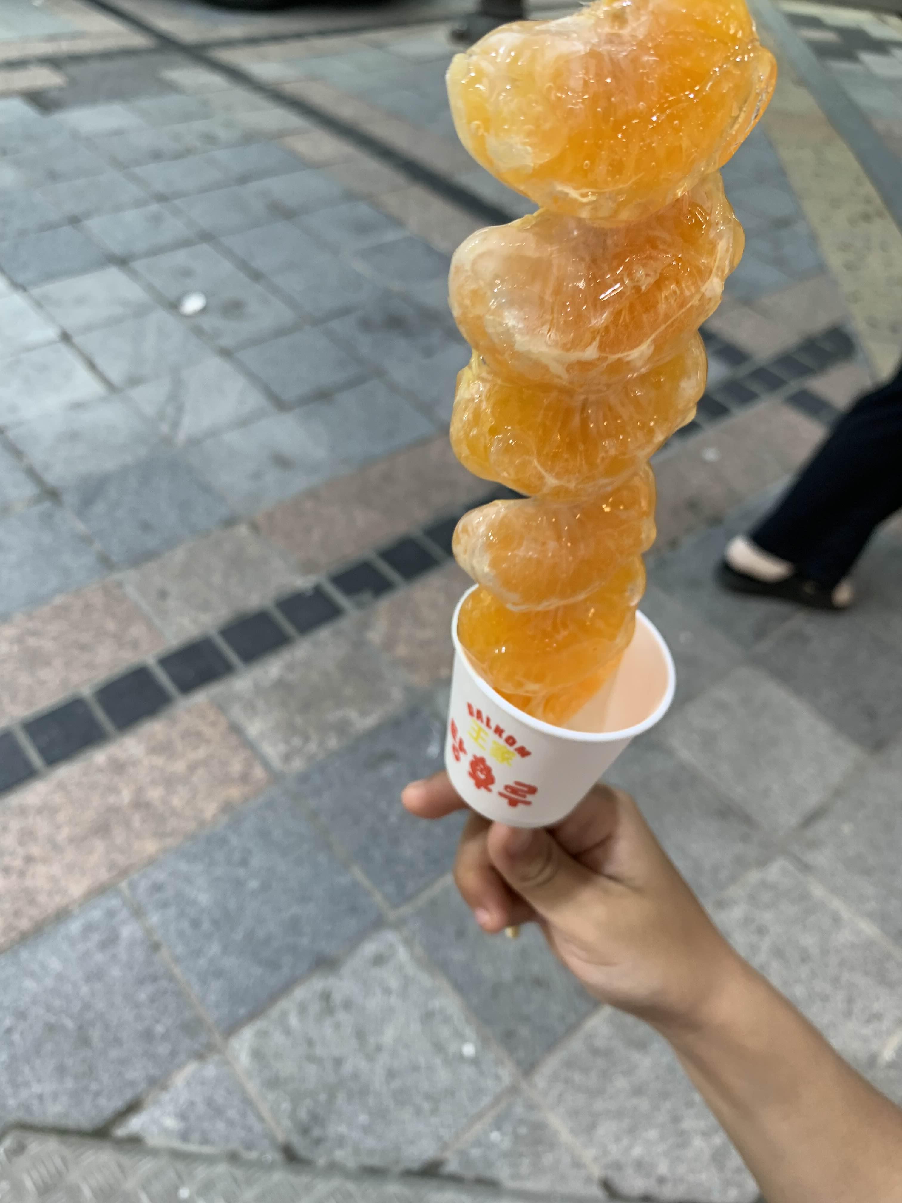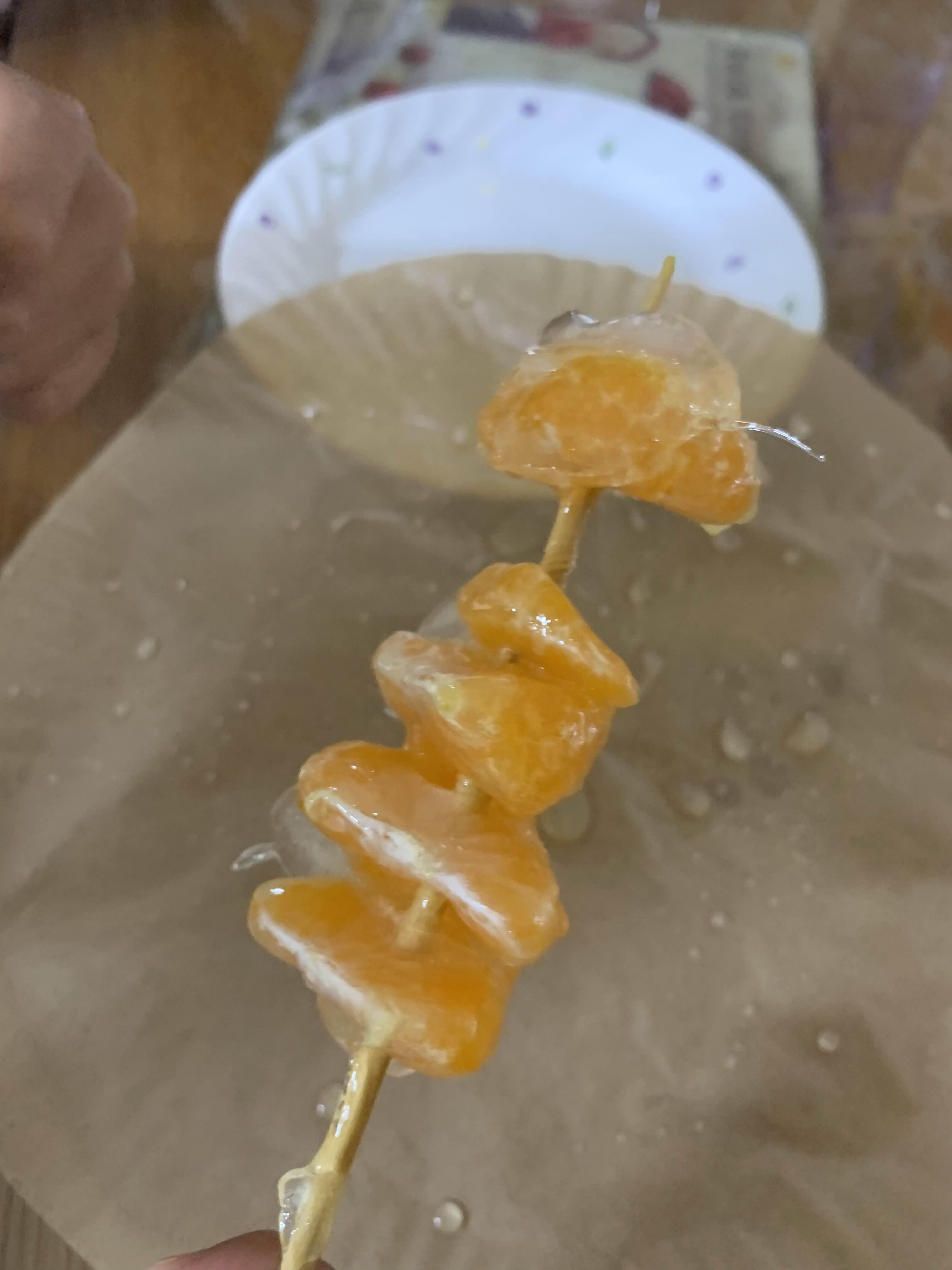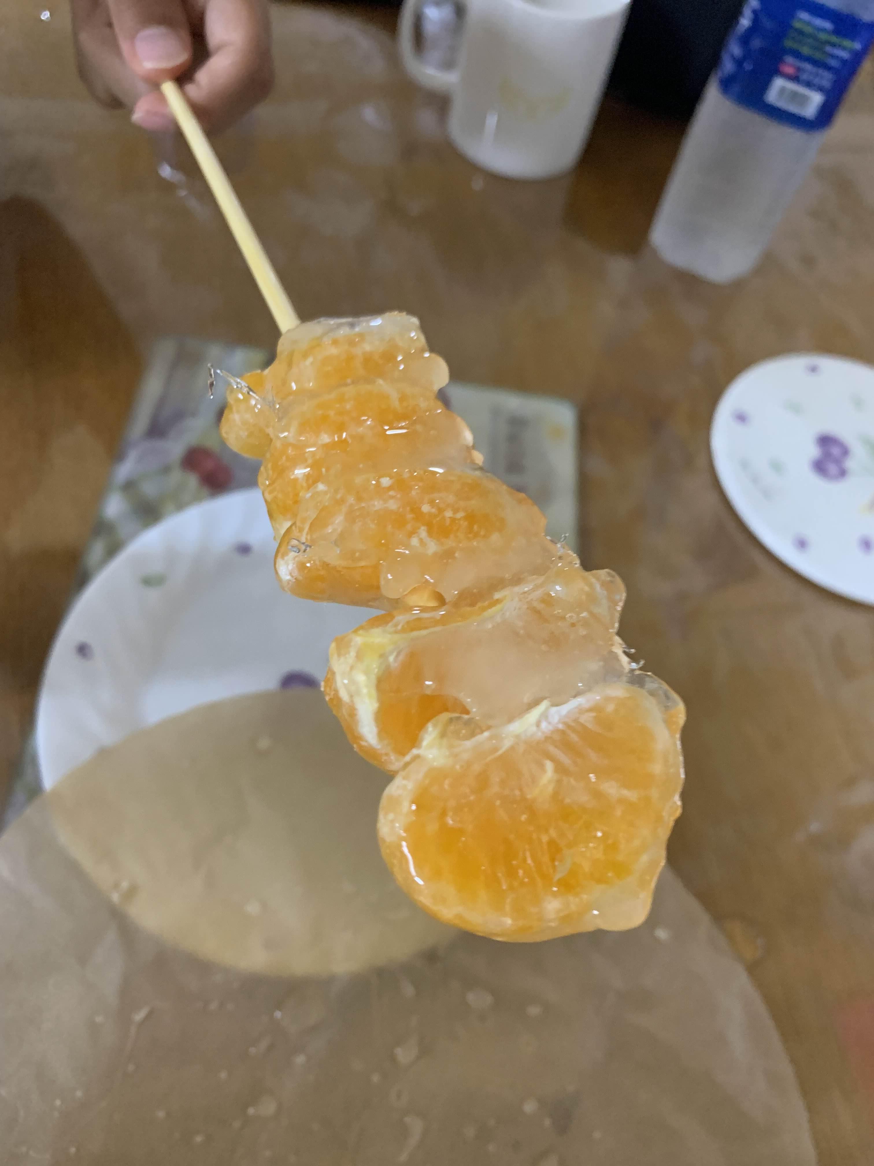 달달한 귤에 탕후루 소스(설탕물)가 딱딱하게 잘 묻어있다.ㅎㅎ
