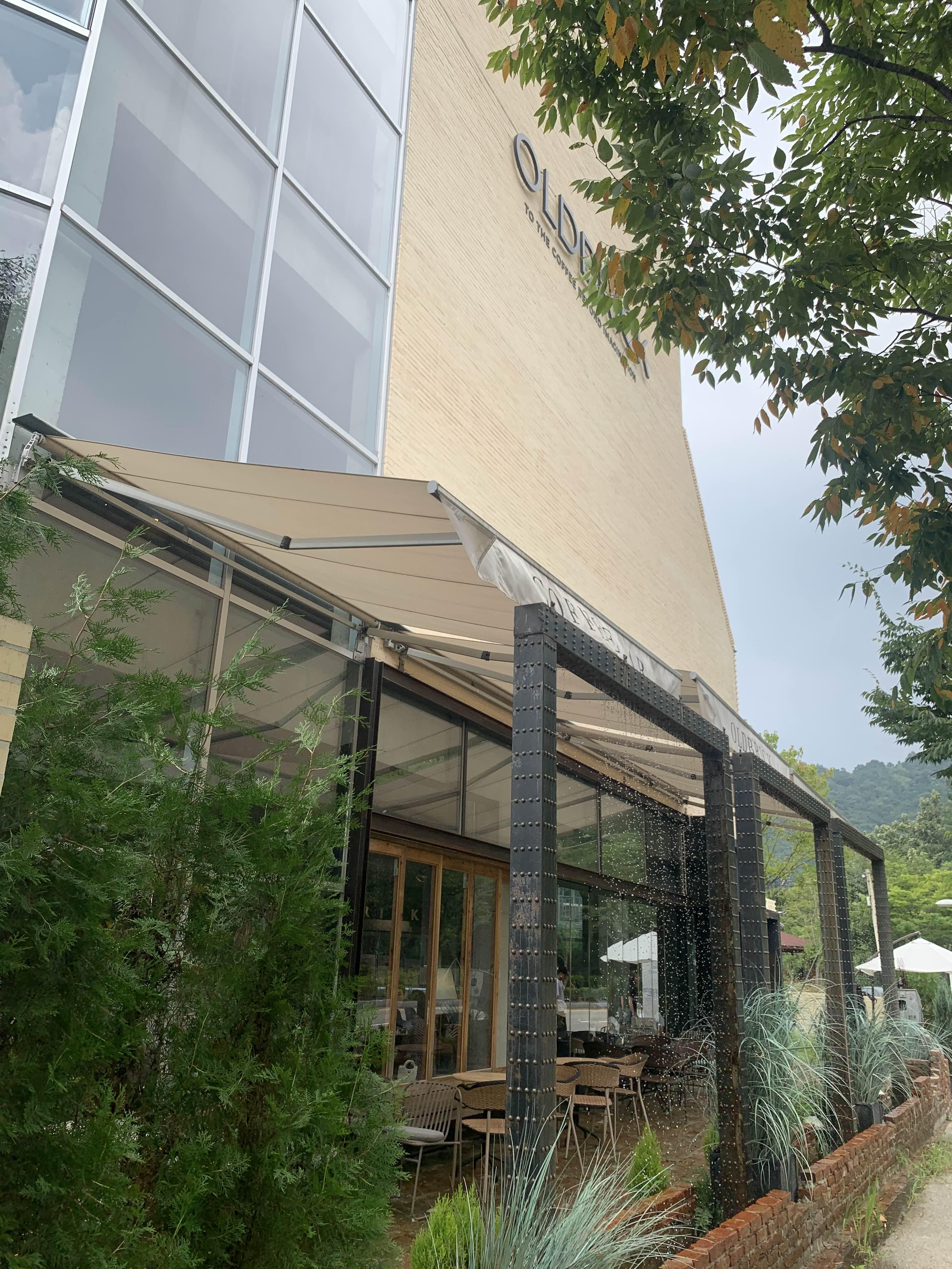 무더운 여름이라... 카페 전면에는 분수.... 아래에서 올라오는 분수가 아닌, 위에서 떨어지는 분수가 눈에 들어온다.