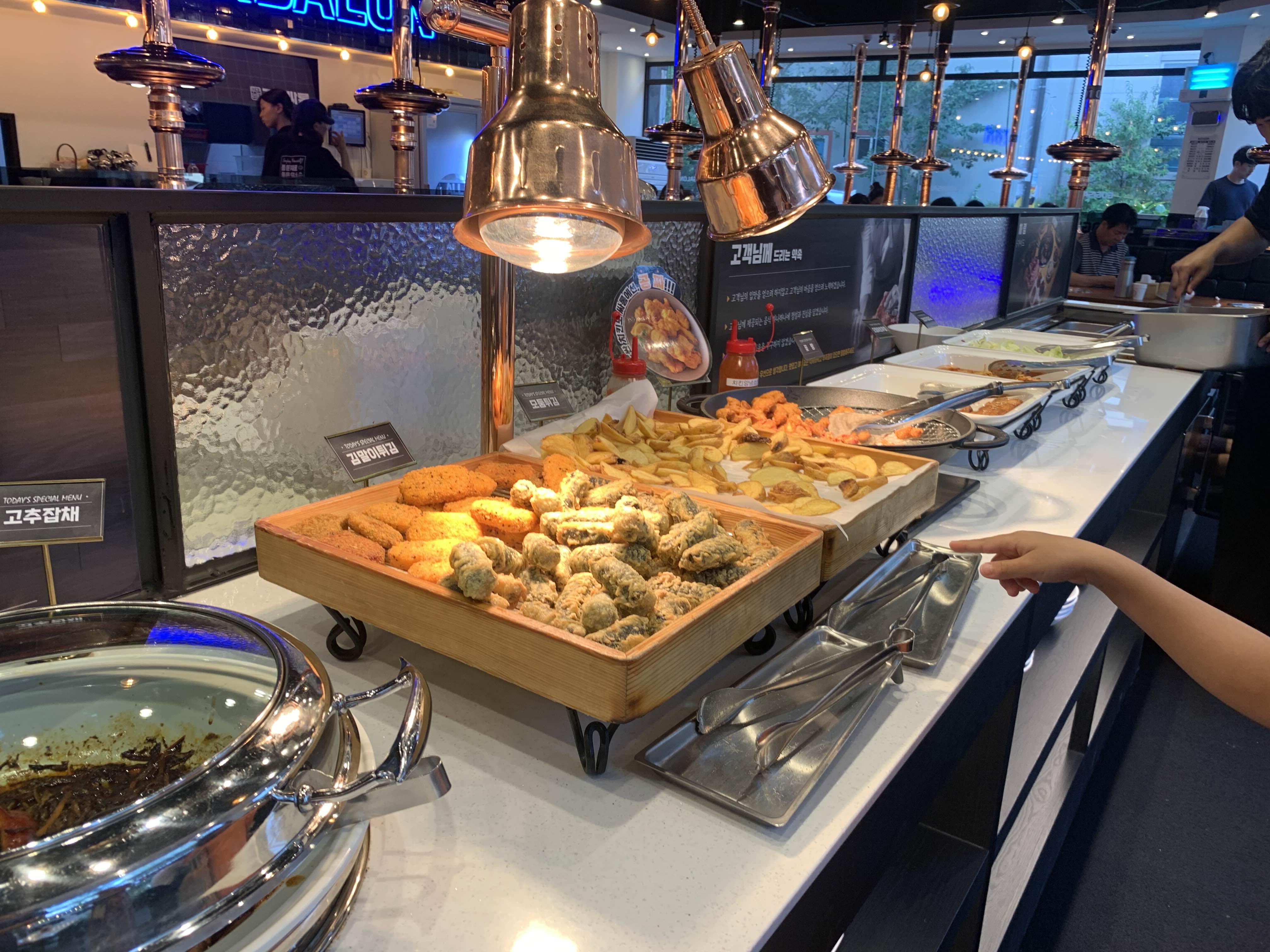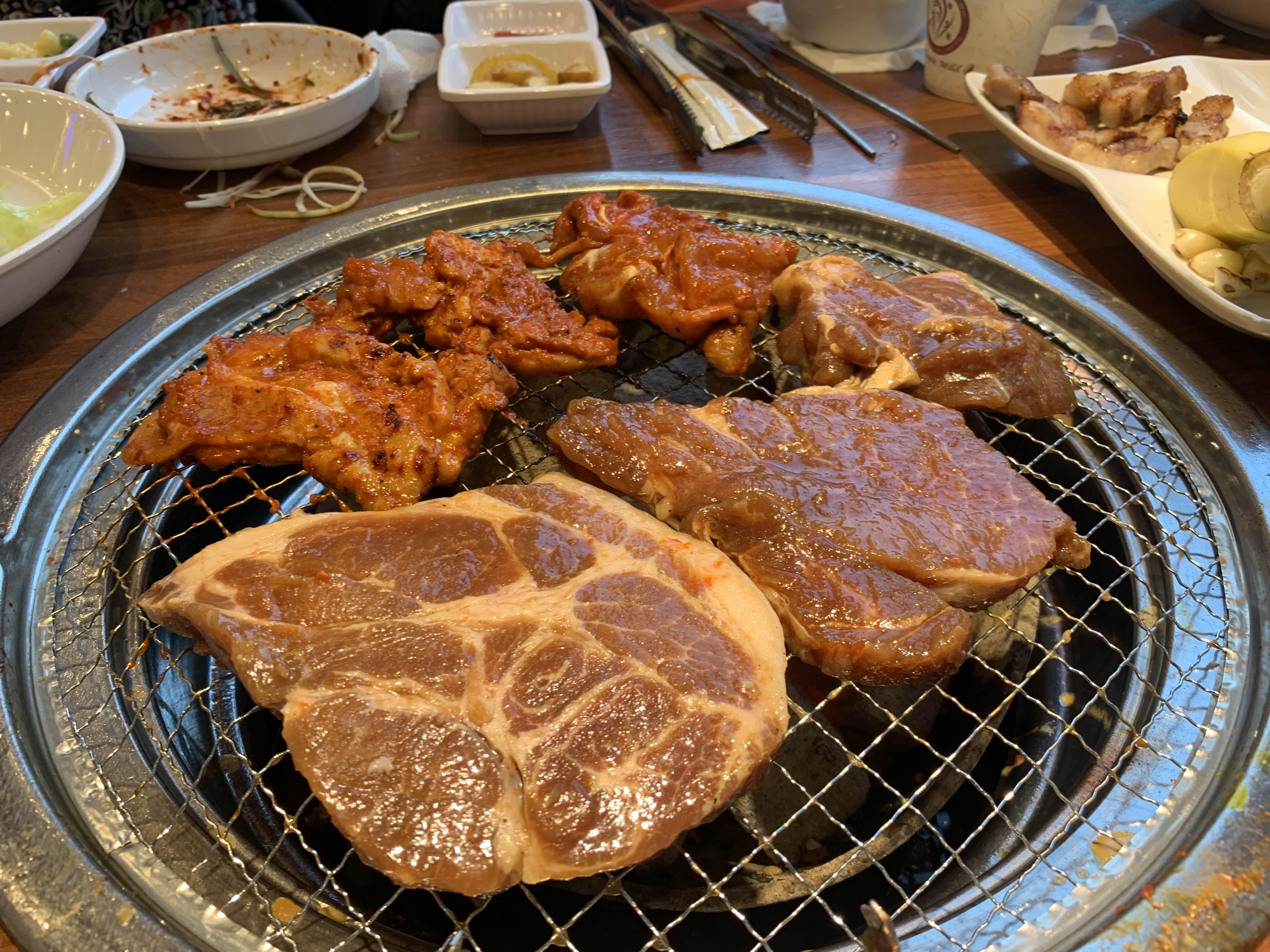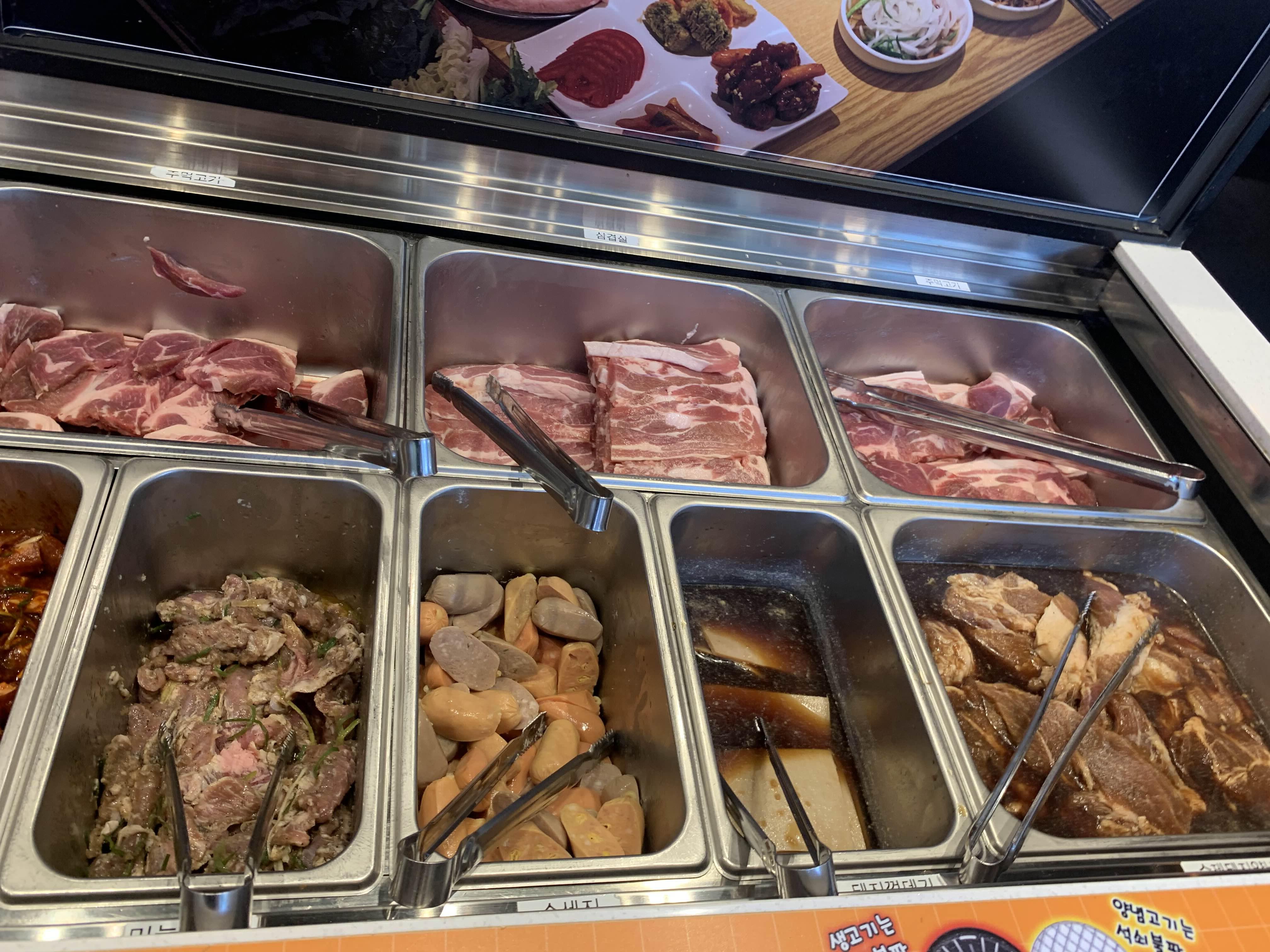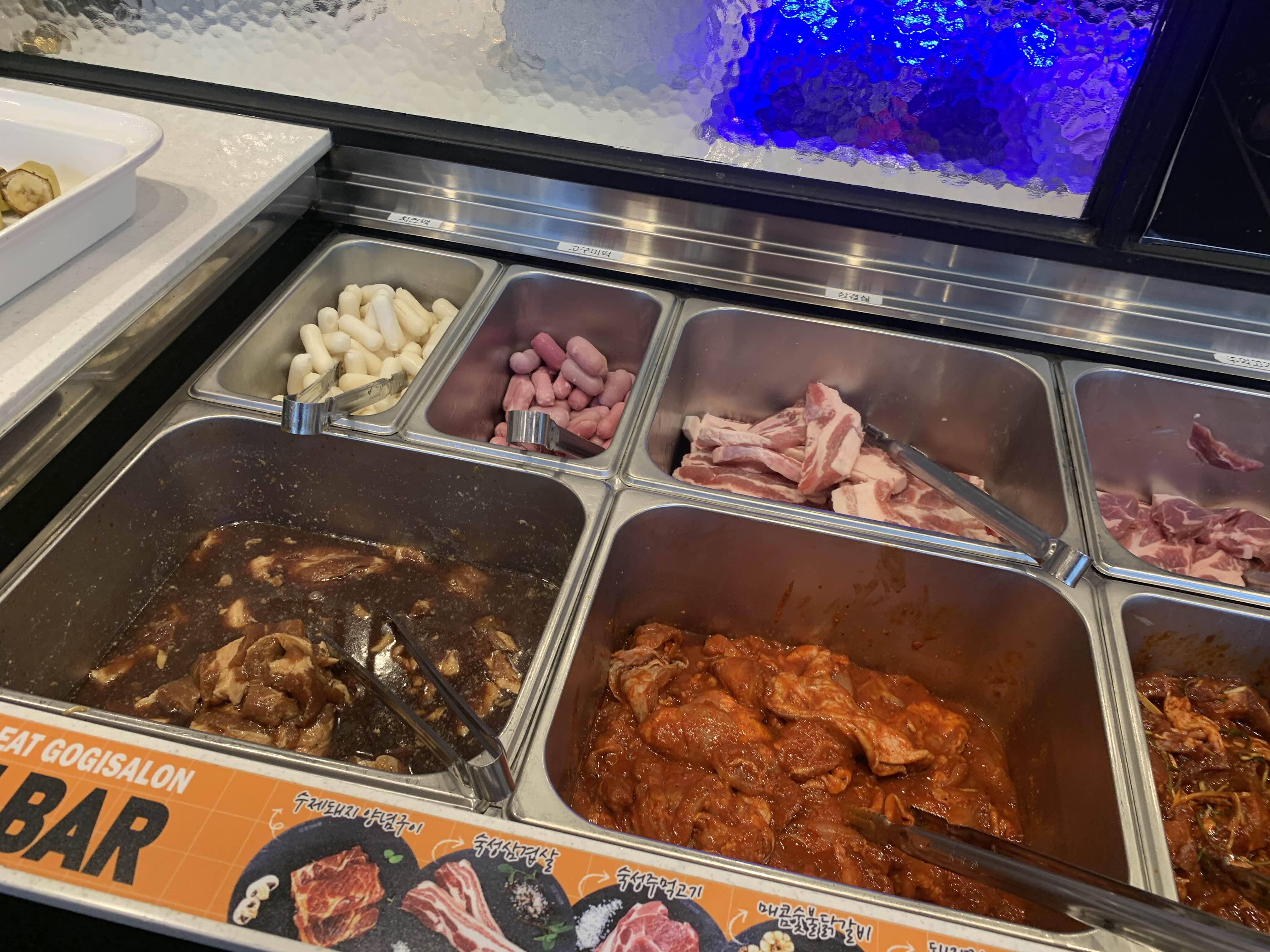 구워 먹을 수 있는 고기와 미리 조리된 음식으로 구분되어 준비되어 있습니다. 고기는 먼저 양념이 아닌, 삼겹살 위주로 한번 구워 먹고... 그 후 양념불판을 바꾸어 구워 먹는 스타일입니다.