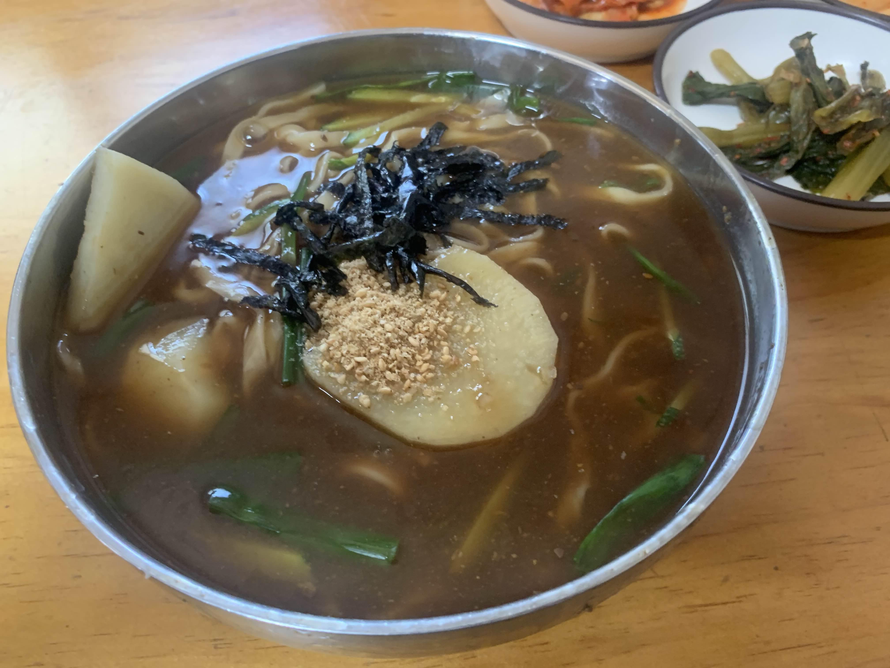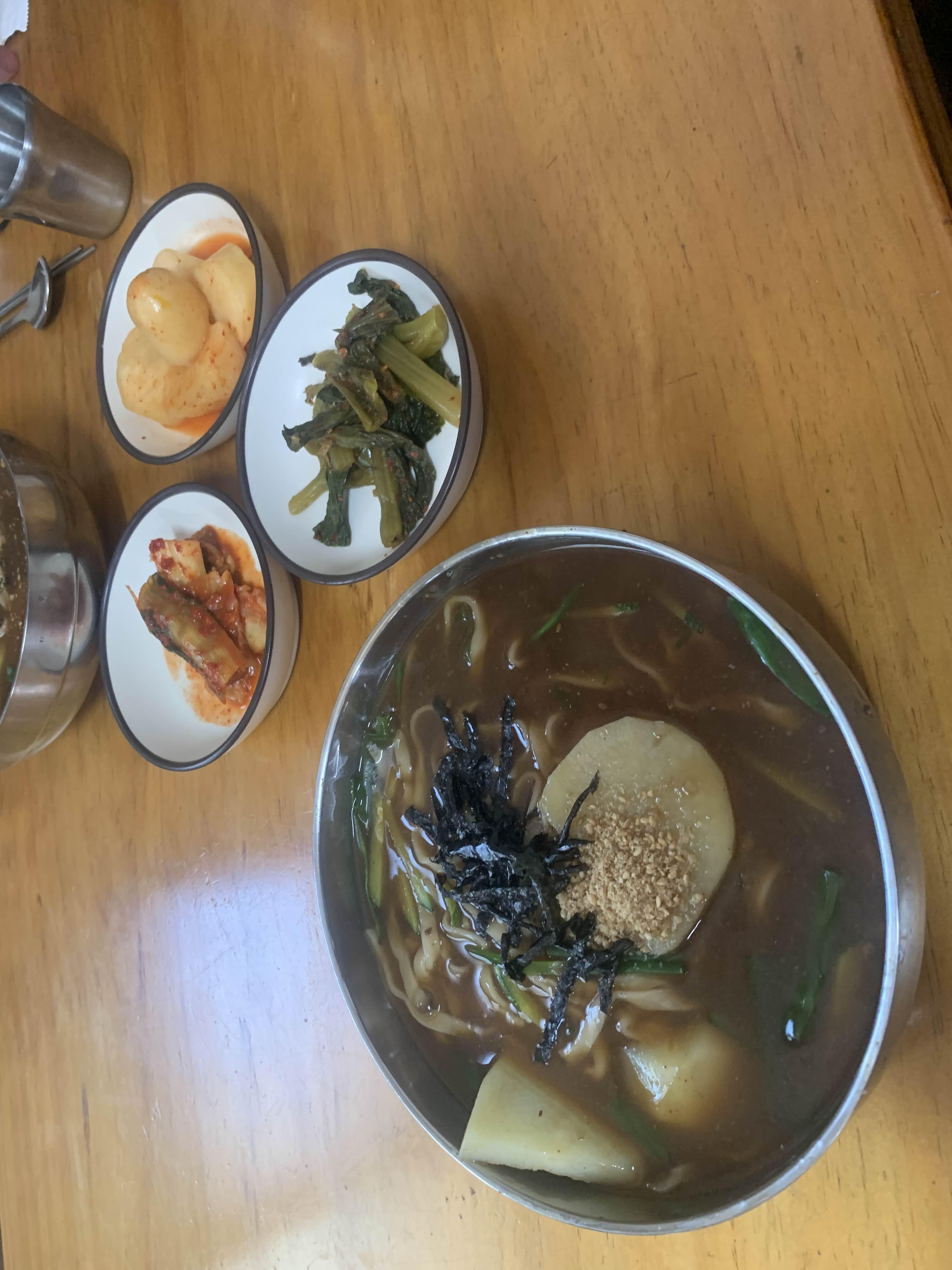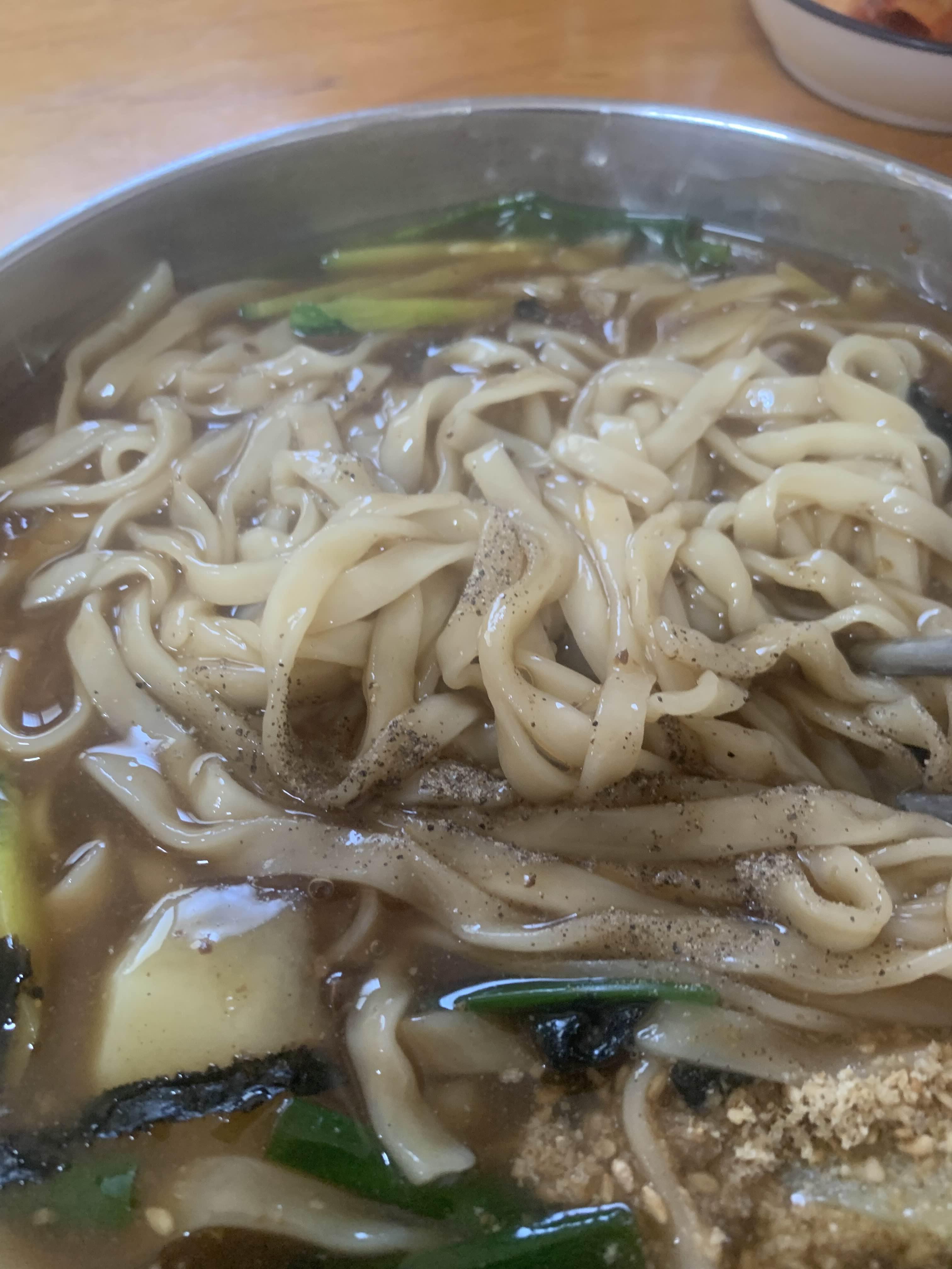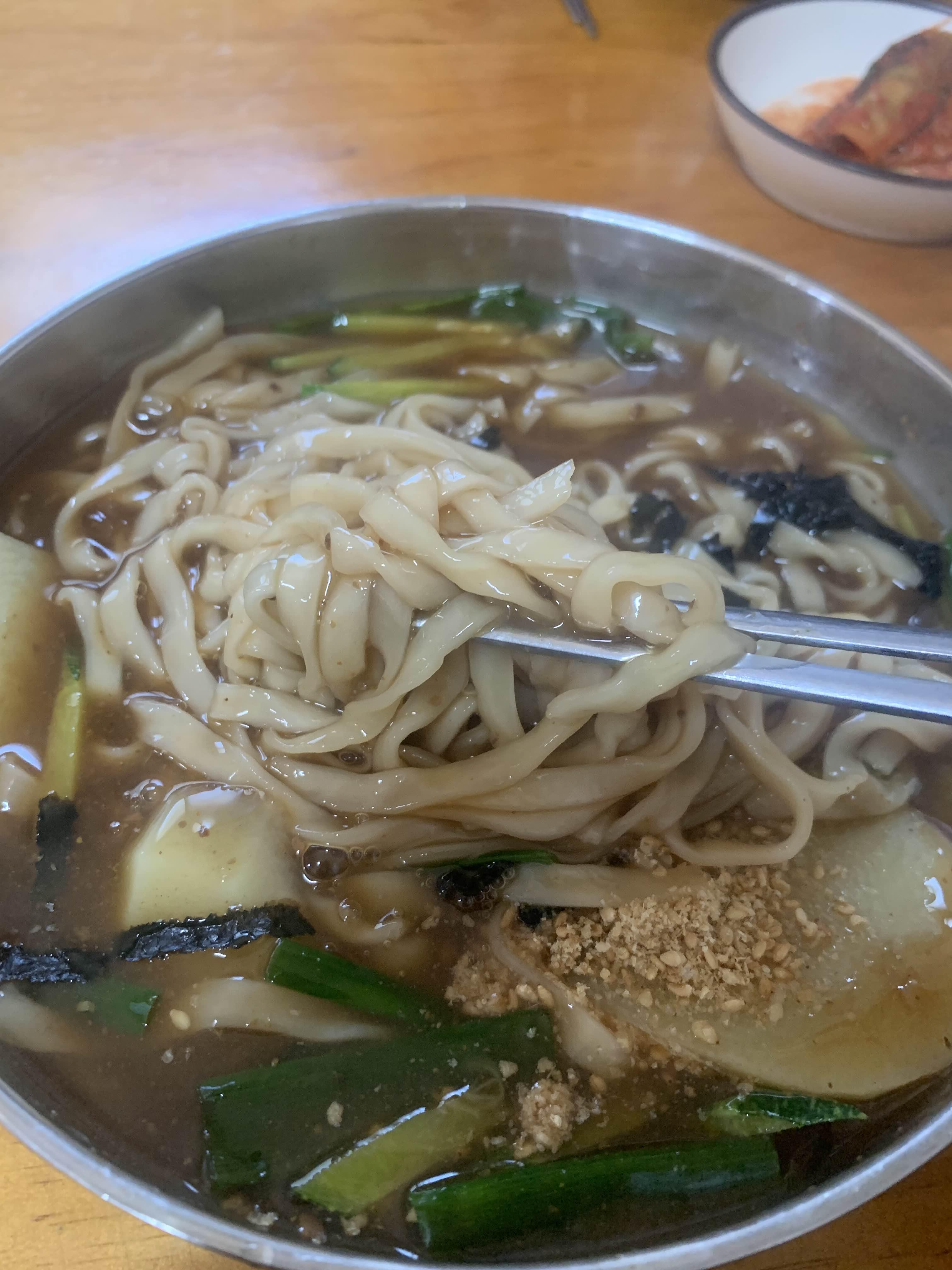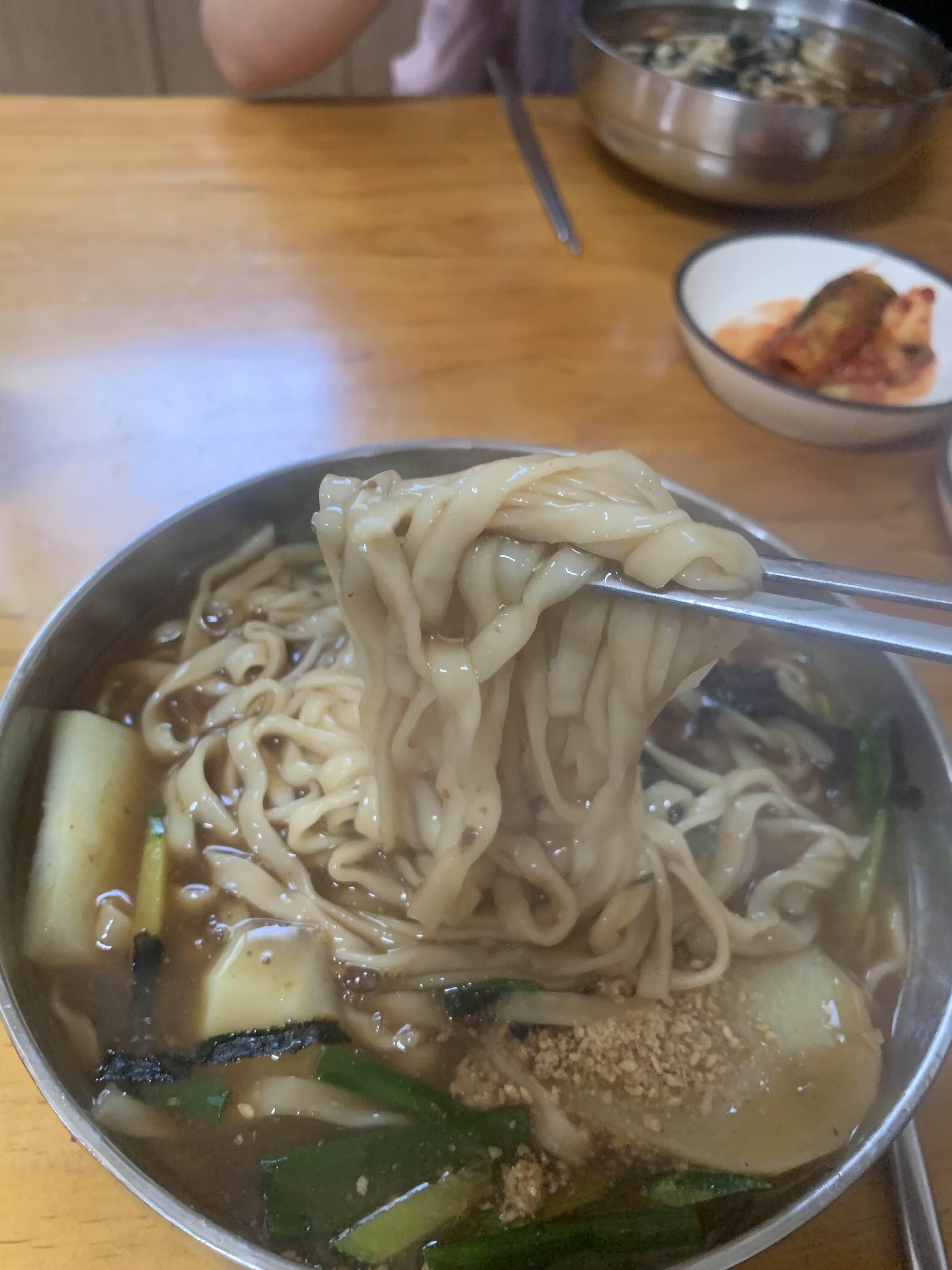 지난 방문 시 보리밥을 먹어서..... 보리밥이 아닌, 장 칼국수로 주문해 보았다. 동해/삼척의 장 칼국수는 일반적으로 붉은색의 고추장 베이스의 장 칼국수가 많은데, 이 식당은... 고추장이 아닌 된장 느낌의 장 칼국수 스타일이다.