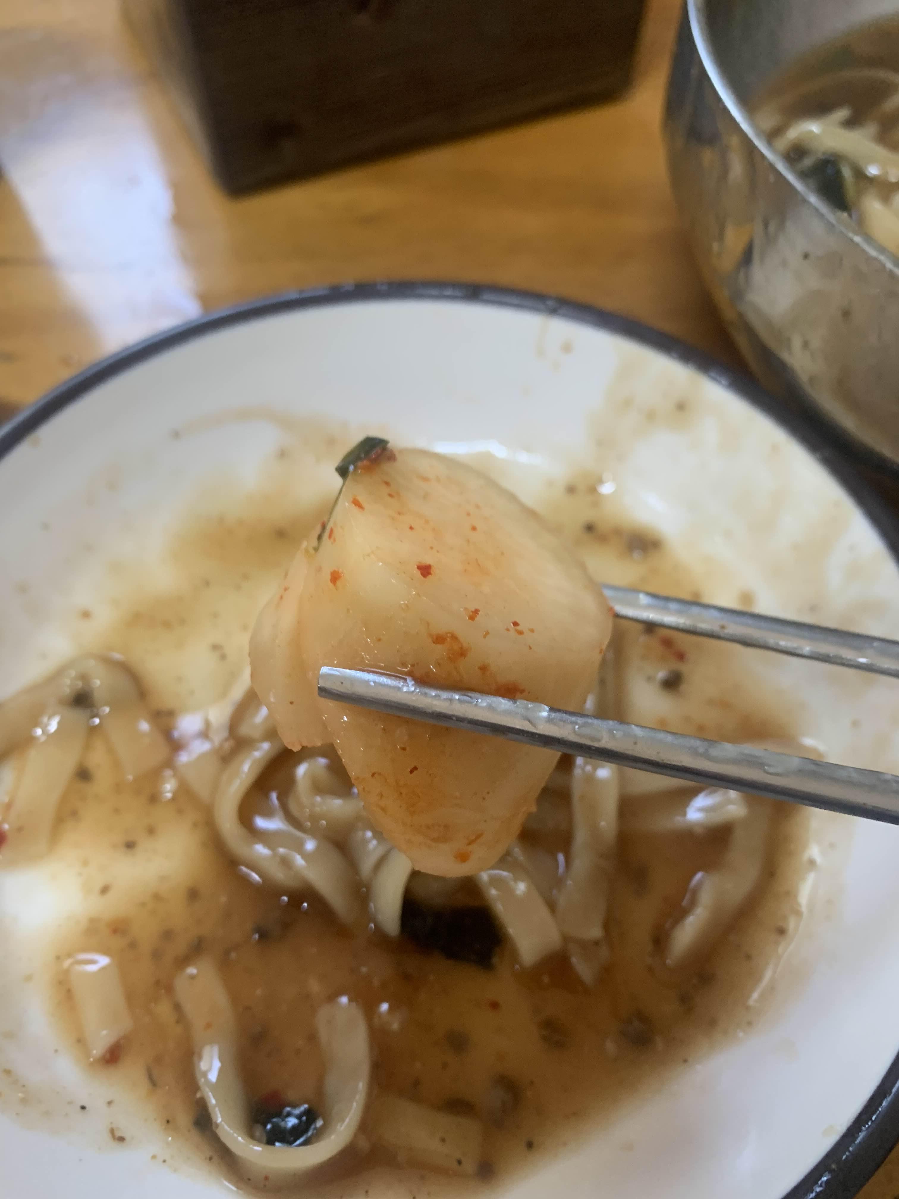 칼국수에 후츠만 적당히 뿌려서... 밑반찬으로 나온 김치를 올려서 먹으면 참 맛남!