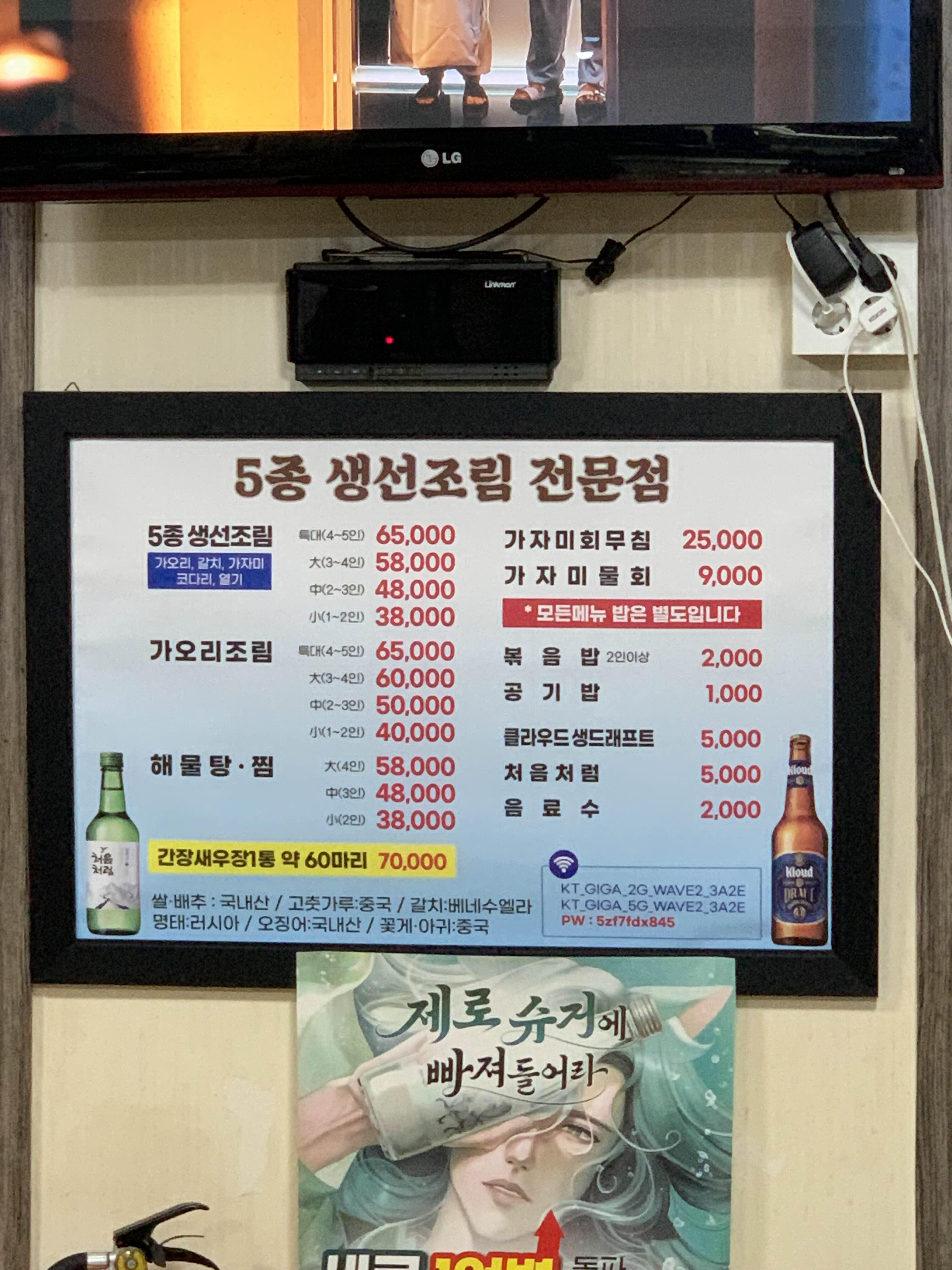 메뉴판의 가장 상단에 있는.... 5종 생선조림 큰 거로 하나 주문했다.