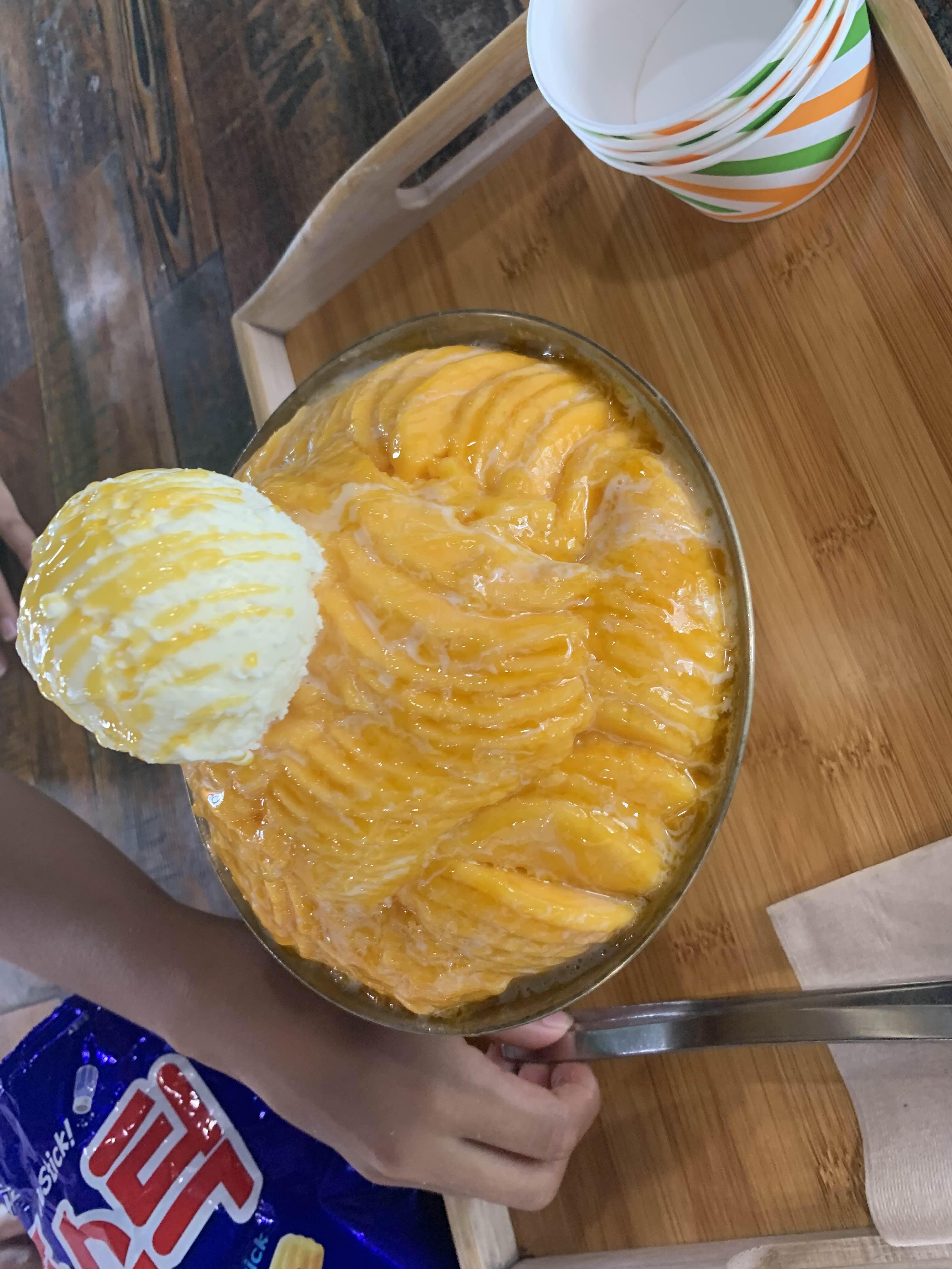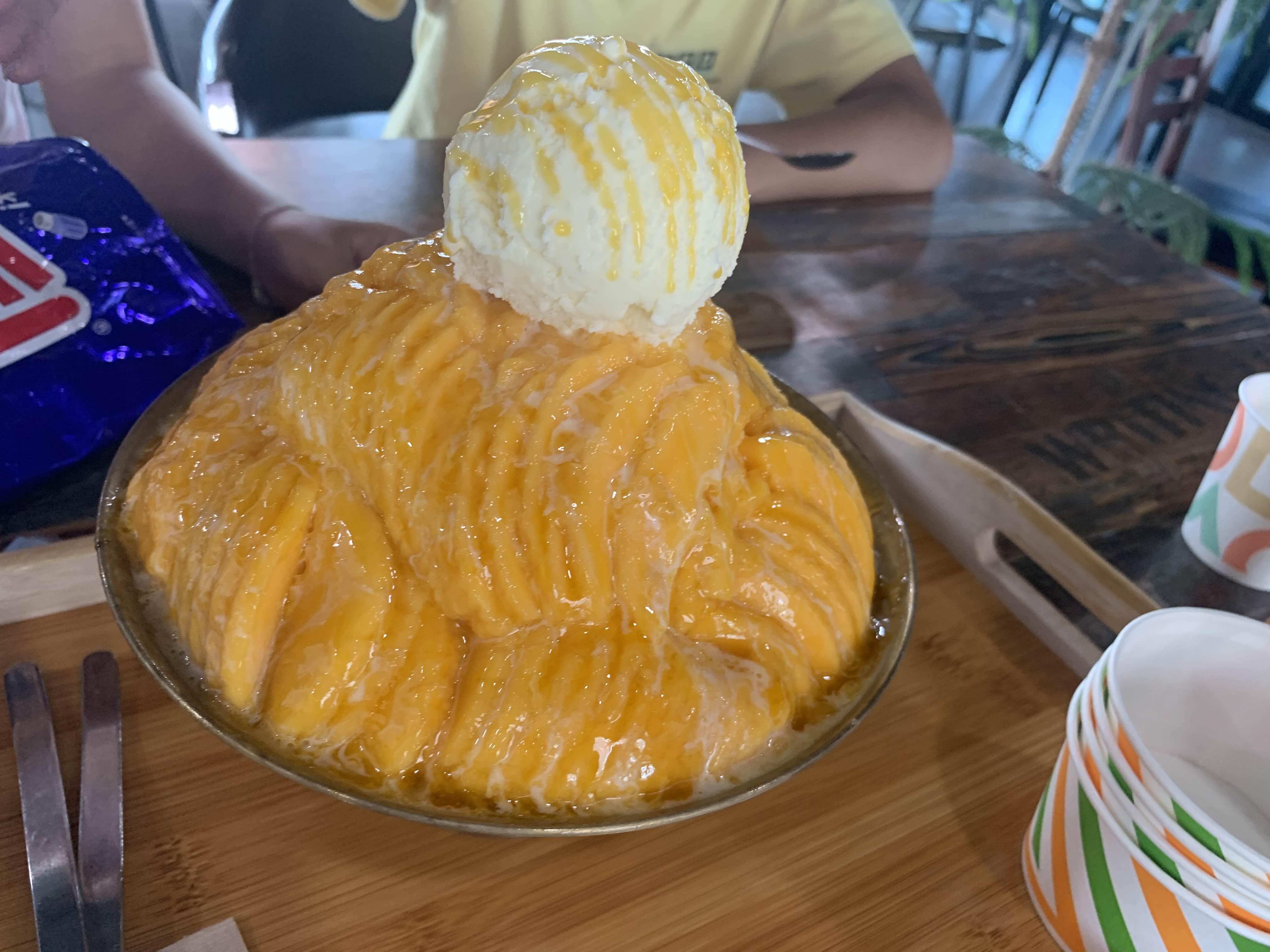 빙수 중앙에 아이스크림.... 그리고, 망고.... 위 연유가 넉넉히 뿌려져 있다.