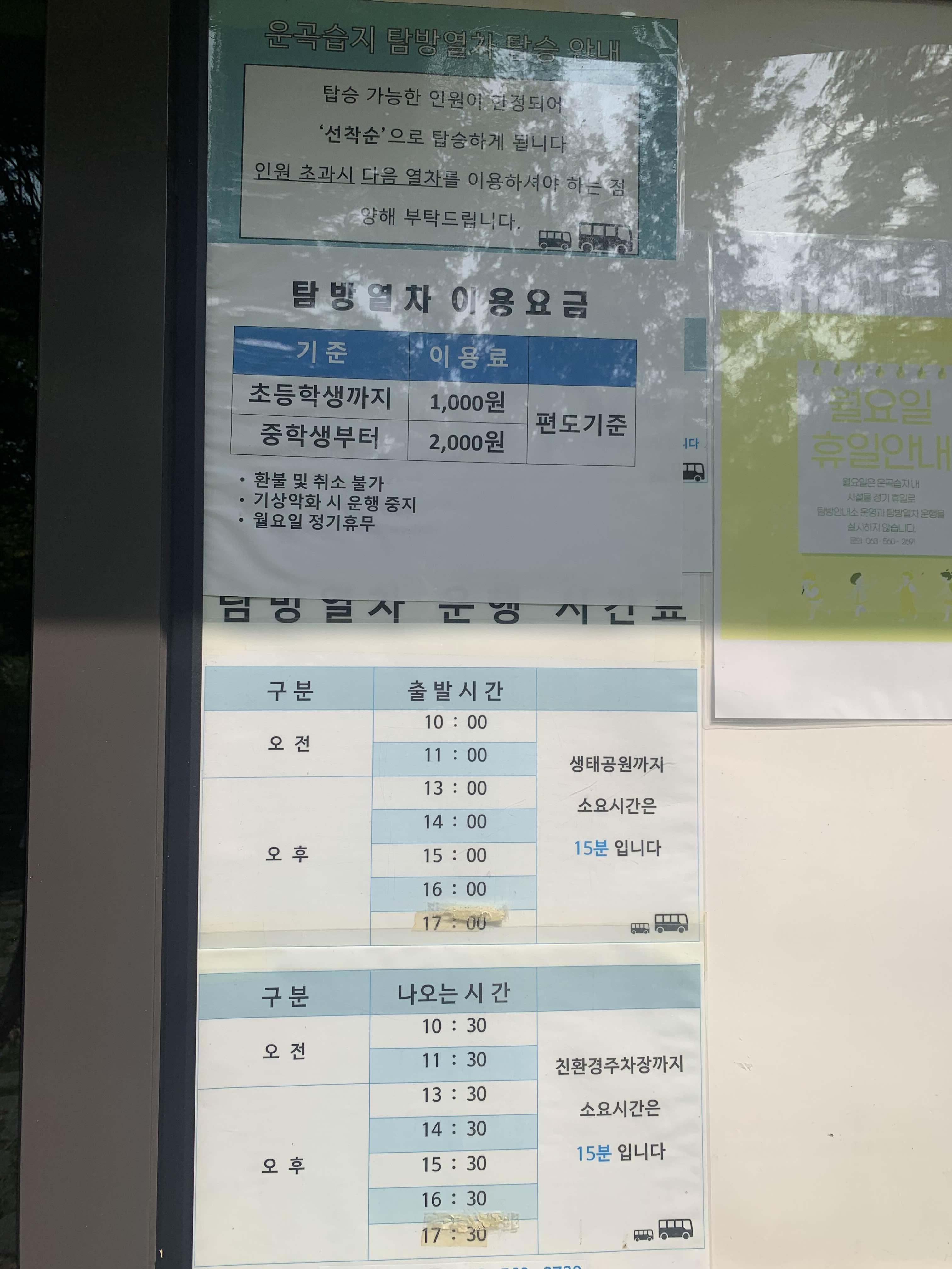 그리고 오전에 2번, 오후에 5번 운행합니다. 가격은 초등학생 1,000원이고 성인은 2,000원입니다.