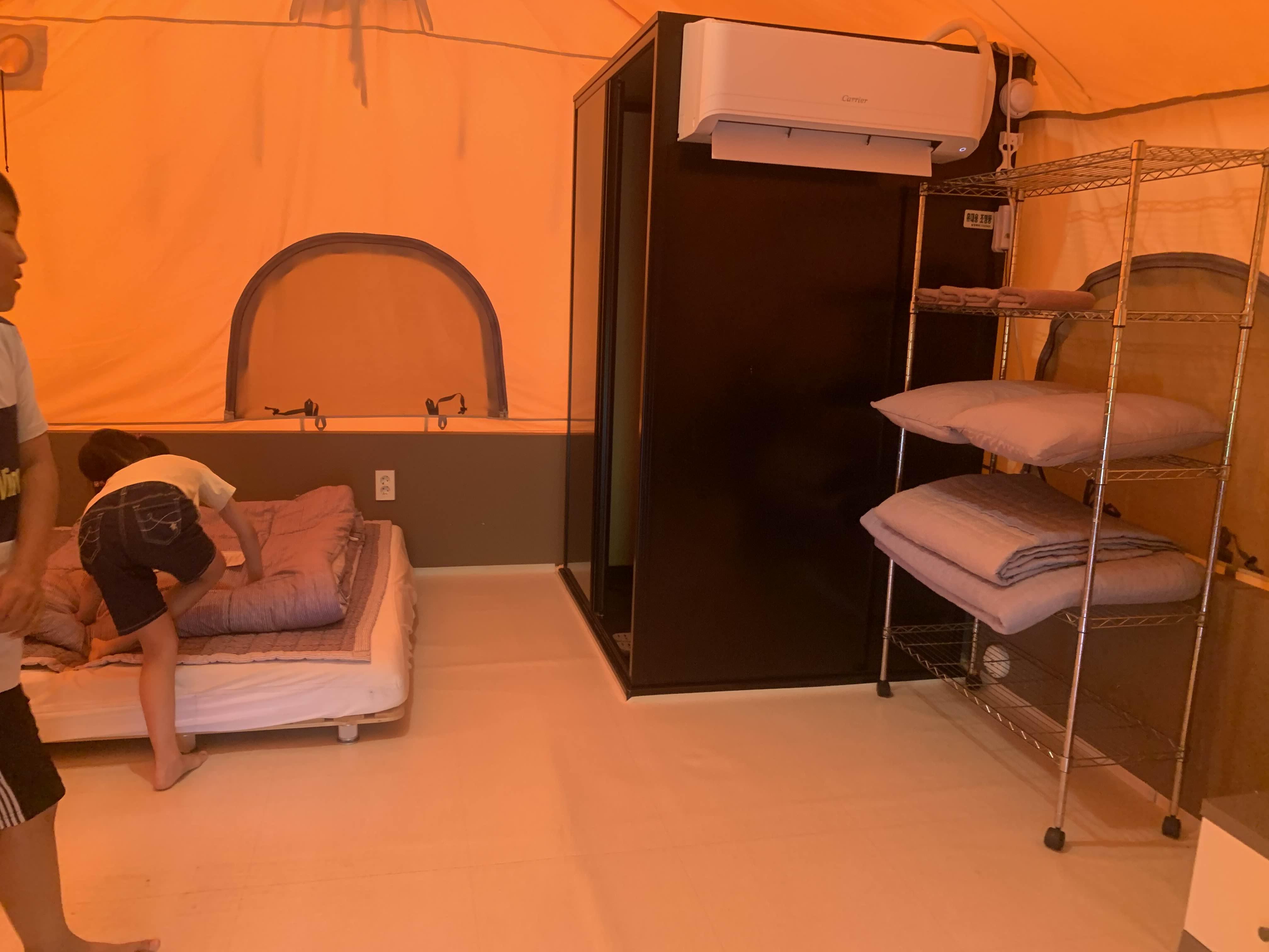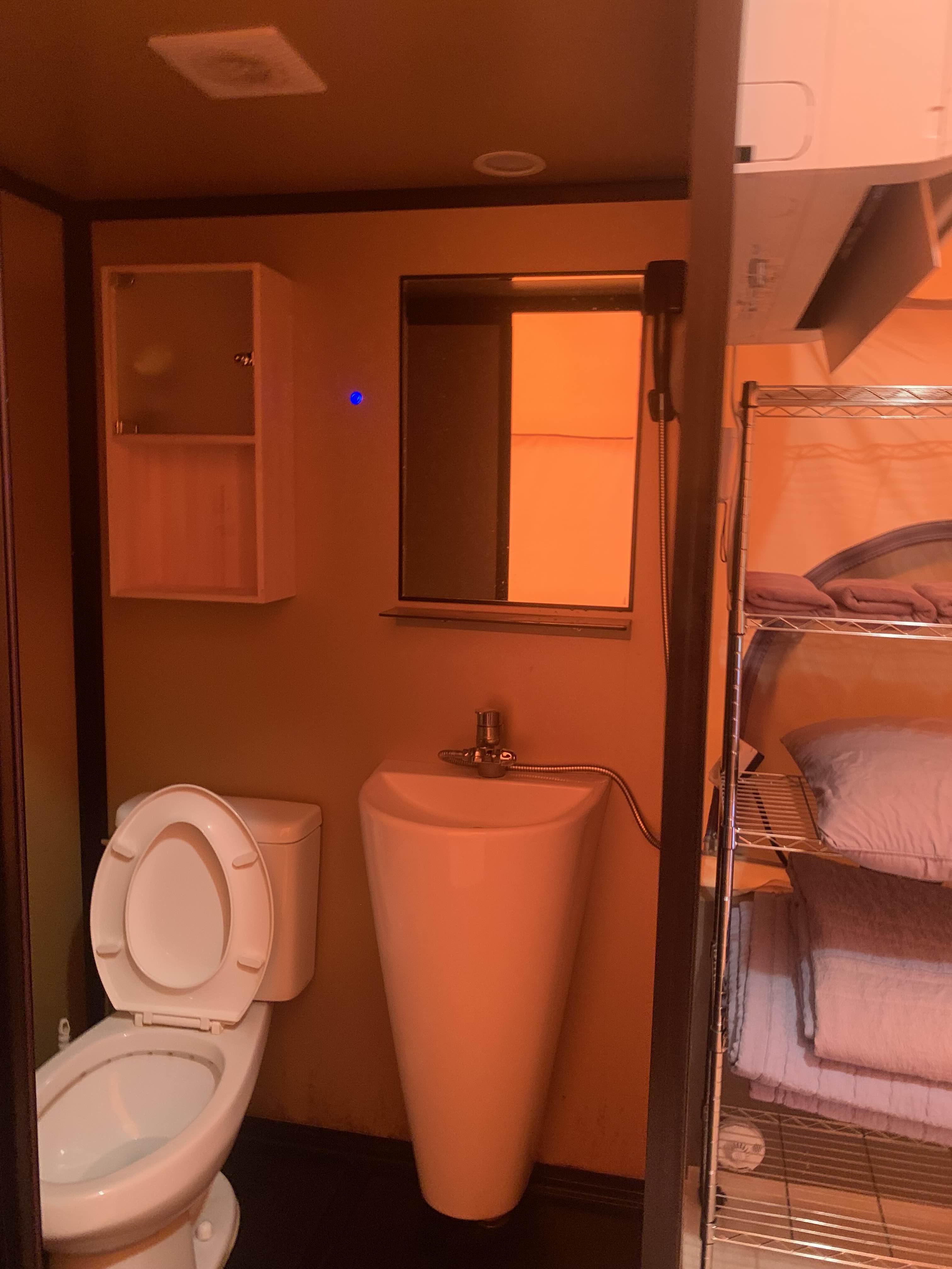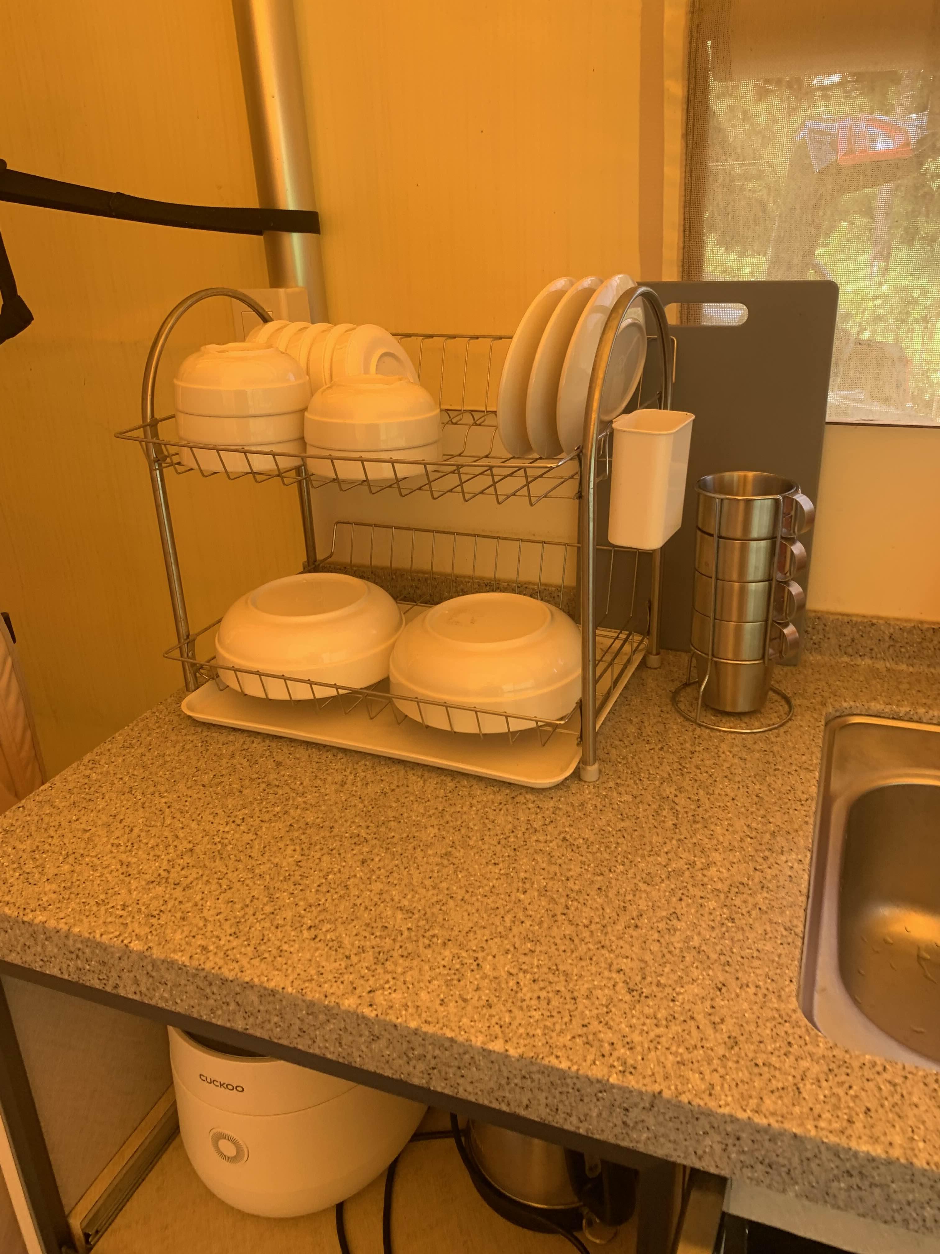 화장실은 텐트 내부에 설치되어 있어서.... 다른 글램핑보다는 상당히 작은 사이즈입니다. 혼자 샤워하는 데는 큰 문제는 없지만.... 아이의 샤워를 시켜 워야 할 나이면.... 상당한 불편함이;;;