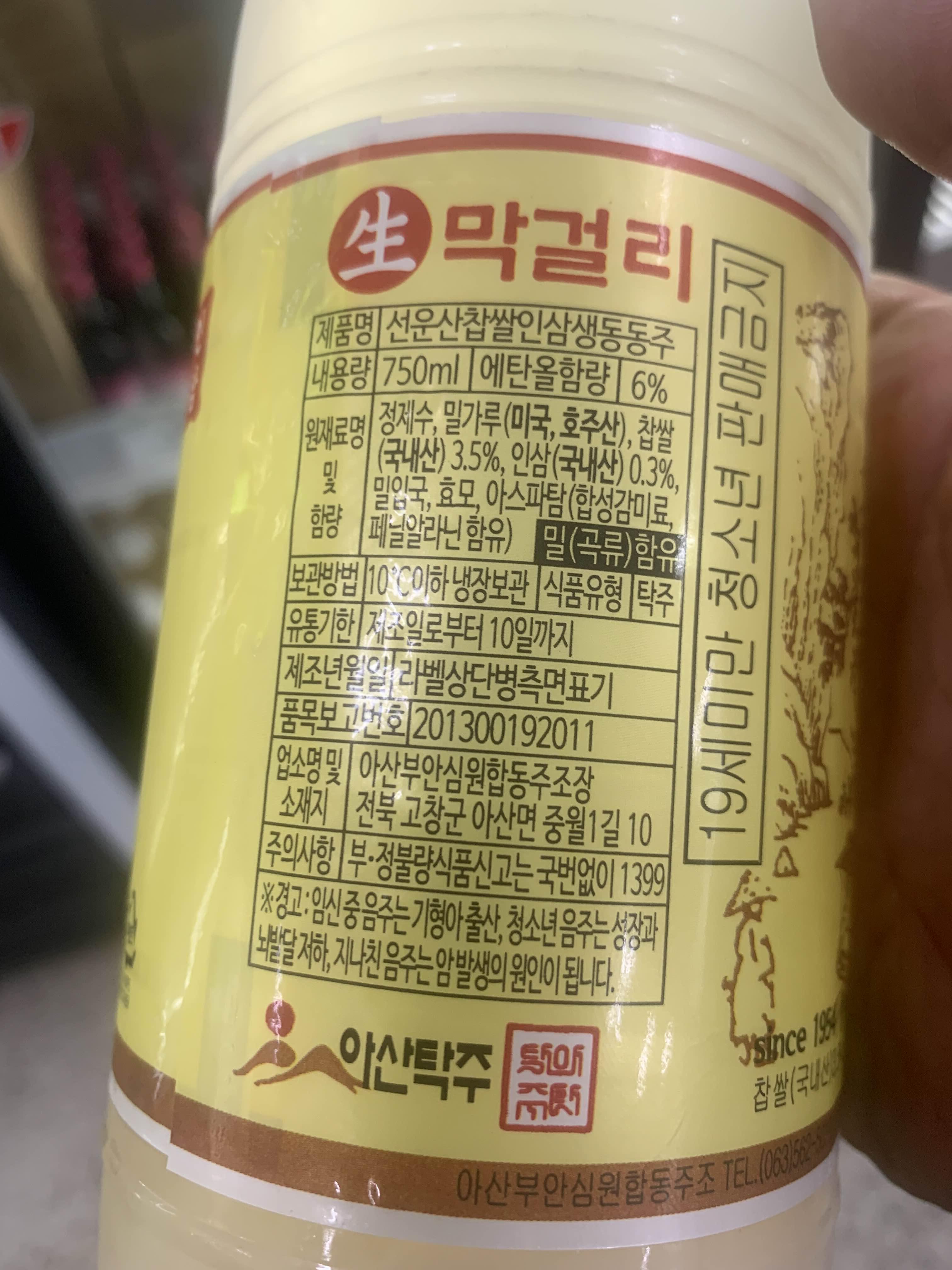 인삼이나 다른 향이 들어가는 막걸리는 그리 좋아하지는 않는데... 막걸리가 이 막걸리 밖에 없어서 한병 구입!