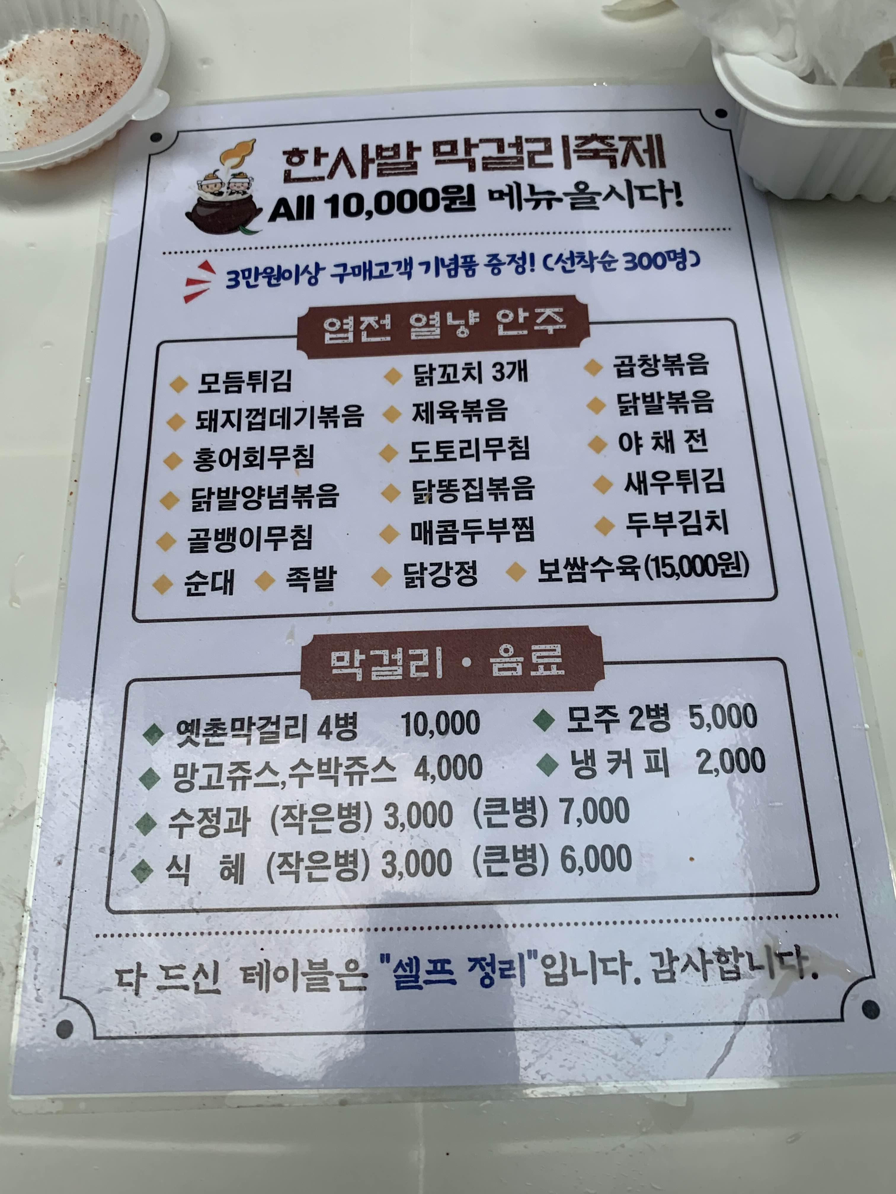 대부분의 메뉴는 1만 원에 구성되어 있고, 막걸리는..... 4병 만원에 판매하고 있다. 막걸리가 왜 이리 비싸지?