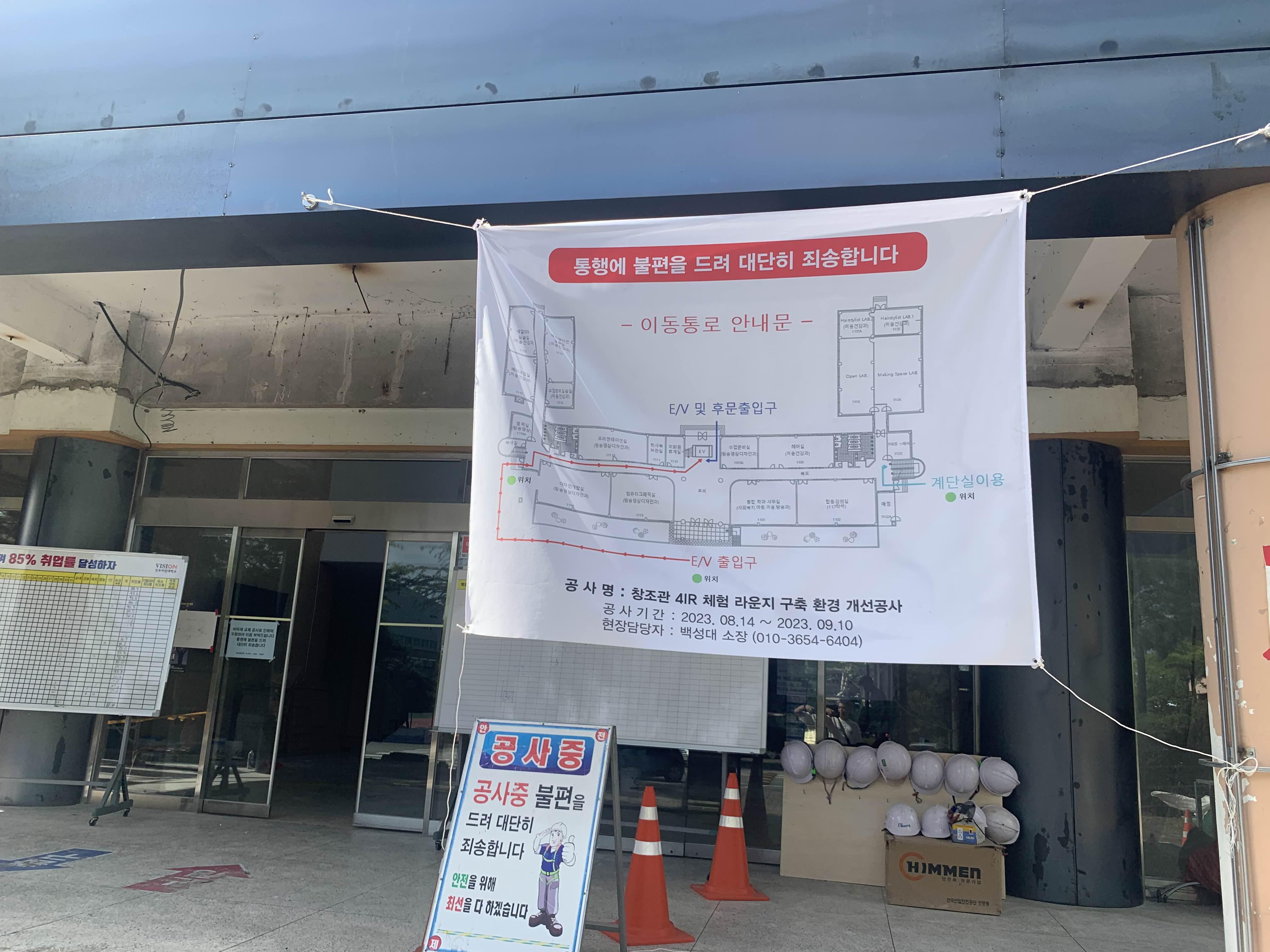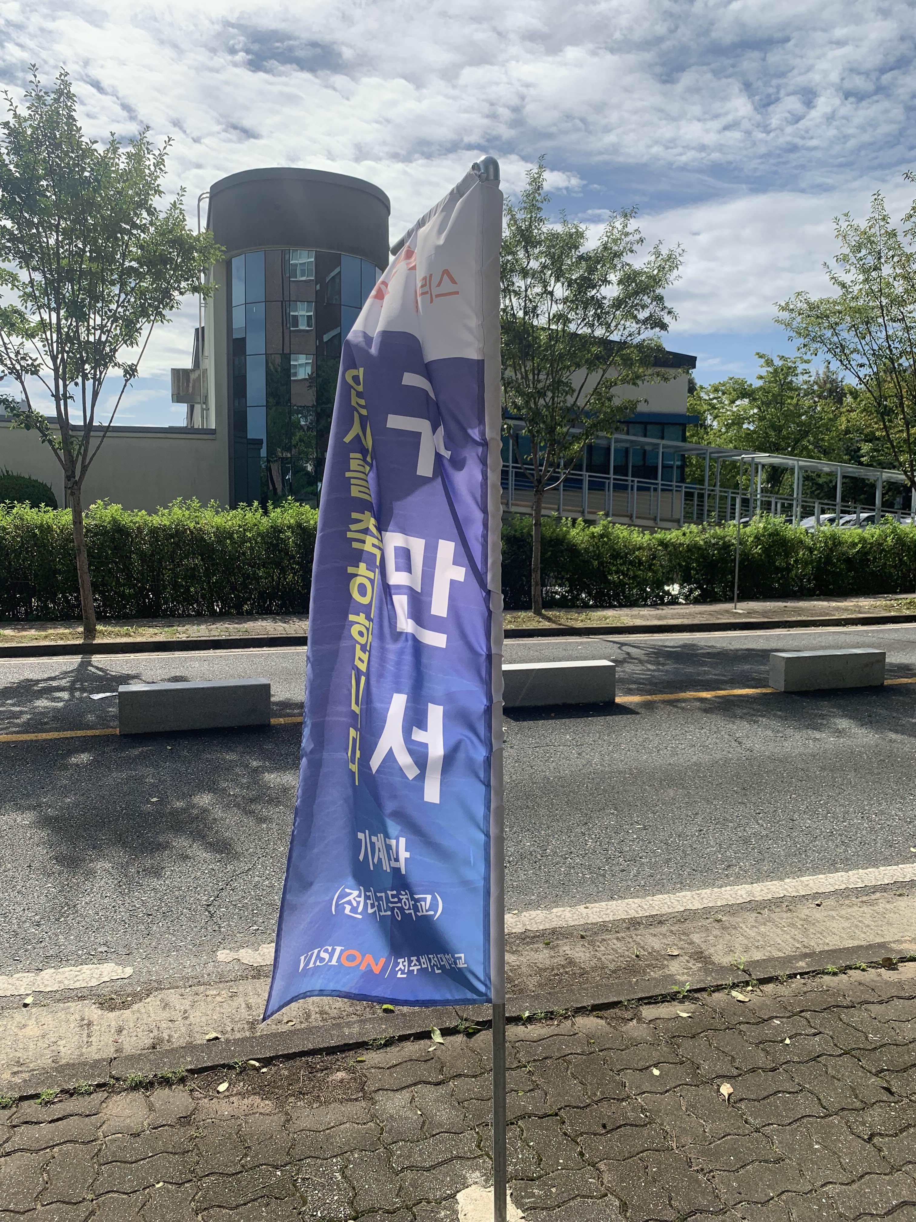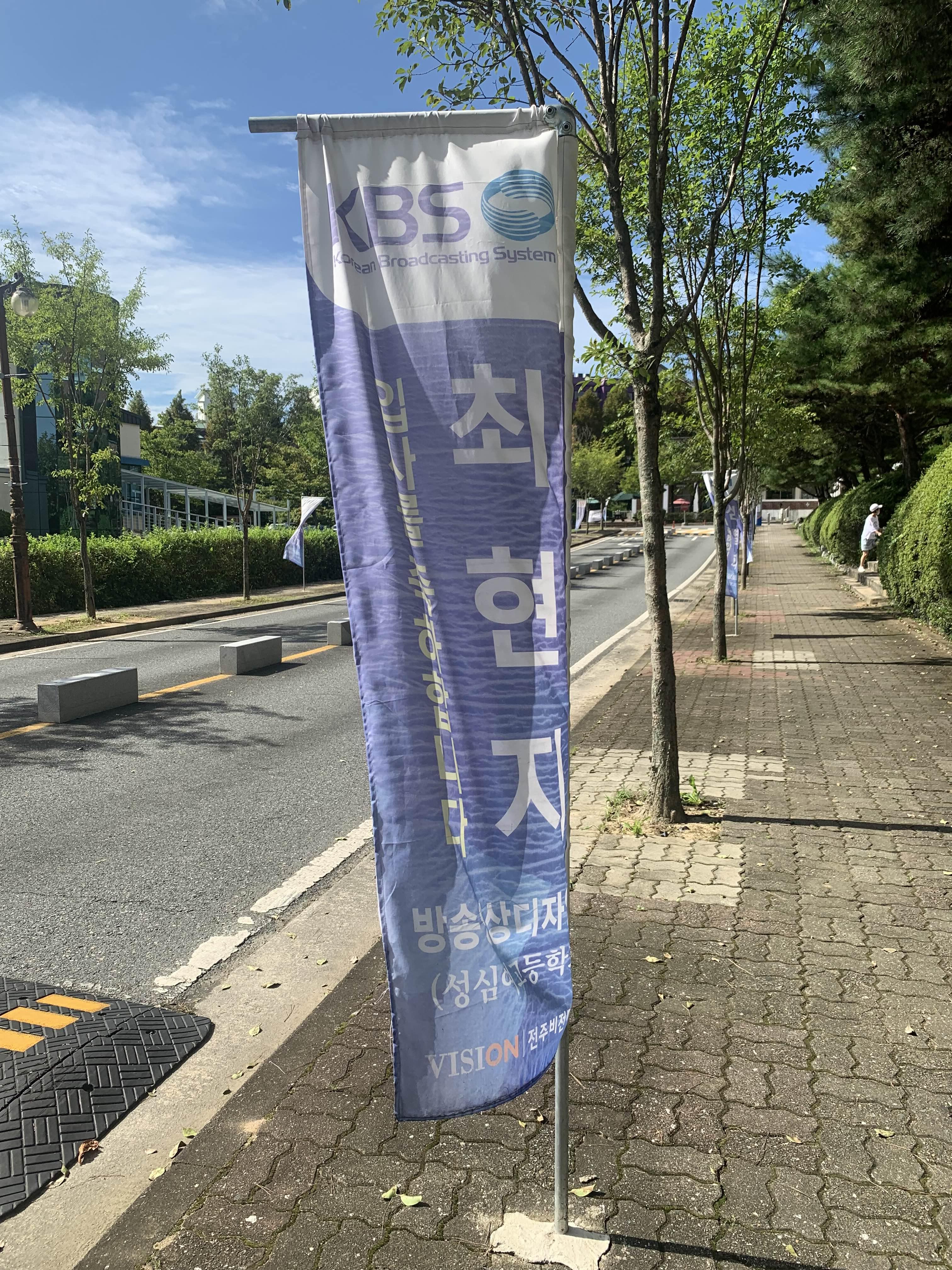 고사장 학교의 주변에는 채용을 축하한다는 안내가 보인다.