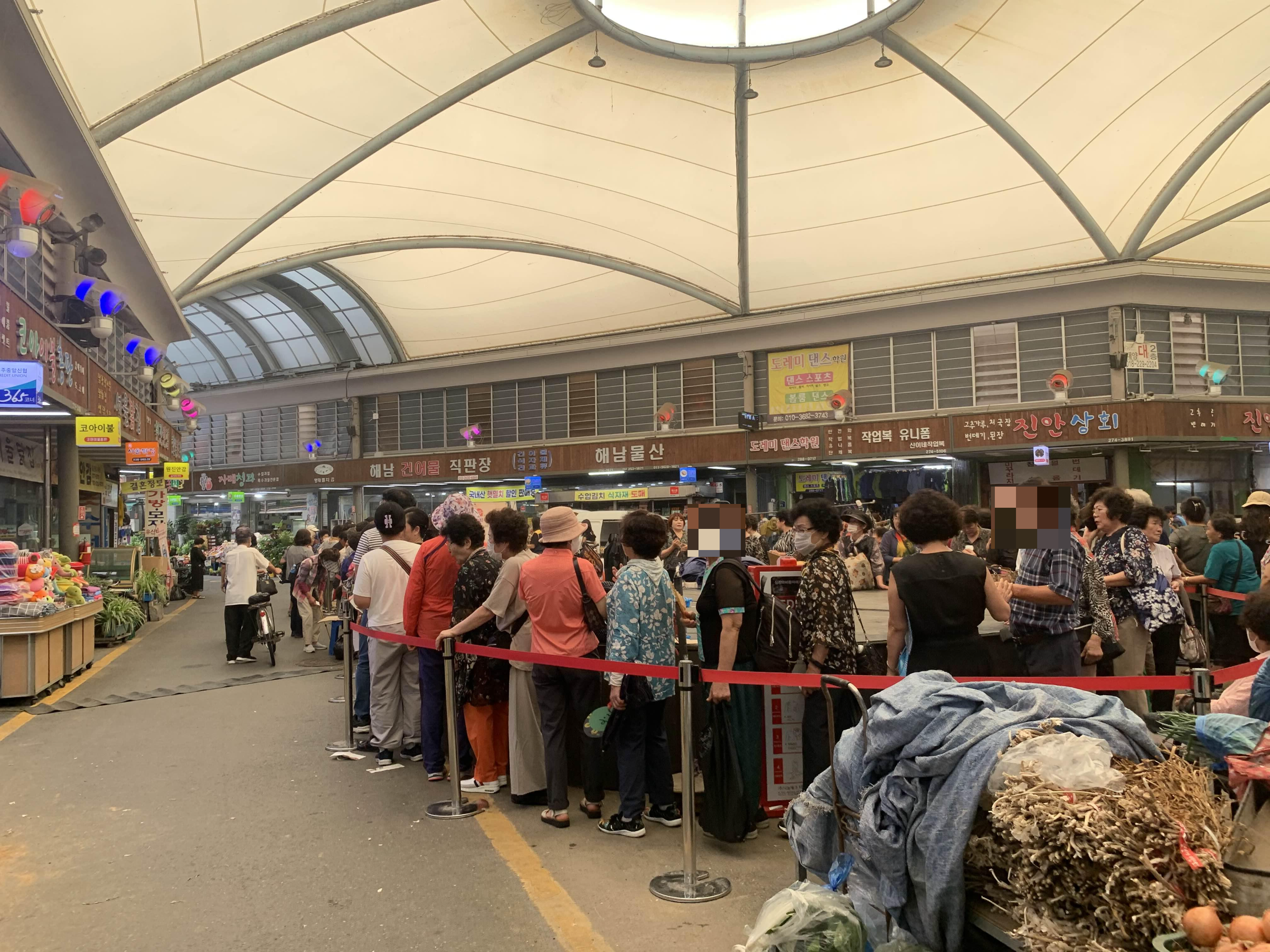 시장에 많은 사람들이 대기줄이 보인다.