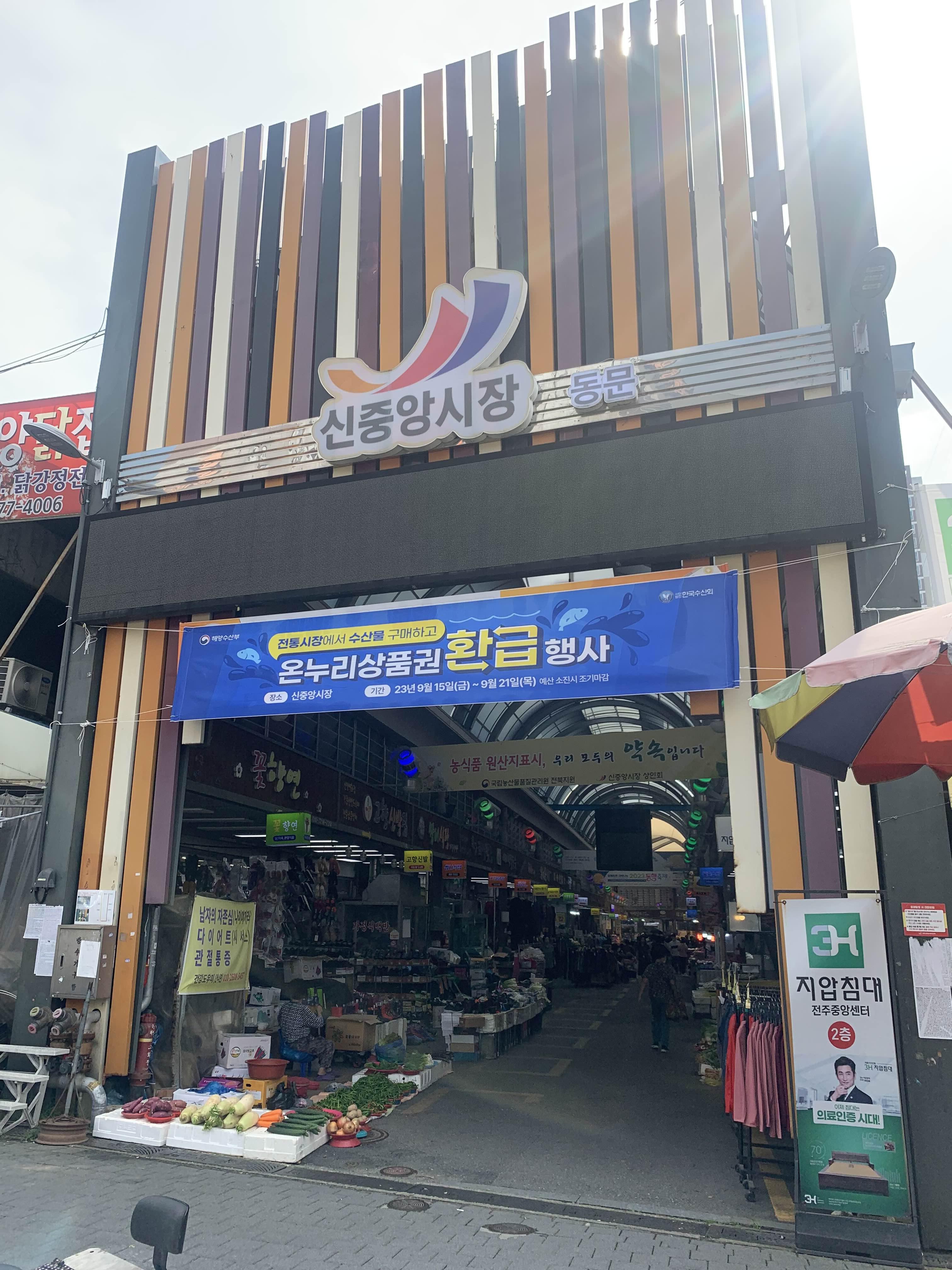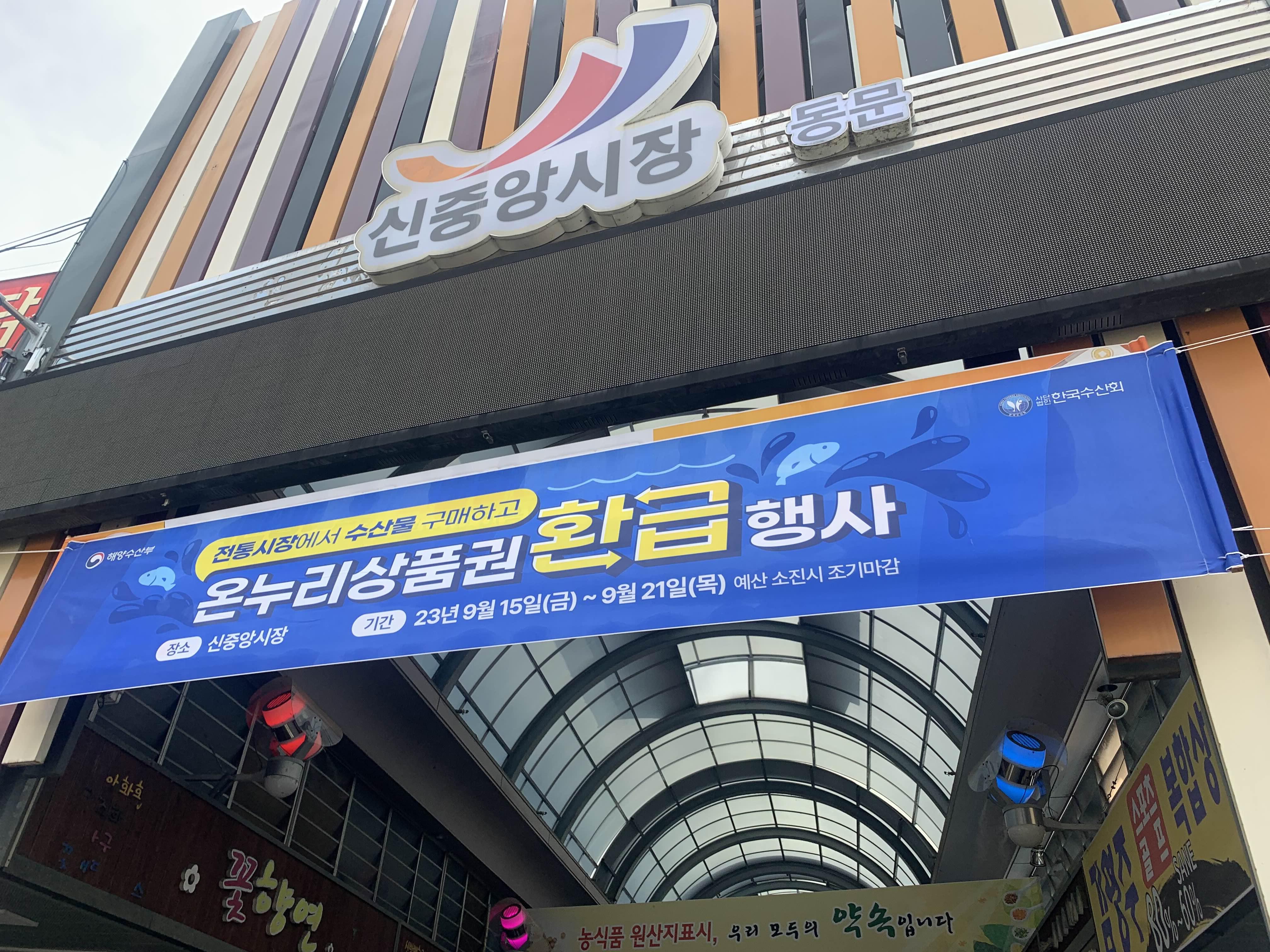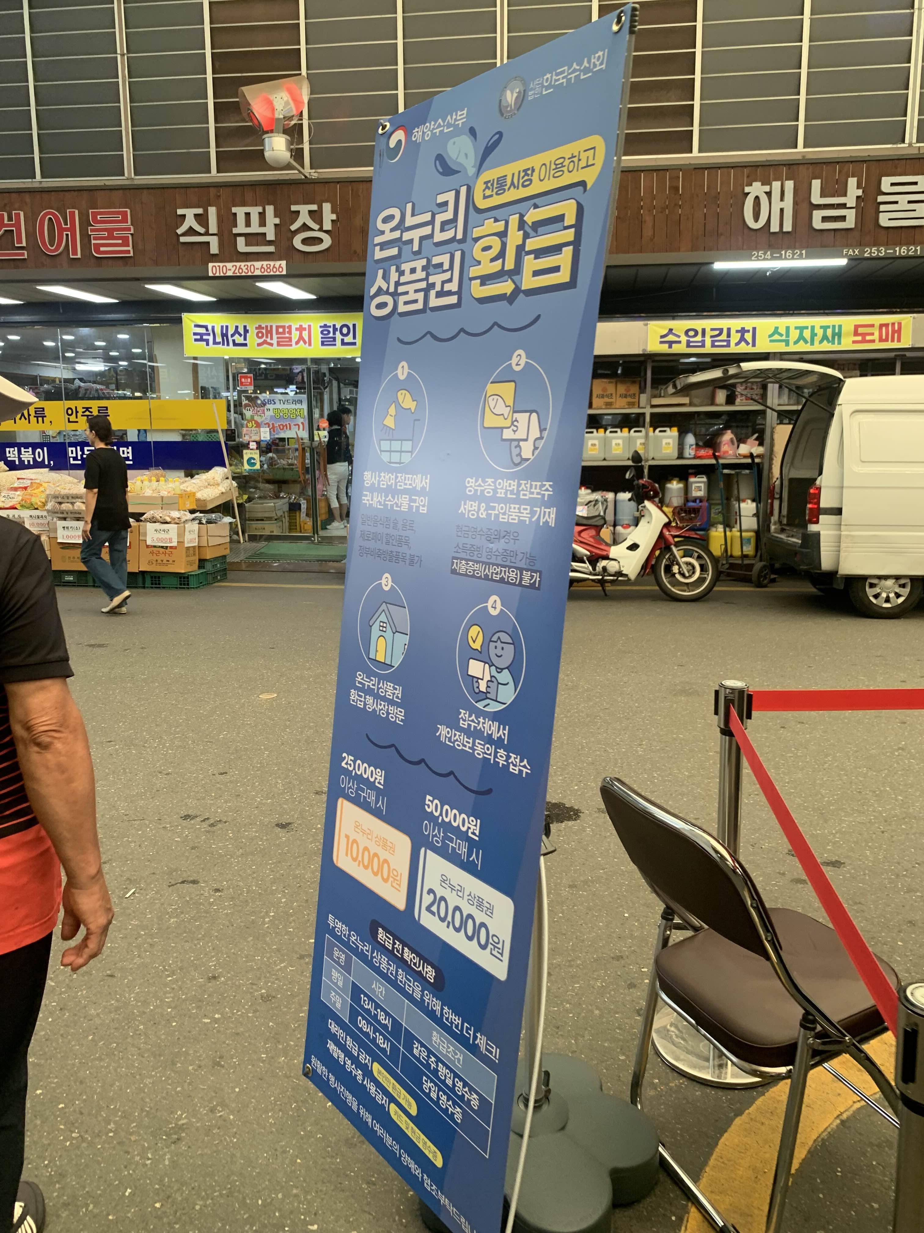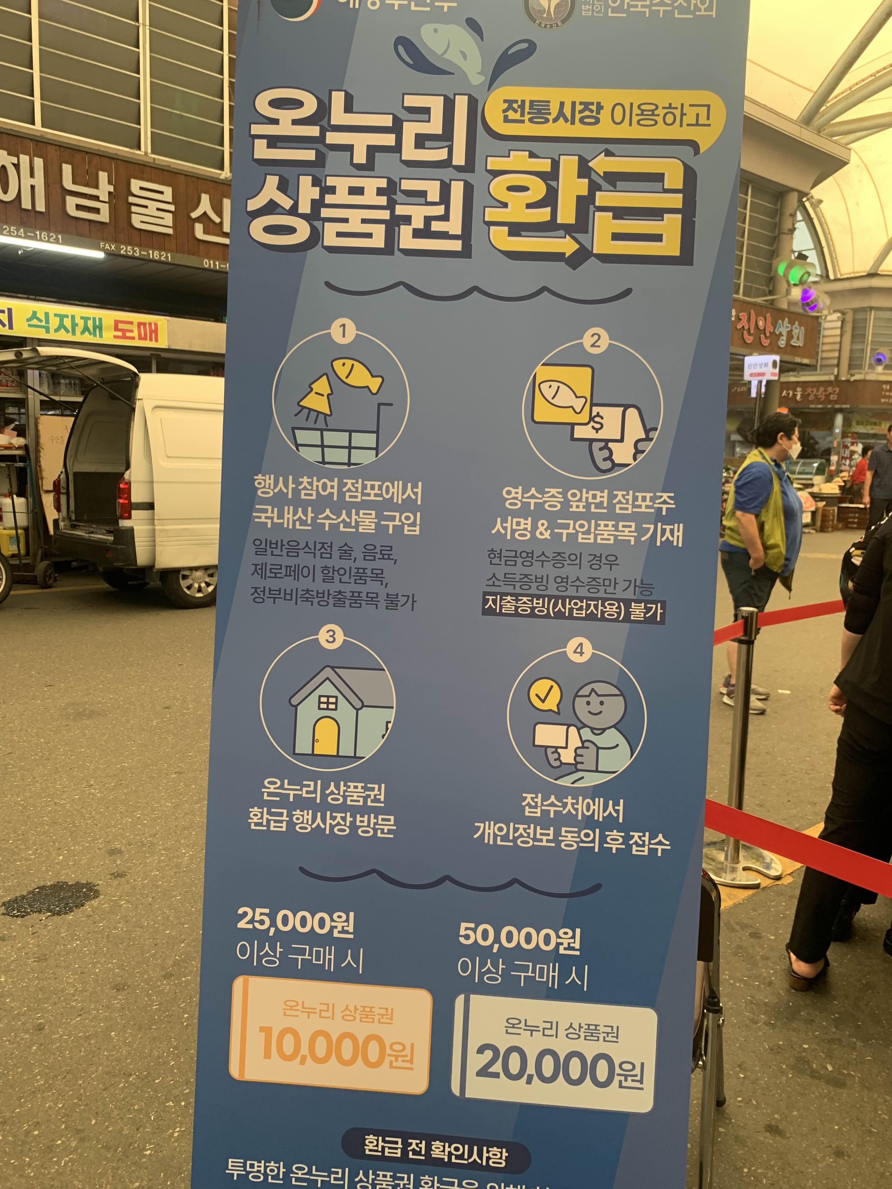 시장에서 수산물을 구입하면 온누리상품권으로 환급해 주는 이벤트를 진행하고 있었다.