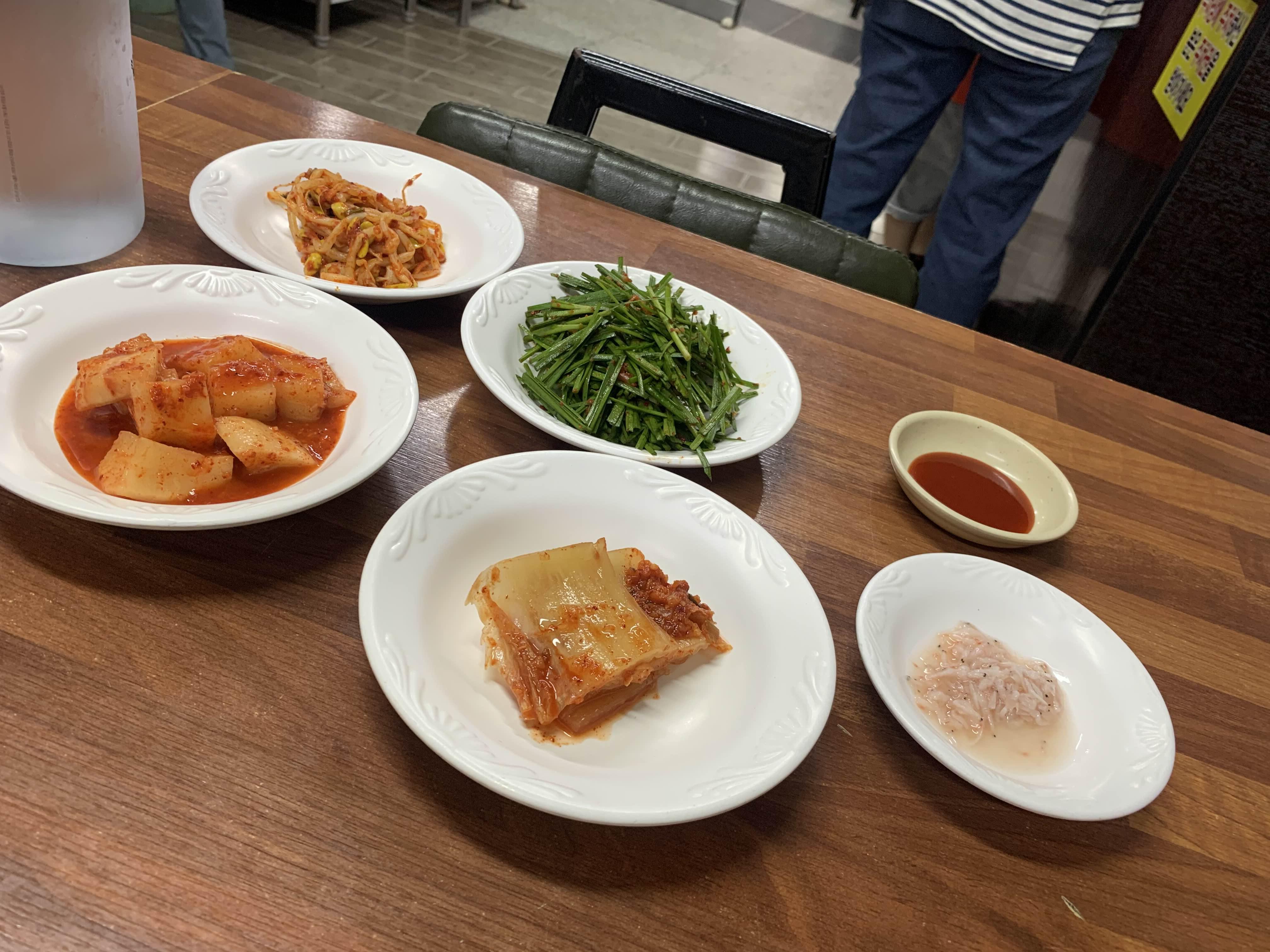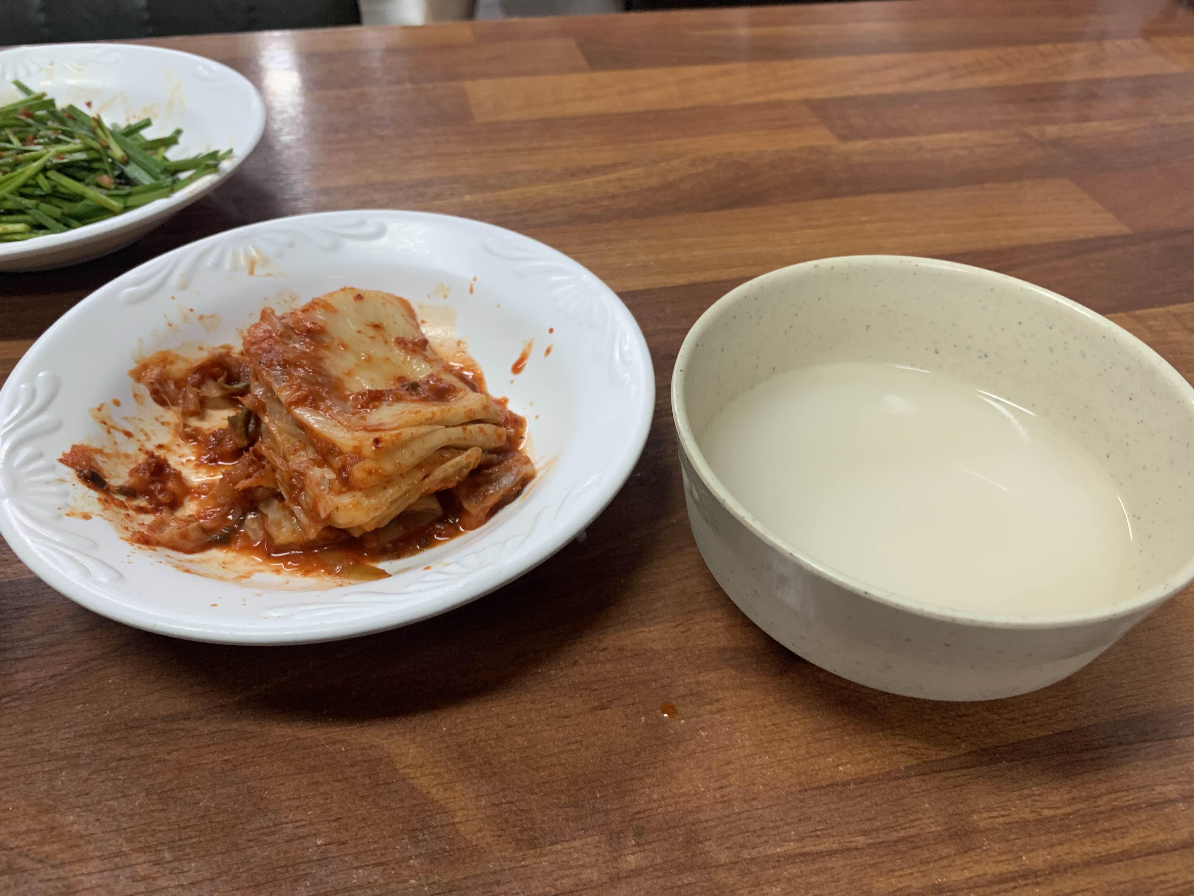음식을 주문하면... 밑반찬으로.. 배추김치, 깍두기, 콩나물무침과 부추가 나옵니다.